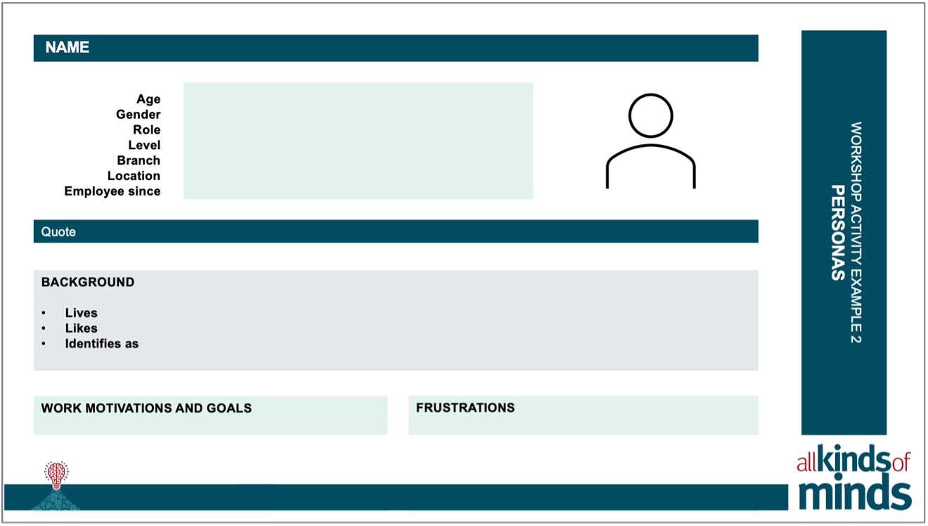 Each co-design workshop represented different end user groups to enable a rich exploration of stakeholder perspectives without the interference of potential power dynamics across different levels of seniority. The workshop series were bookended with the neurodiverse participant groups. This positioned neurodiverse employees as the primary end users of the service and provided opportunities for their voices to meaningfully influence the course of the workshop series.