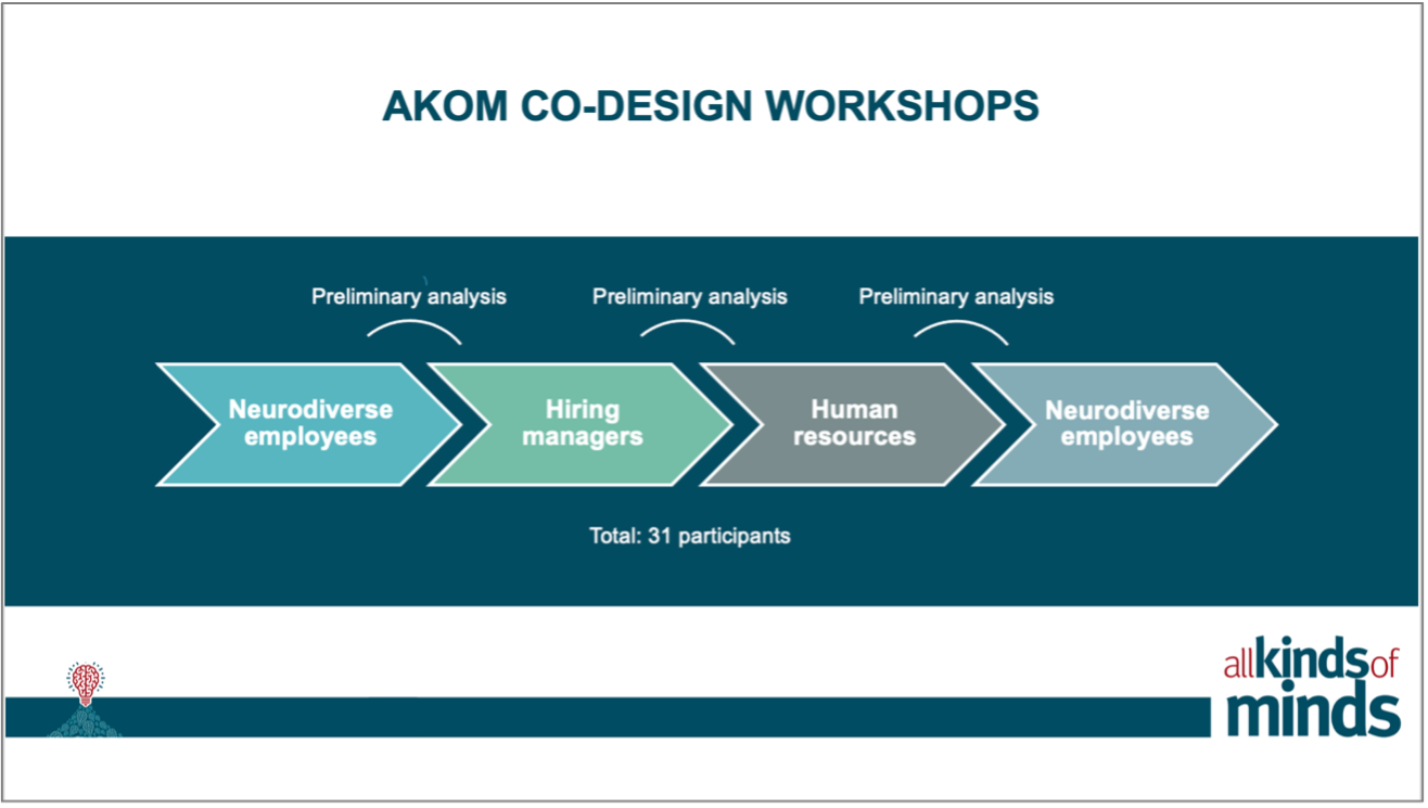For meaningful end user engagement, AKOM used an iterative process to include multiple end user groups: neurodiverse employees, human resources personnel (HR partners, occupational health and safety, recruitment etc.) hiring managers and team members. Engagement methods included surveys, interviews, reflective practice and a series of virtual co-design workshops. AKOM used iterative methods to include multiple stakeholder groups within several design phases, with each phase incorporating previous findings. Thus, end user groups were able to understand and shape the process and progress of service design.