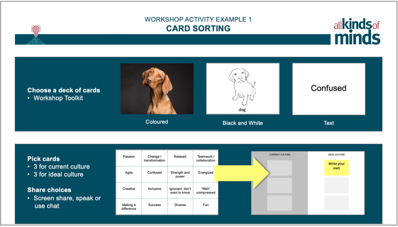 AKOM sought to understand the needs and values of multiple stakeholder groups across multiple roles, seniority levels, geographical locations and neurodiversity representation, whilst complying with COVID restrictions. The key method of engagement included a series of co-design workshops, where the creative toolkits were co-developed with multiple end user groups to increase their accessibility and usability. To improve user experience, toolkits were iterated between workshops to incorporate participant feedback.