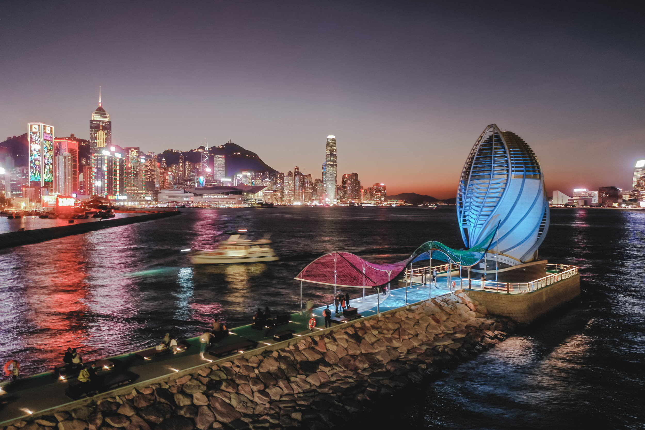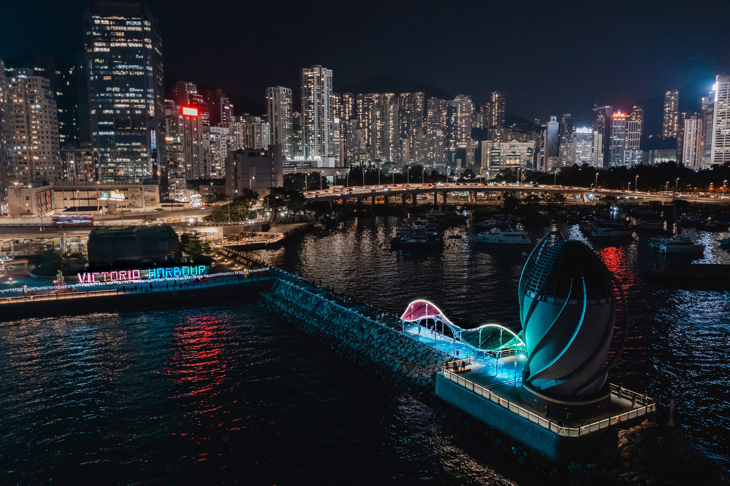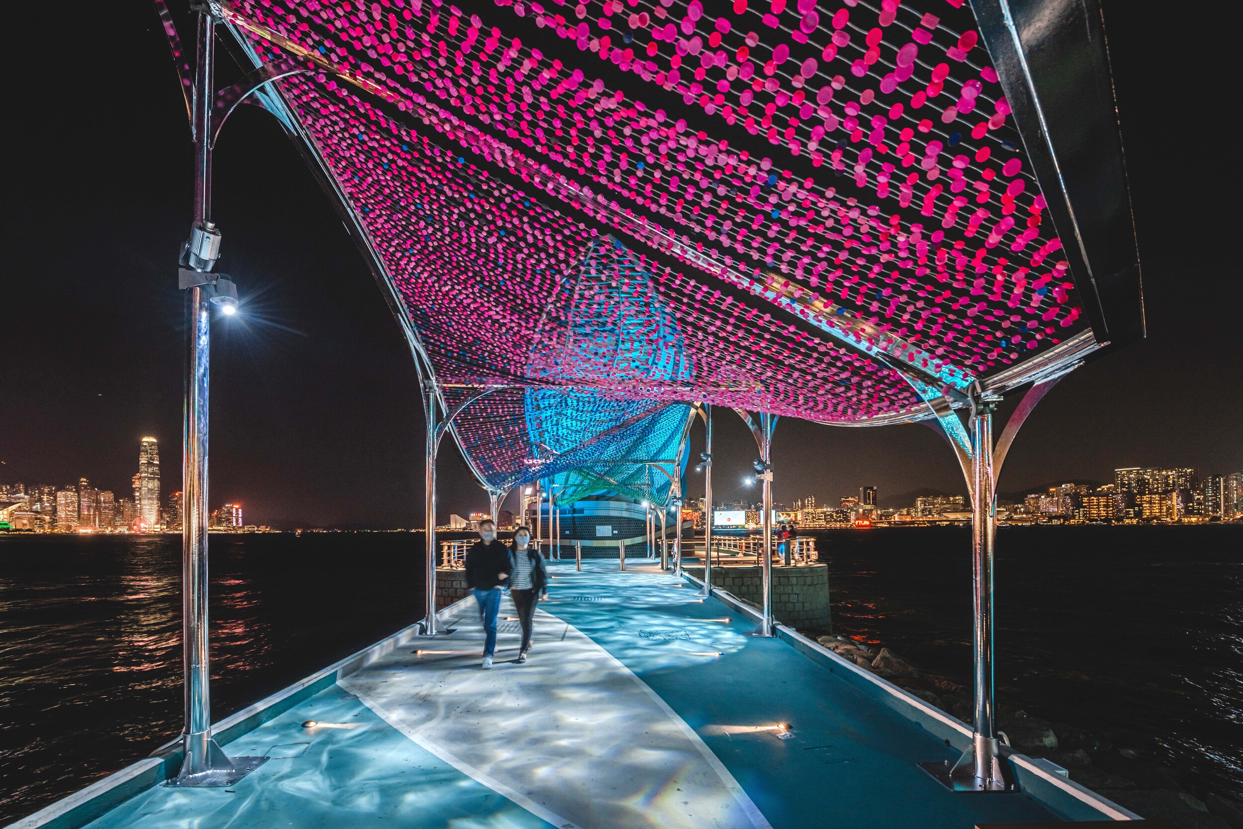 Taking cue from the colours and lights of Victoria Harbour, the Breakwater Pavilion extends from the Word Art, inviting people to enjoy the sights and sounds of the harbour. The roofscape of the pavilion is composed of over 30,000 colourful plastic bottle caps to demonstrate that beautiful art can be made from recycled materials. At night, the installation takes on a new life with an ever-changing lighting design that encourages visitors to immerse within a surreal tapestry of colour and motion that takes the users into another dimension and away from the intensity of city life.