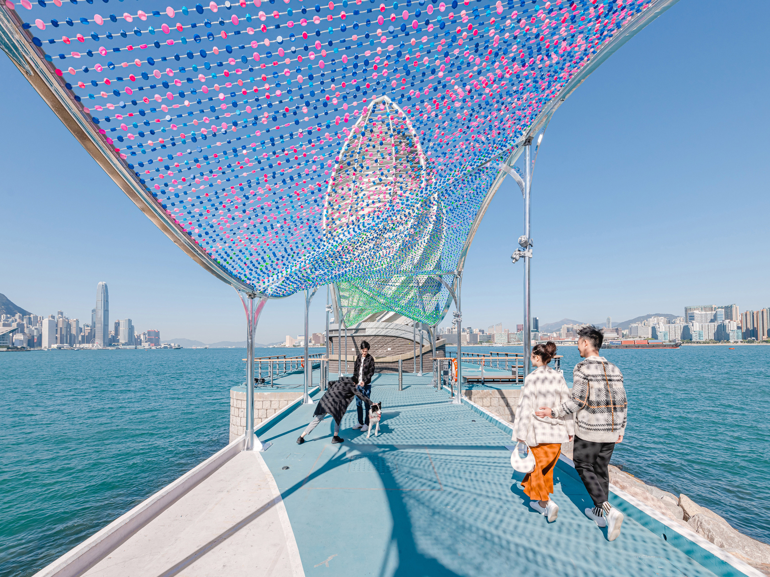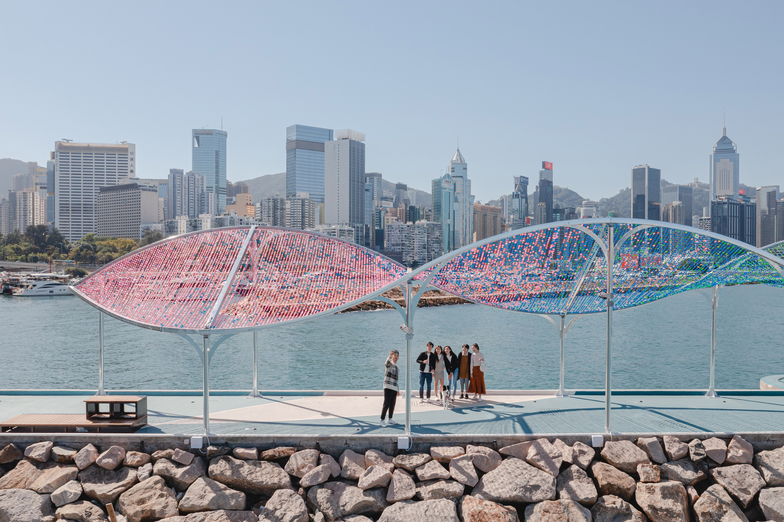 Sustainability is at the heart of the design for this engaging public project. The Arts Pavilion is composed of over 30,000 colourful plastic bottle caps to demonstrate that beautiful art can be made from recycled materials. Hong Kong disposes of over 8.3 million plastic bottles on a daily basis - more than 6 times the area of the East Coast Park. The bottle caps are unable to be recycled, and more often than not, end up in landfills or indeed into the harbour, thus destroying the beautiful waterfront of Victoria Harbour. Our design has been important in educating the public on the damage to the environment caused by plastic waste, and to encourage the public to lead a more sustainable lifestyle. After dismantling, the plastic bottle caps are to be upcycled to create colourful and creative artwork through community art programs to further educate the younger generations.
