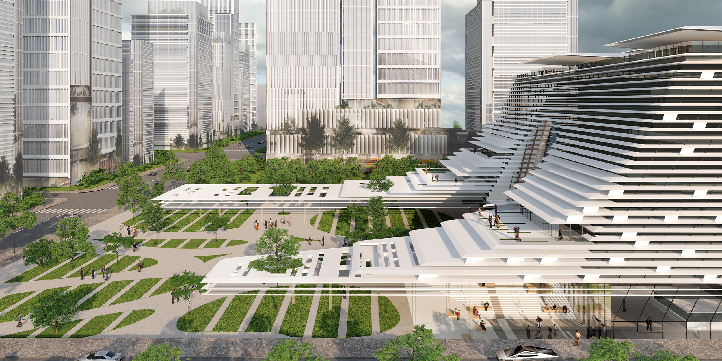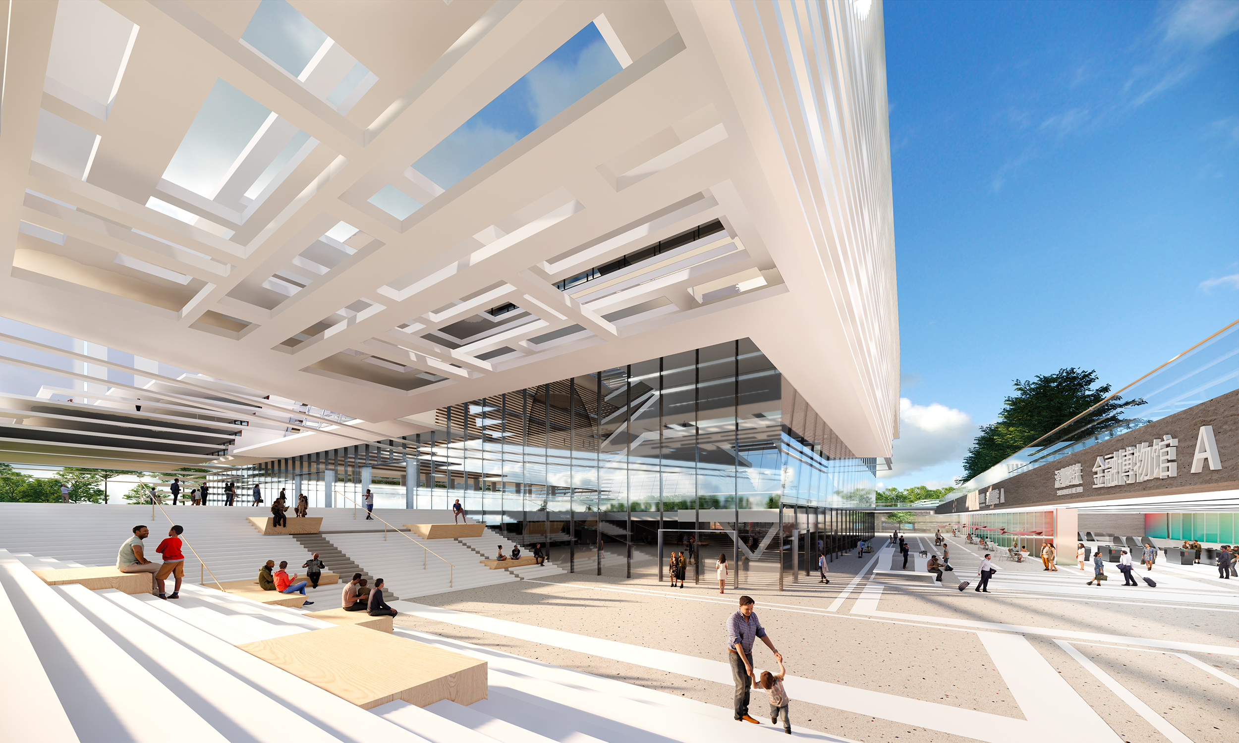 3. The integrated architectural modeling not only brings a sense of ‘rising’, but also provides abundant and interesting gray space for outdoor activities, which certainly improves the quality of the urban life and increase the frequency of use. Therefore, on the weekdays it is a place for people to communicate. It can be transformed into an outdoor bazaar during holidays, symbolizing an extension of financial products.
