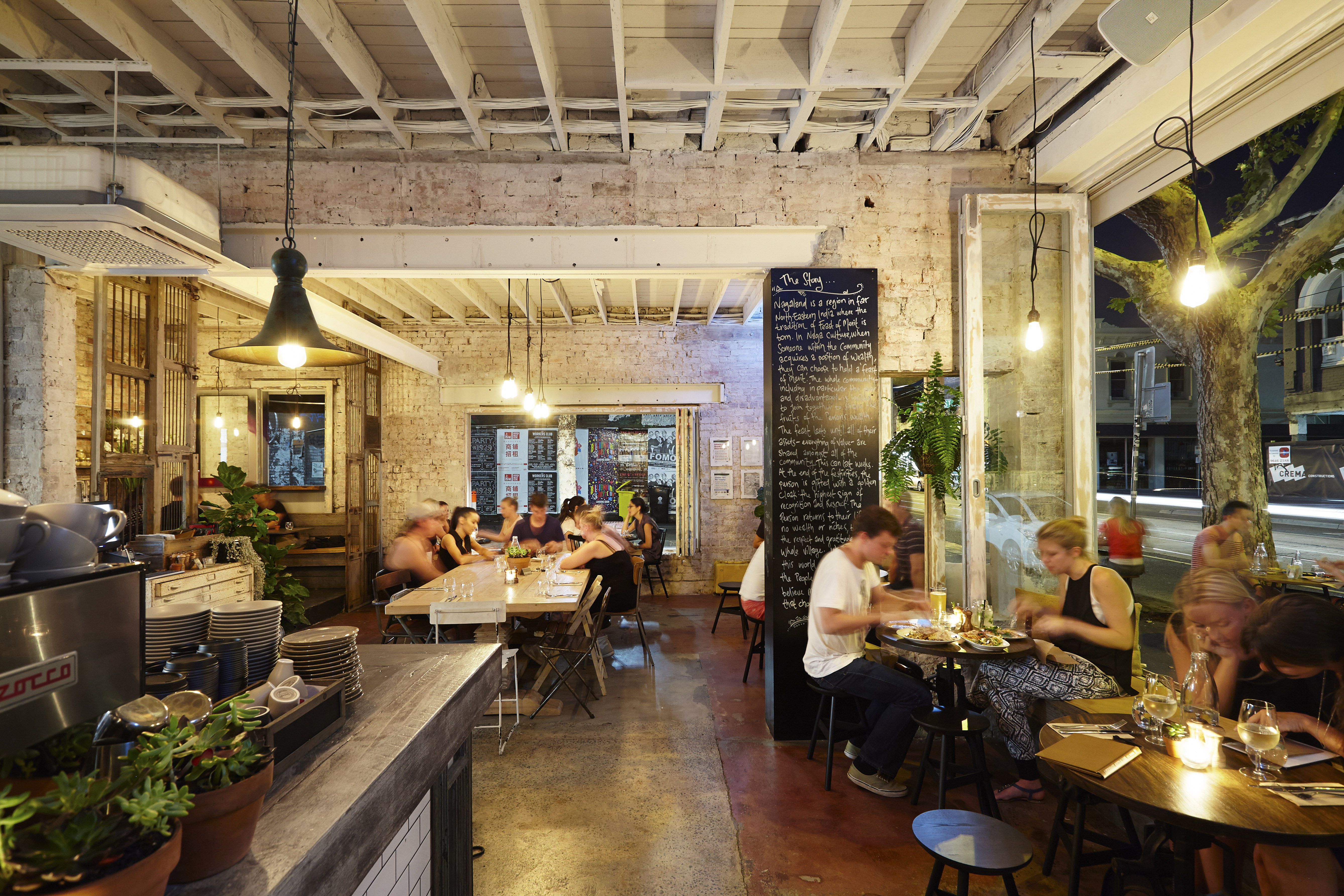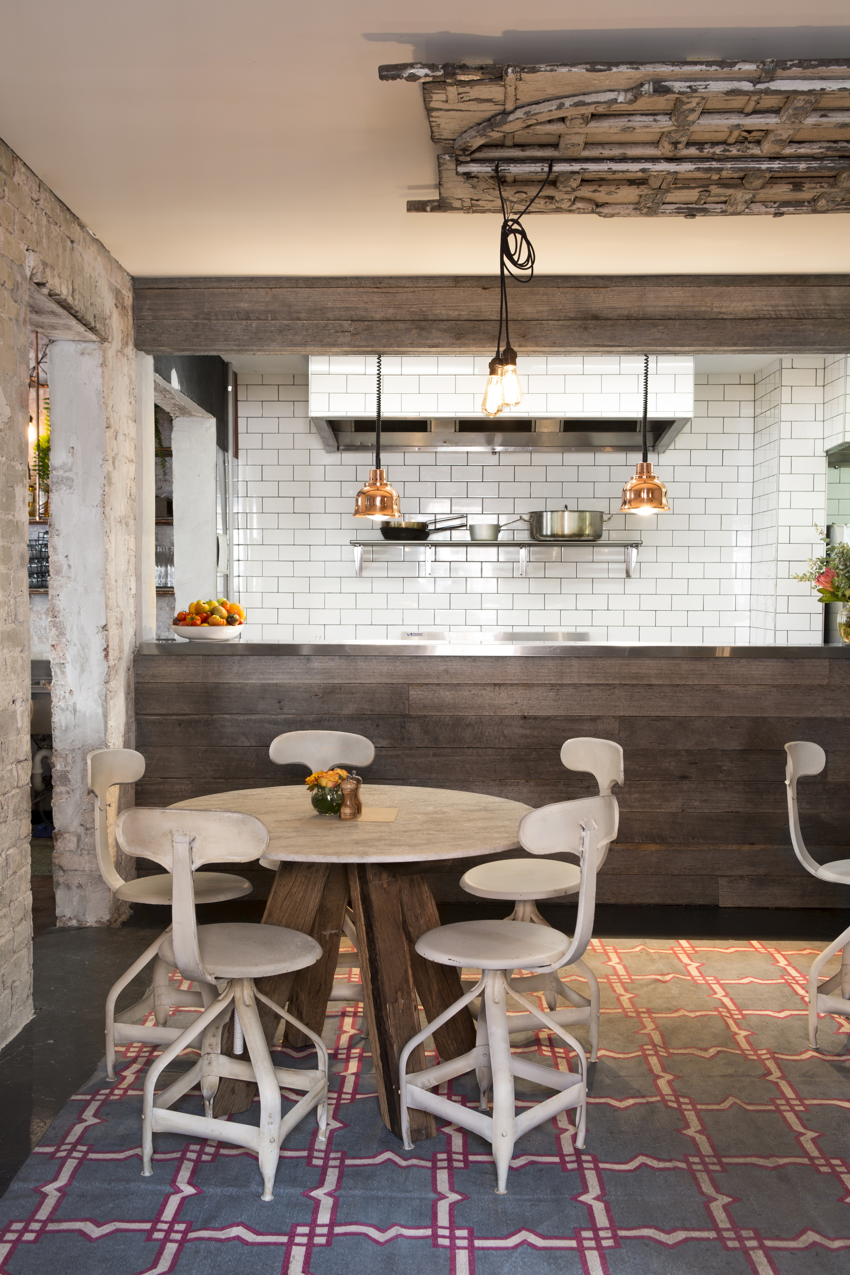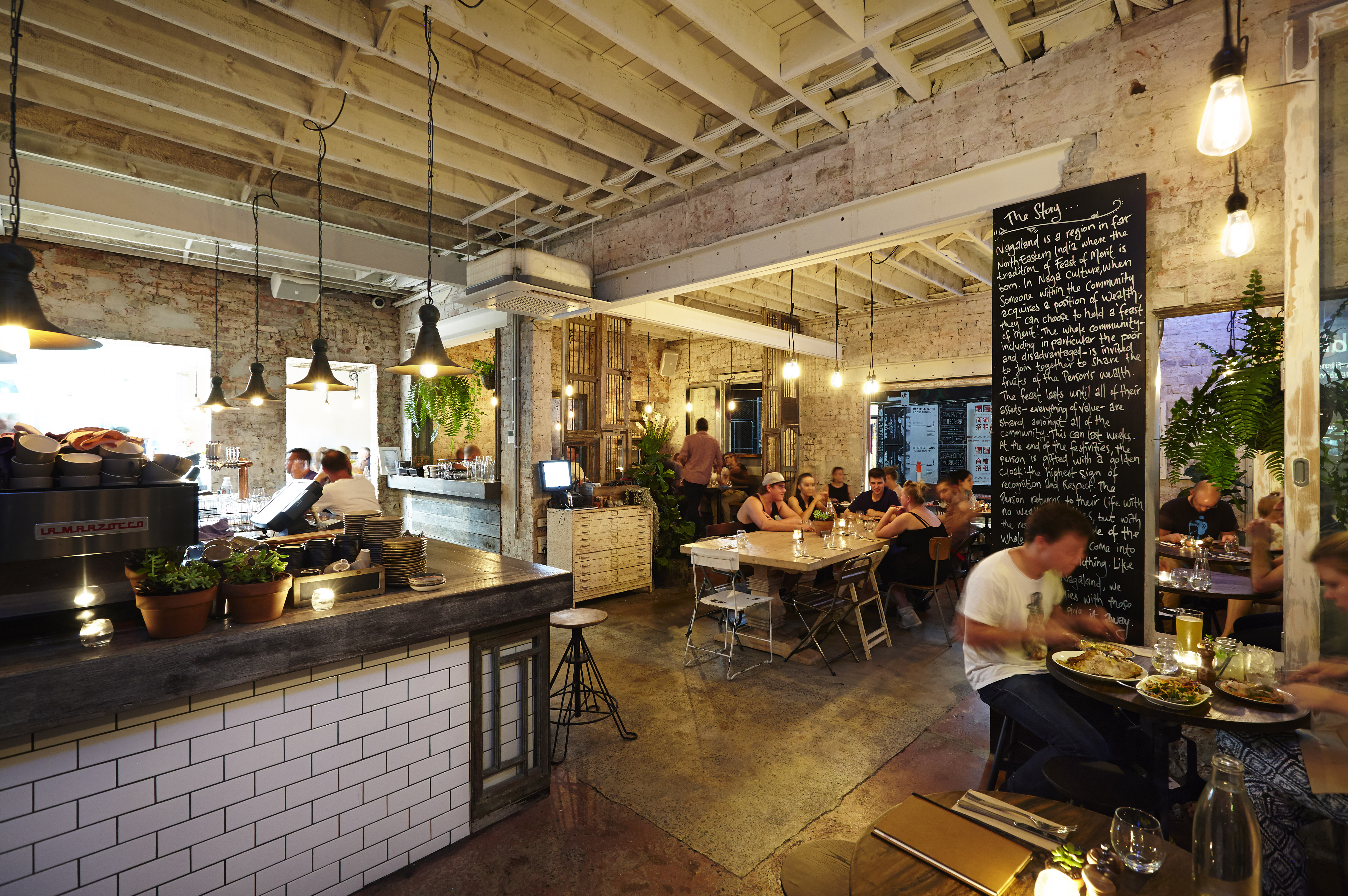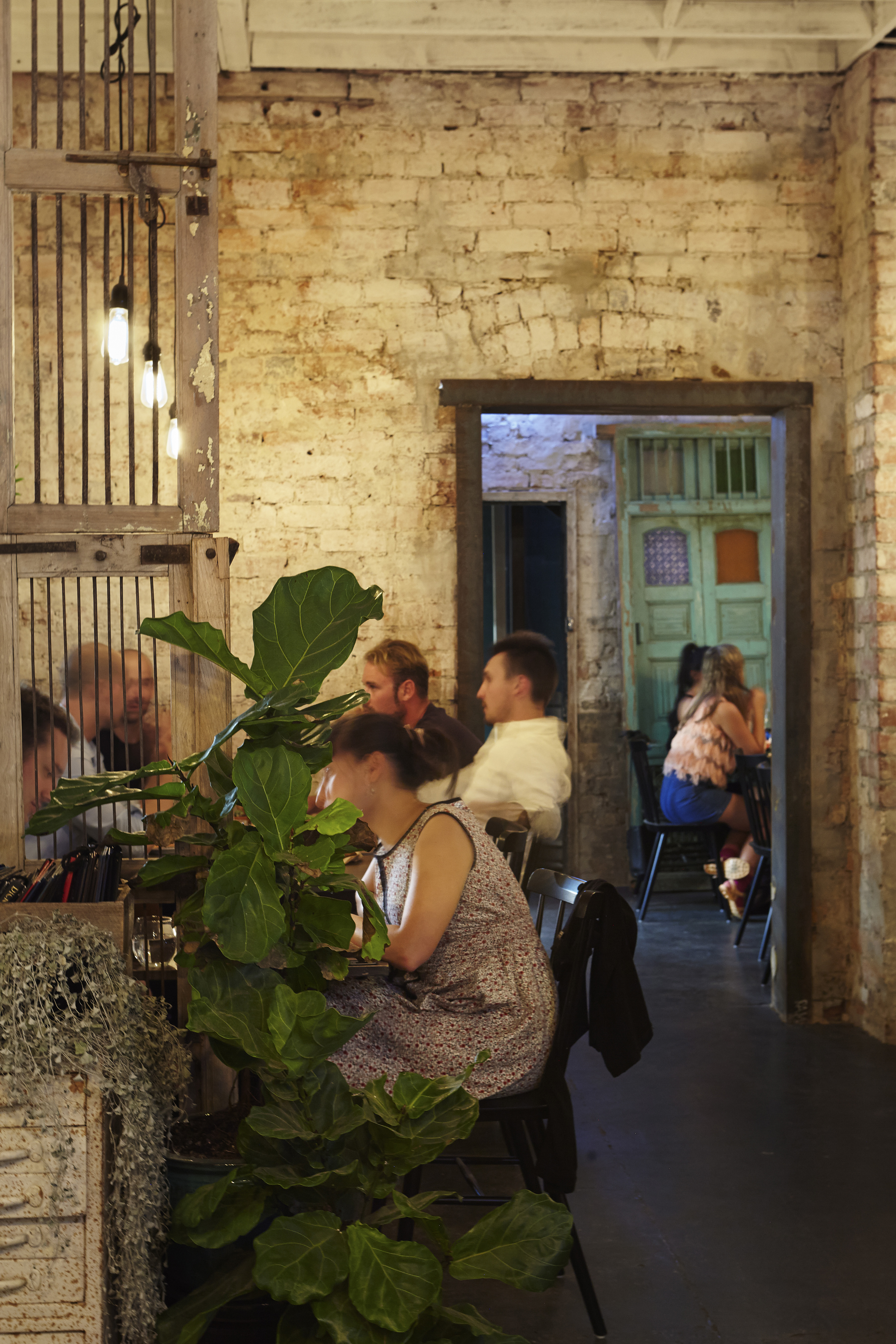 The existing structure was pared back to its original materials; polished concrete floors, exposed red brick walls whitewashed, and exposed timber ceilings. Adding to this, fittings and furniture were all either donated or recycled; timber bar top, reclaimed timber shutters to the bar and screens throughout, and recycled copper piping forming the bar shelving were all sourced locally.