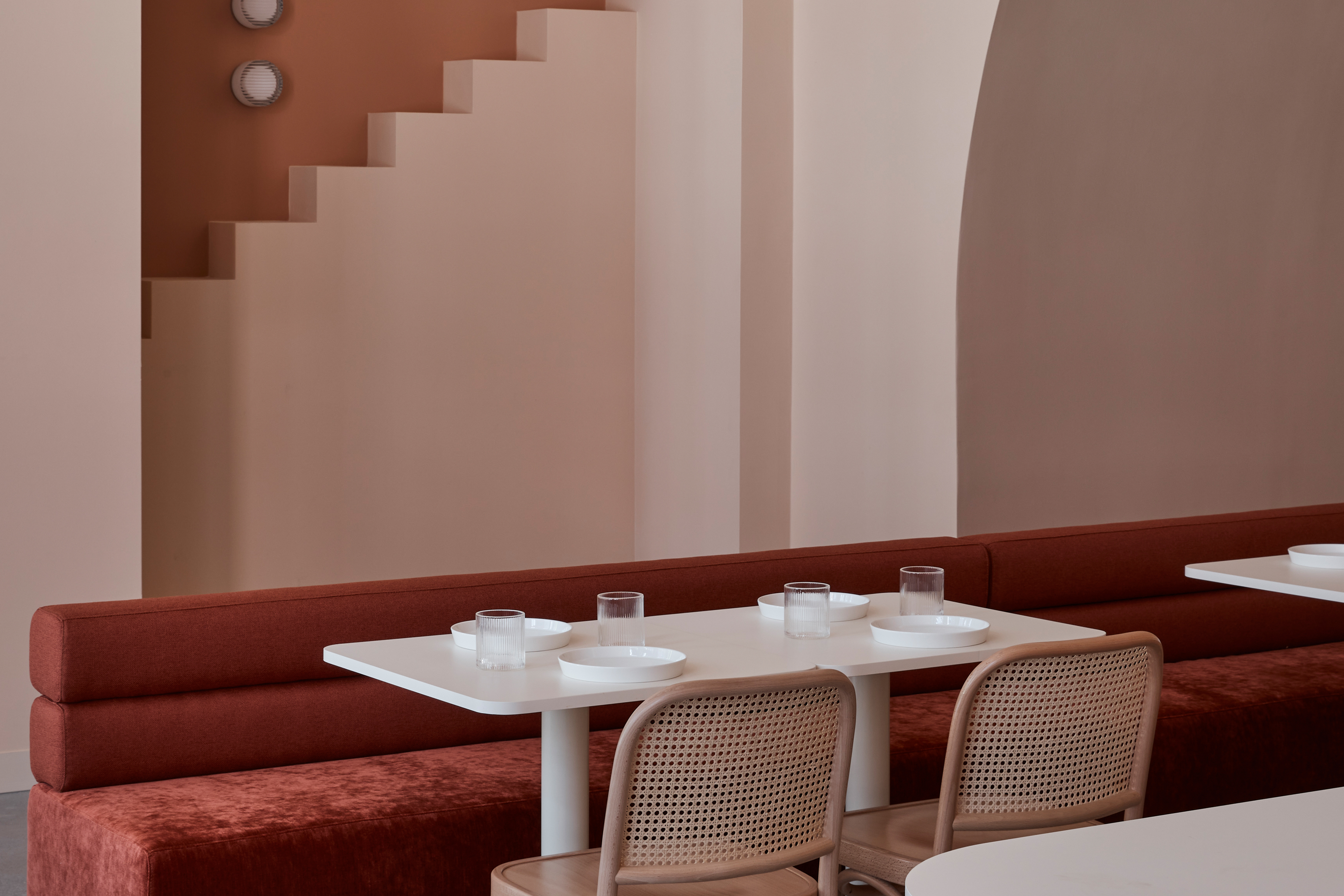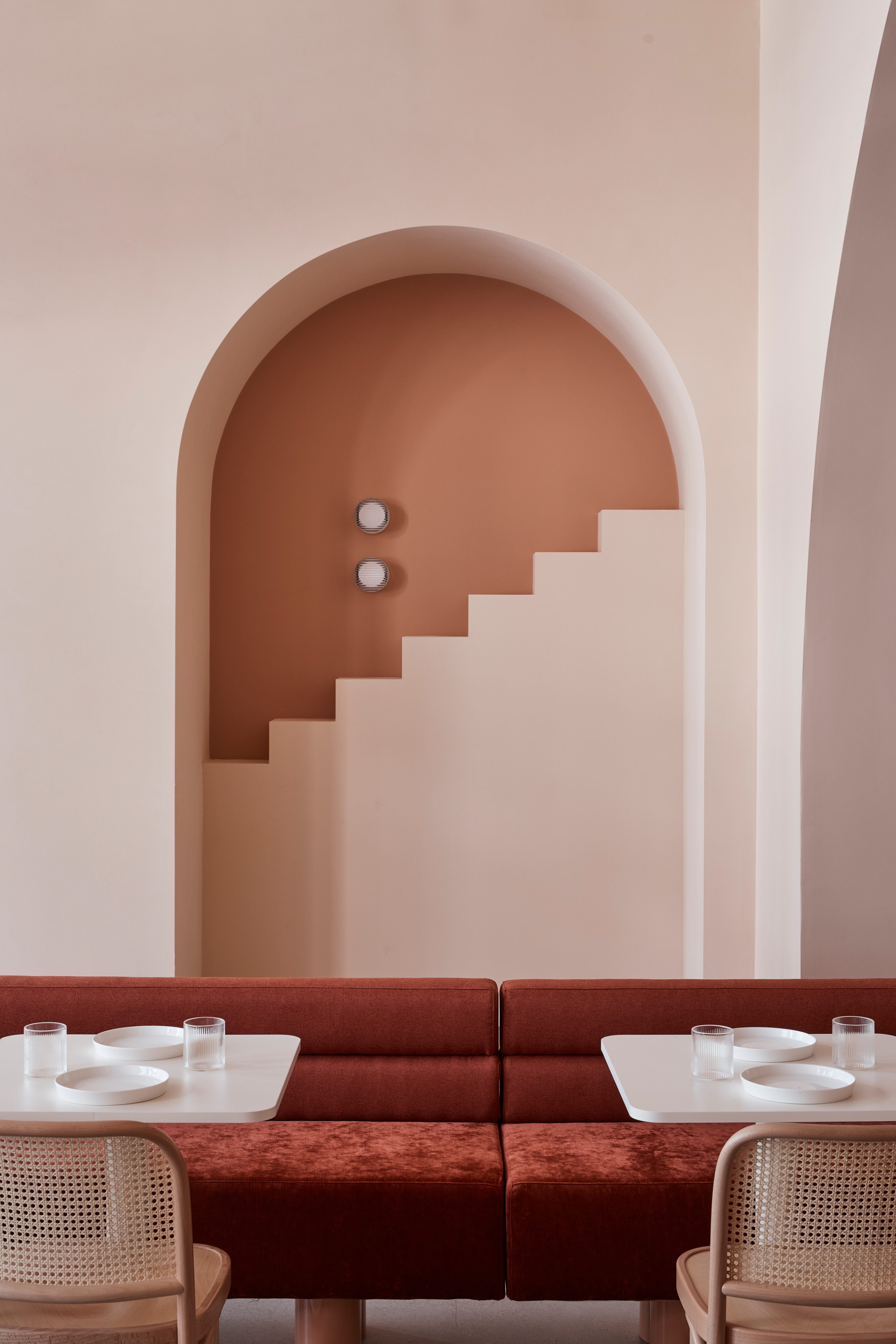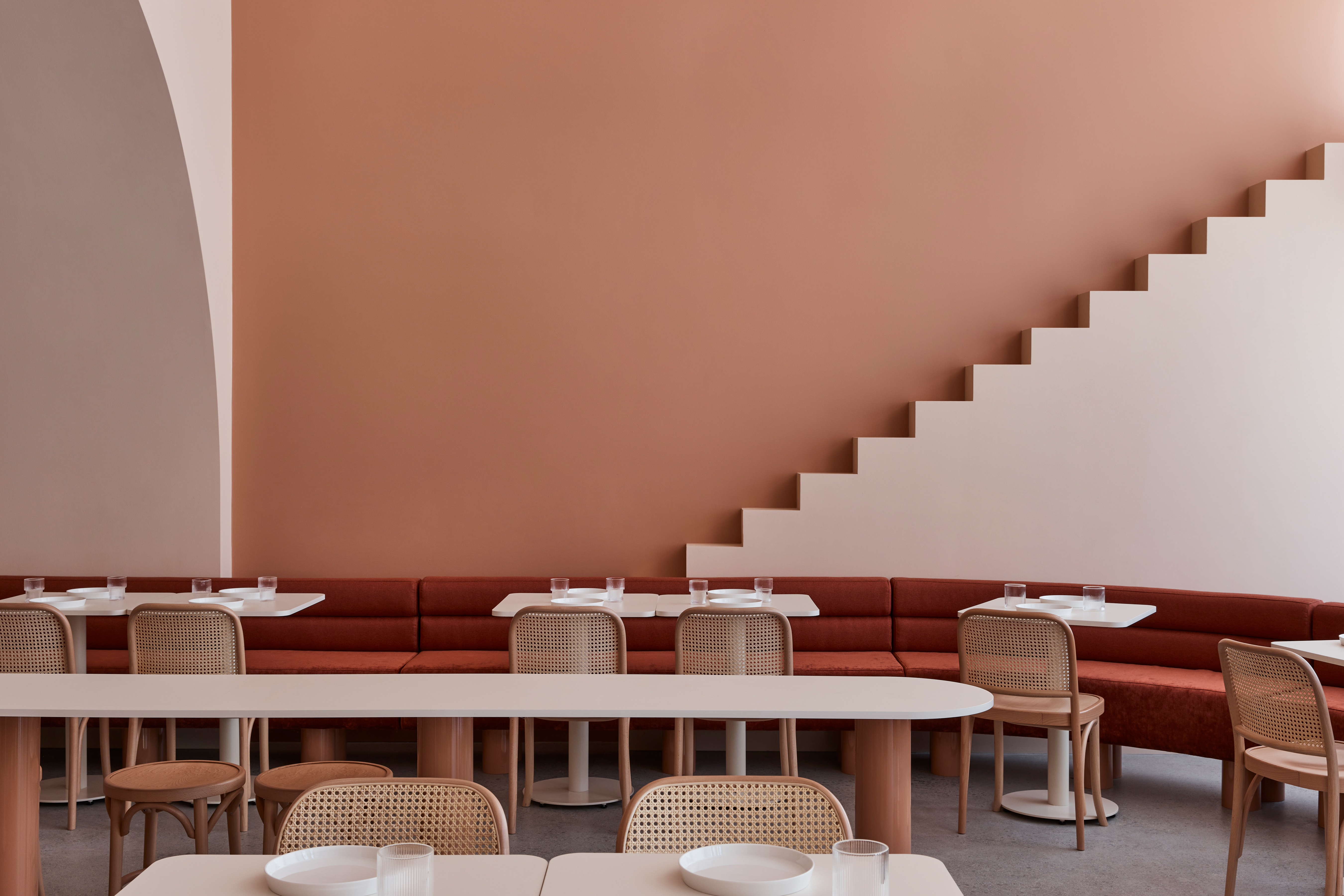 Anderson’s films are memorable and magical. He is renowned for symmetry, detail and one-point perspectives, and he creates his mythical worlds through whimsical sets, vivid colours and nostalgic sentiment. Having studied his style for The Budapest Café in Chengdu, we evolved the design experience for the Melbourne café. Drawing on our appetite for modern abstract art, design and hospitality, we created an immersive gallery-like experience through an exploration of form, function and colour. There is a bolder approach to the design elements, while still optimising the space to its fullest capacity. Arched-shaped banquette seating wraps around the front beneath a double-height space, with a communal bar table through the centre. A tunnelled arch leads patrons deeper into the café and frames the point-of-sale counter at the end. The back wall is adorned with a narrow stair leading nowhere. Another staircase is likewise framed in an arched recess, encouraging patrons to engage with the design and capture and share the quirky, stylised images.