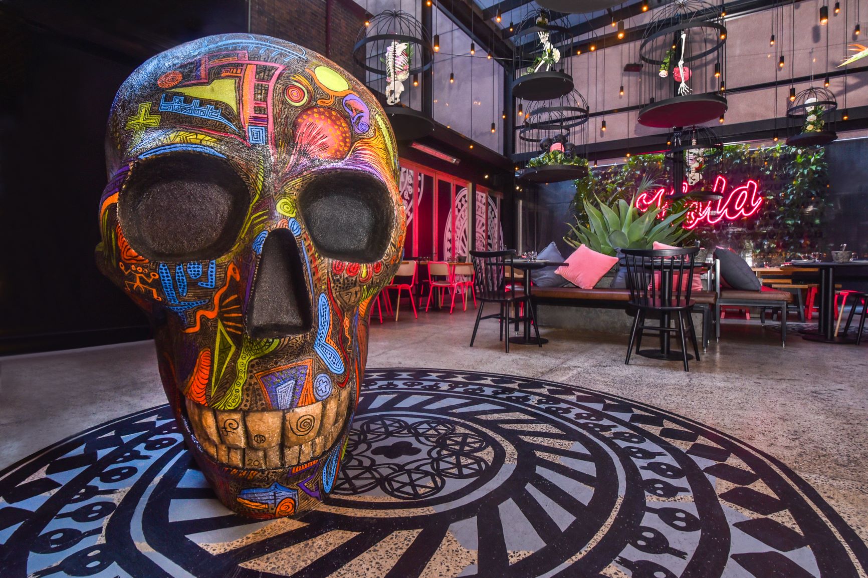 We have transformed the iconic venue into a unique and purposeful sensory cultural fiesta heightened with nostalgia. From the very moment patrons take their first step into the hip venue through the black and pink striped lined walls, they are greeted by a vibrant theatrical oversized hand-painted skull which doubles as a host stand.