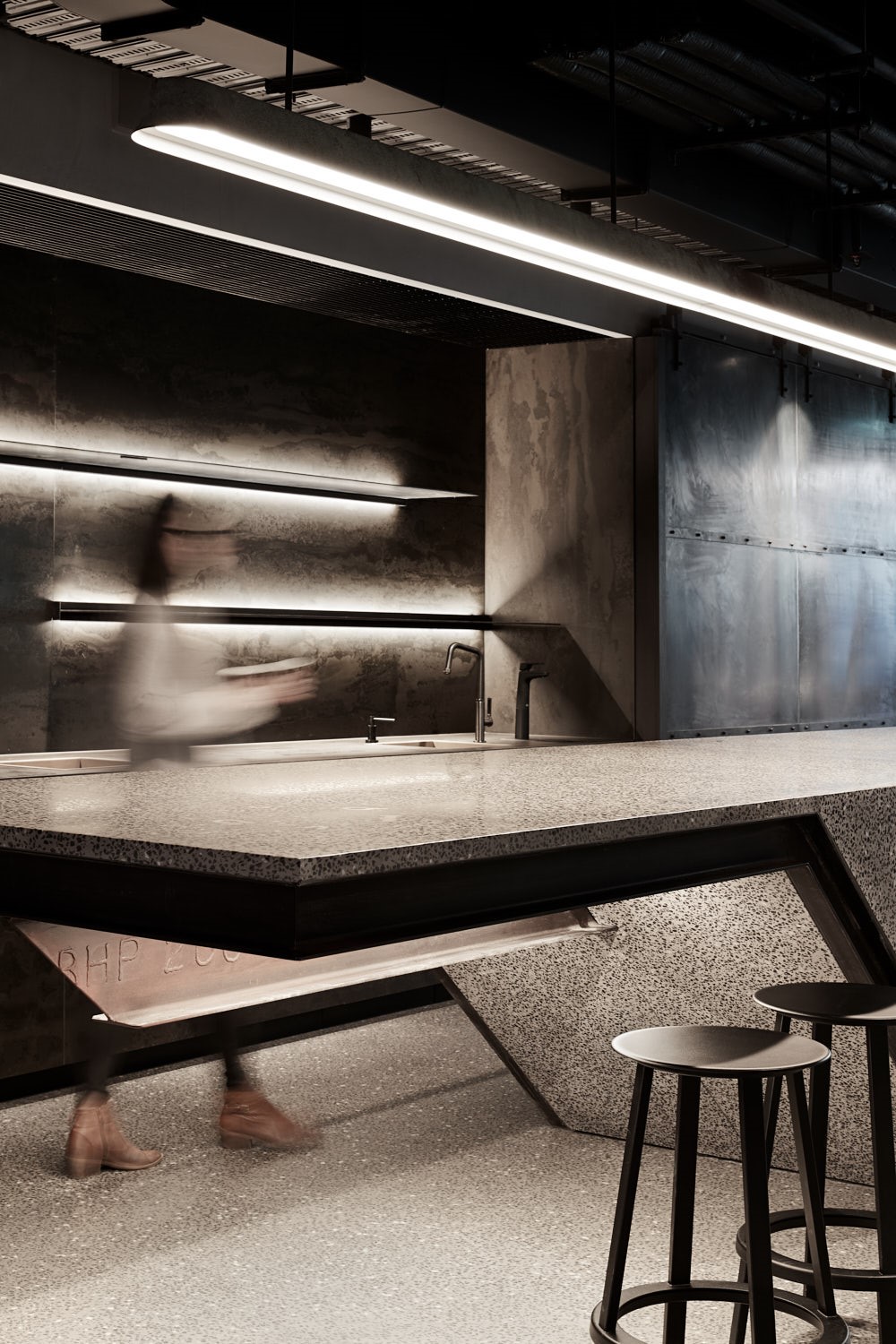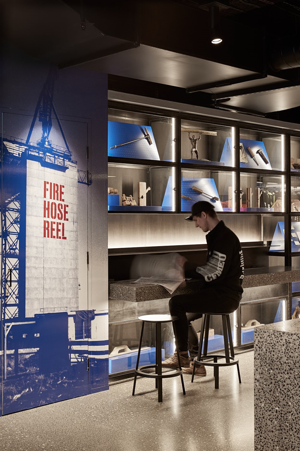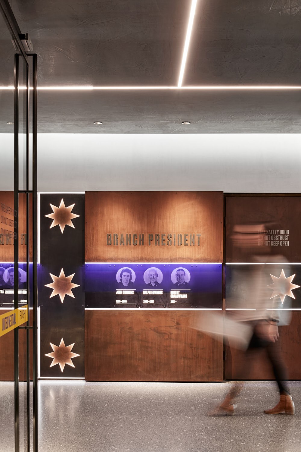 The Honour Board was one of the best designed elements in the space but also one of the most challenging because of the level of detail and coordination required. Working very close with a local manufacturer and following several meetings between all parties involved lighting was integrated within the metal panels to create a beautiful piece that celebrated the history of CFMEU.
