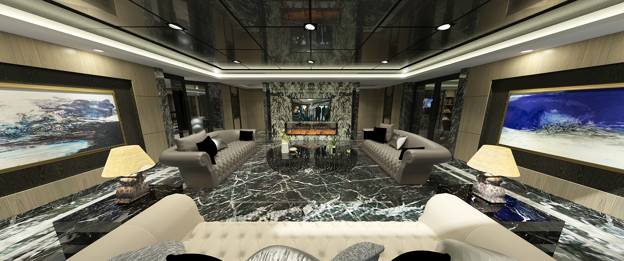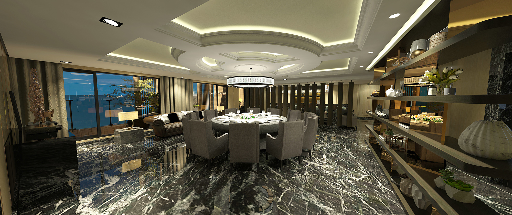 The banquet hall can host not only feasts, but also some more chilling events with the lounge and the bar area. The sections are separated by screens and showcases which also add layers to the spacious room. The curvy ceiling design, French windows and the chandelier are similar to the lobby, extending the same style while aligning the aesthetics and atmosphere. In the multimedia studio, two enormous paintings along with the marble flooring and TV wall builds up the tension of grandness. The e-fireplace can help moderate indoor temperature as well as add some warm touches to the room.