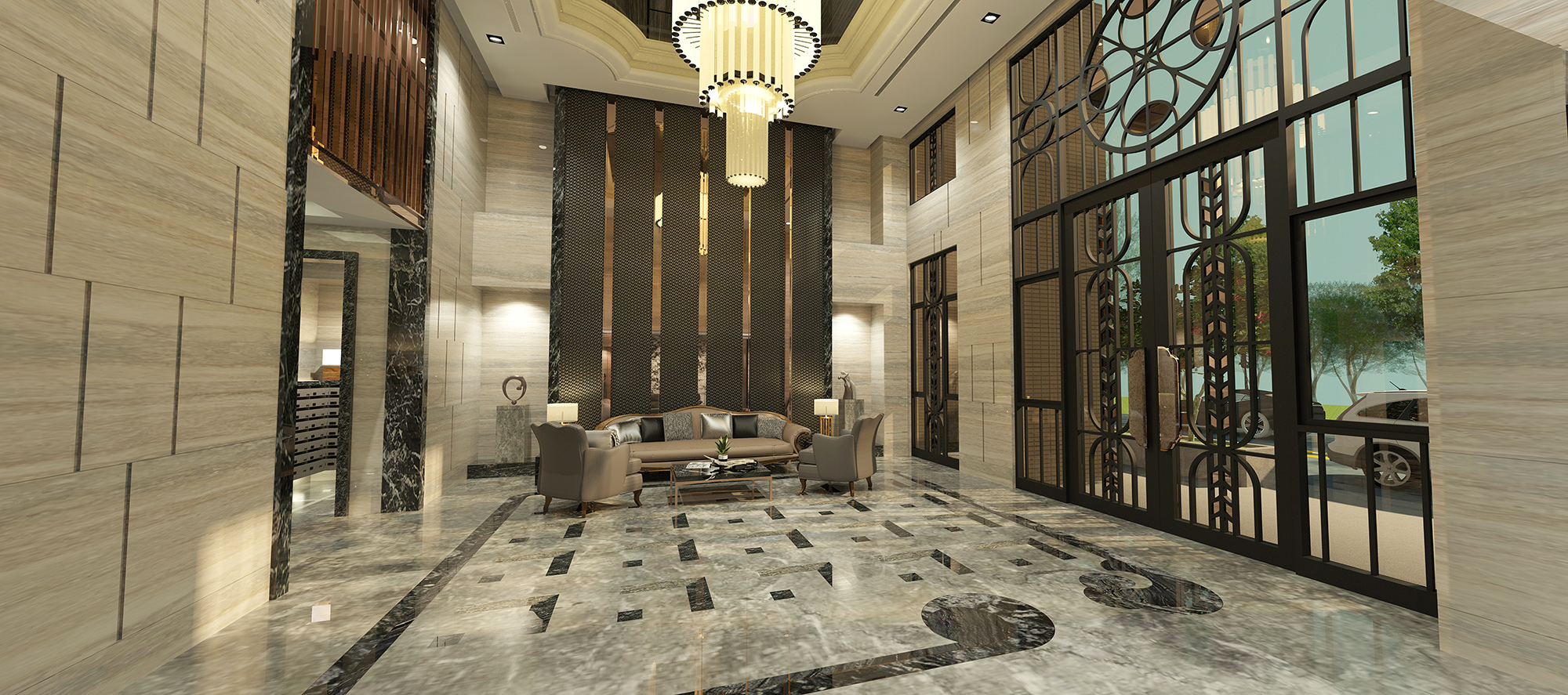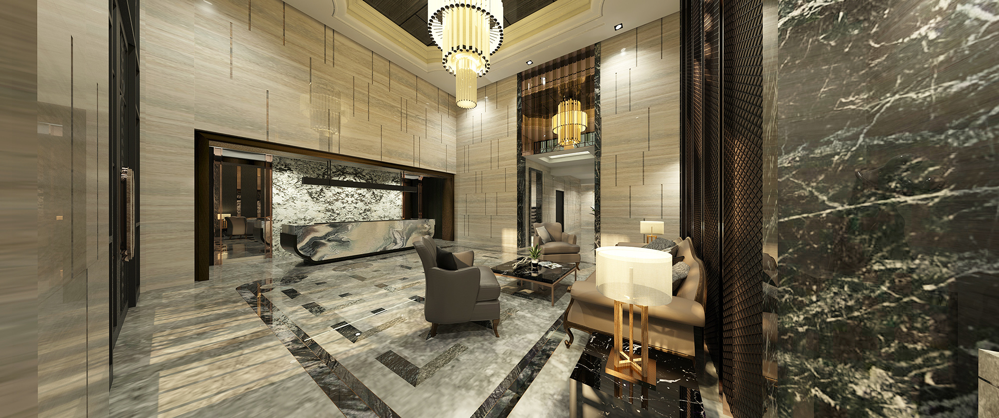 The lobby is well-lit with natural light due to the glass gate and wall decorated with pale bronze glass. The hardware embedded forms a pattern of ear of wheat, symbolizing a fruitful life to come. The glamorous chandelier, which is the center piece of the lobby, resonates the classical design of the ceiling. Stone veins from the reception counter and the walls together build an ambience of elegance and luxury.