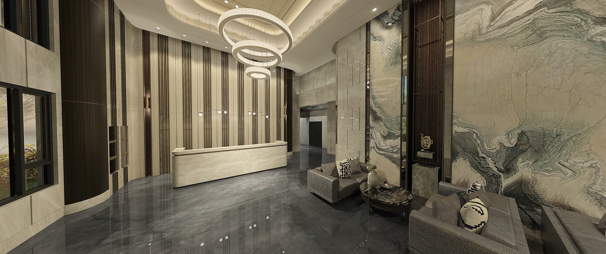 Equipped with diverse public facilities, such as the lobby, the dining area, the playroom, and the gym; the building is more than a residency, but a place for people to bound and connect. The spacious lobby with calming colors creates a sense of significance when entering the building. Along with the classical concentric chandelier, the interior design depicts a picture of a lux and modern lifestyle. On the other hand, the dining area sets up a different vibe with a softer color palette. The grayish tone from the marbles and the leather seating simplifies the space and builds an atmosphere of comfort and harmony.