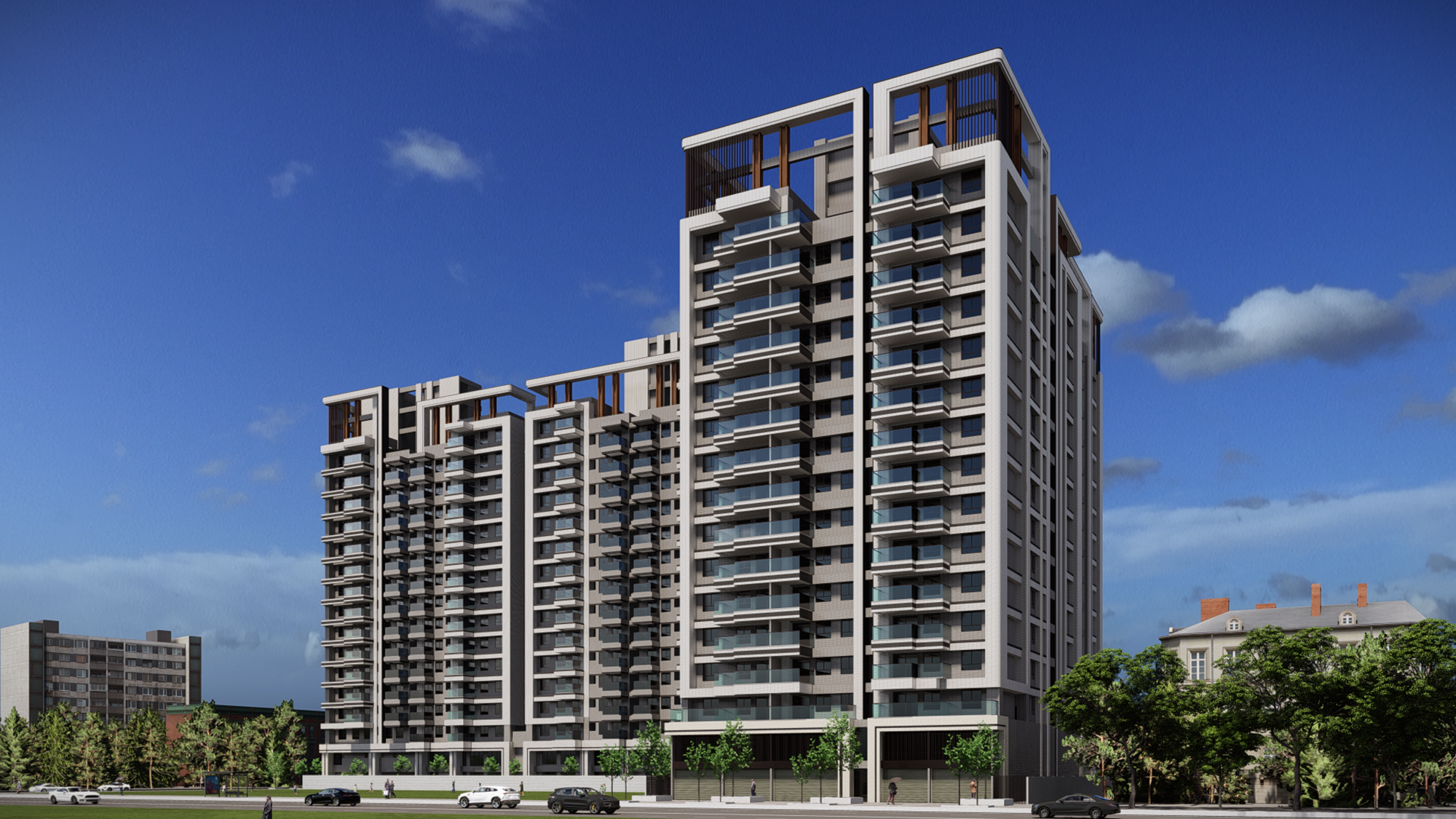 With a large-scale setback, this project is able to provide a spacious green field for the neighborhood to enjoy. The stacked-up volume of the structure offers an open view of the blue from nearby water and the green from the surrounding environment. By inviting the nature into the interior, the structure has blended into its surround seamlessly. With refined touches and purposeful outlines to shape the building; with rhythm of design and different shades of color to weave together lights and shadows.
