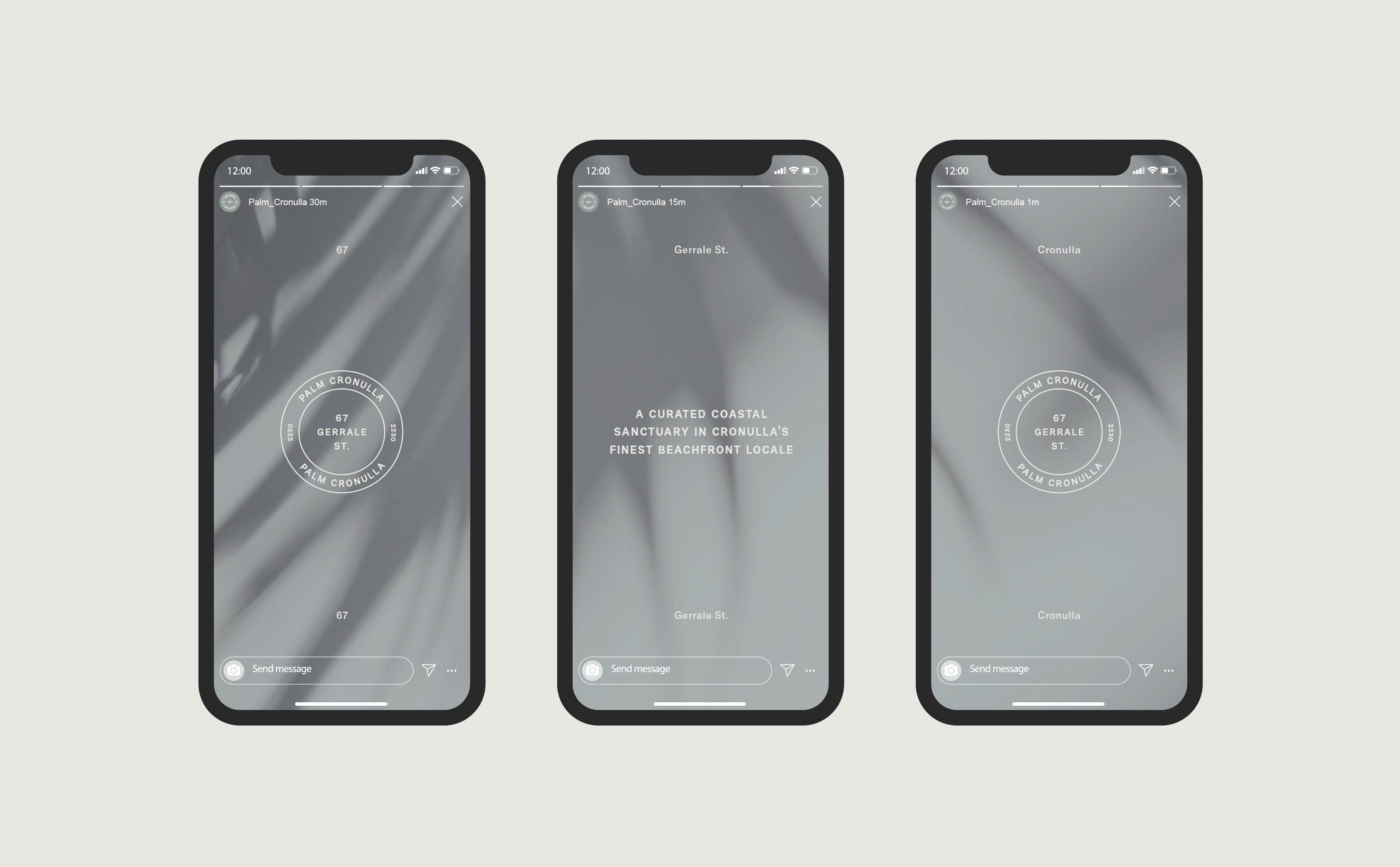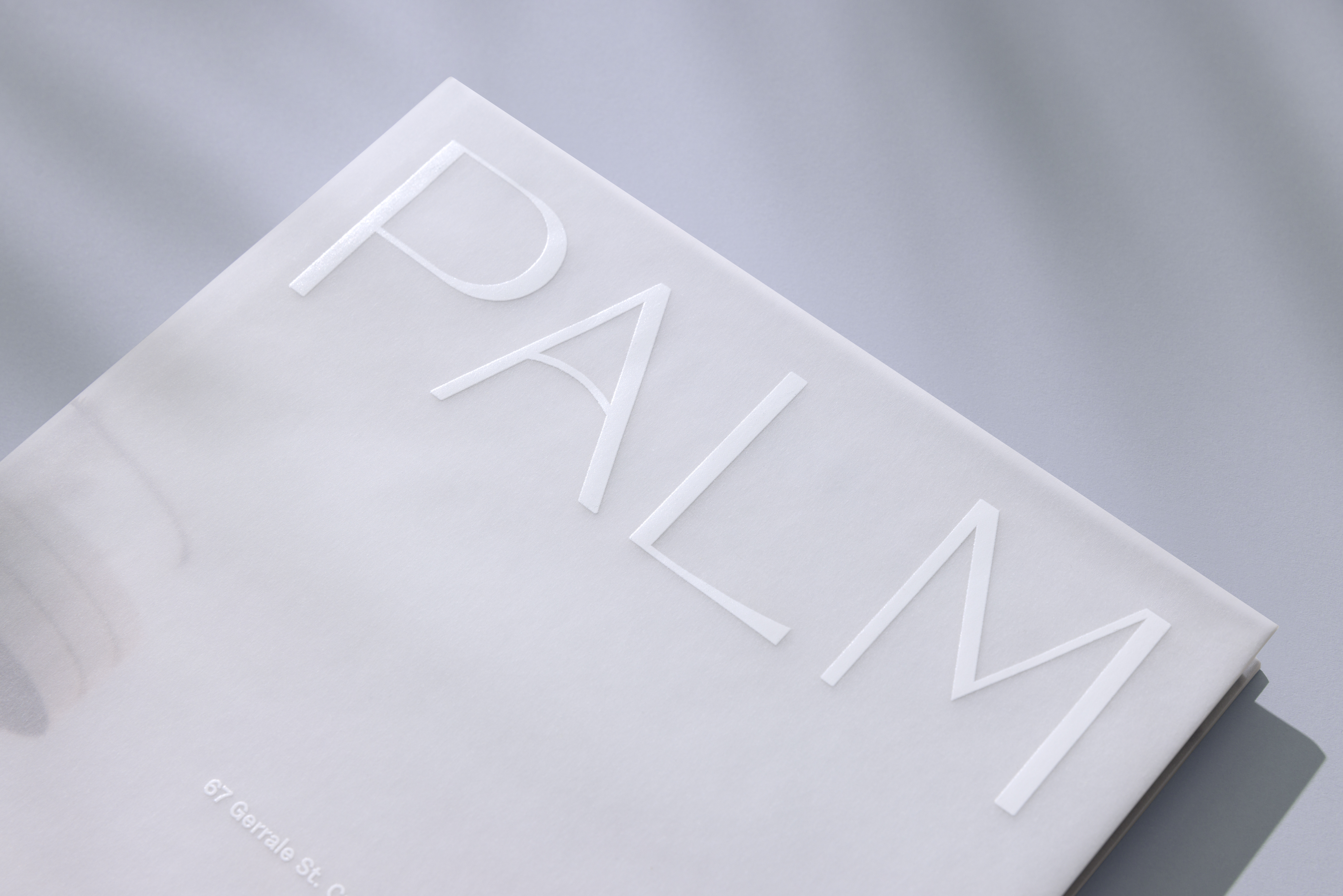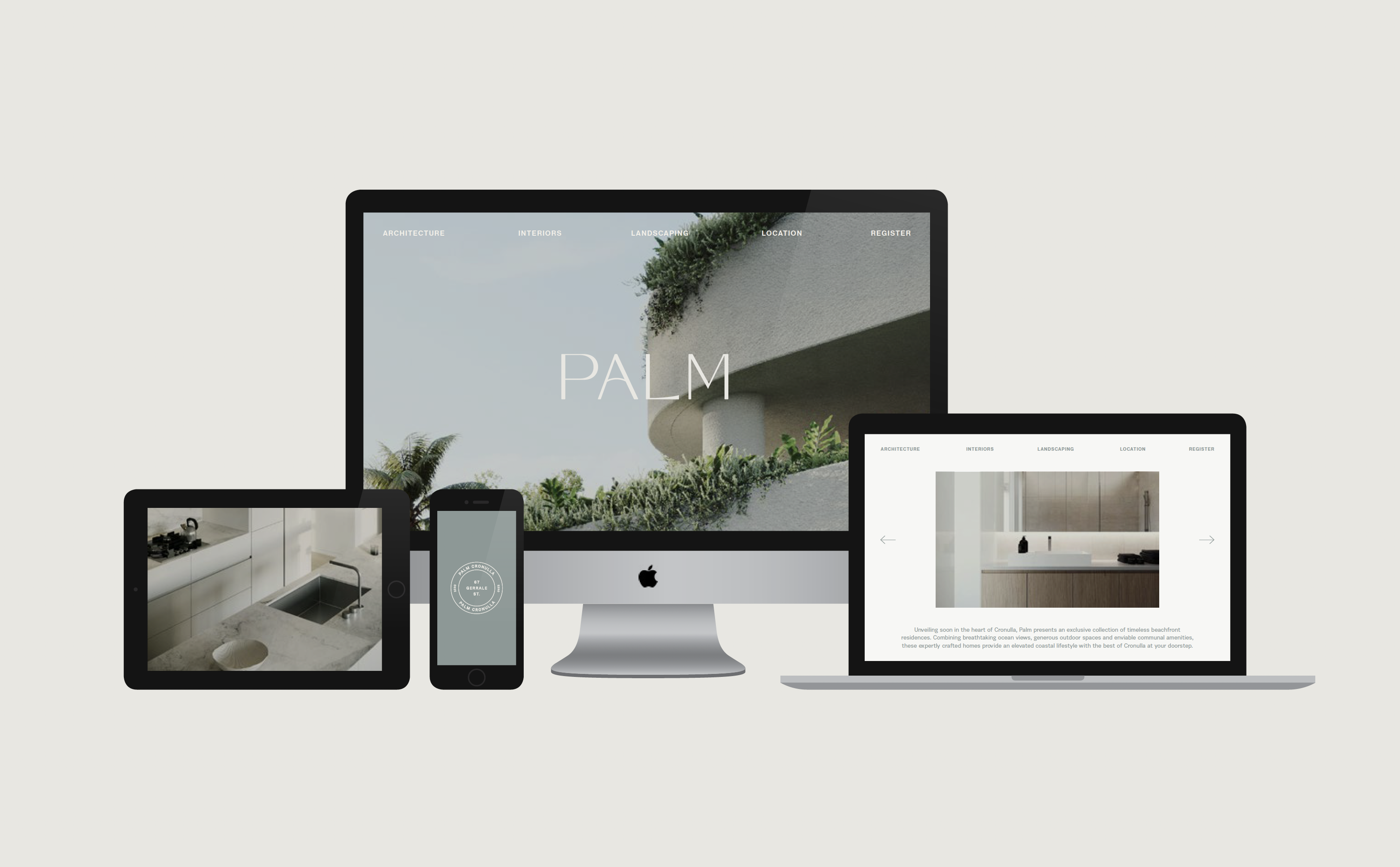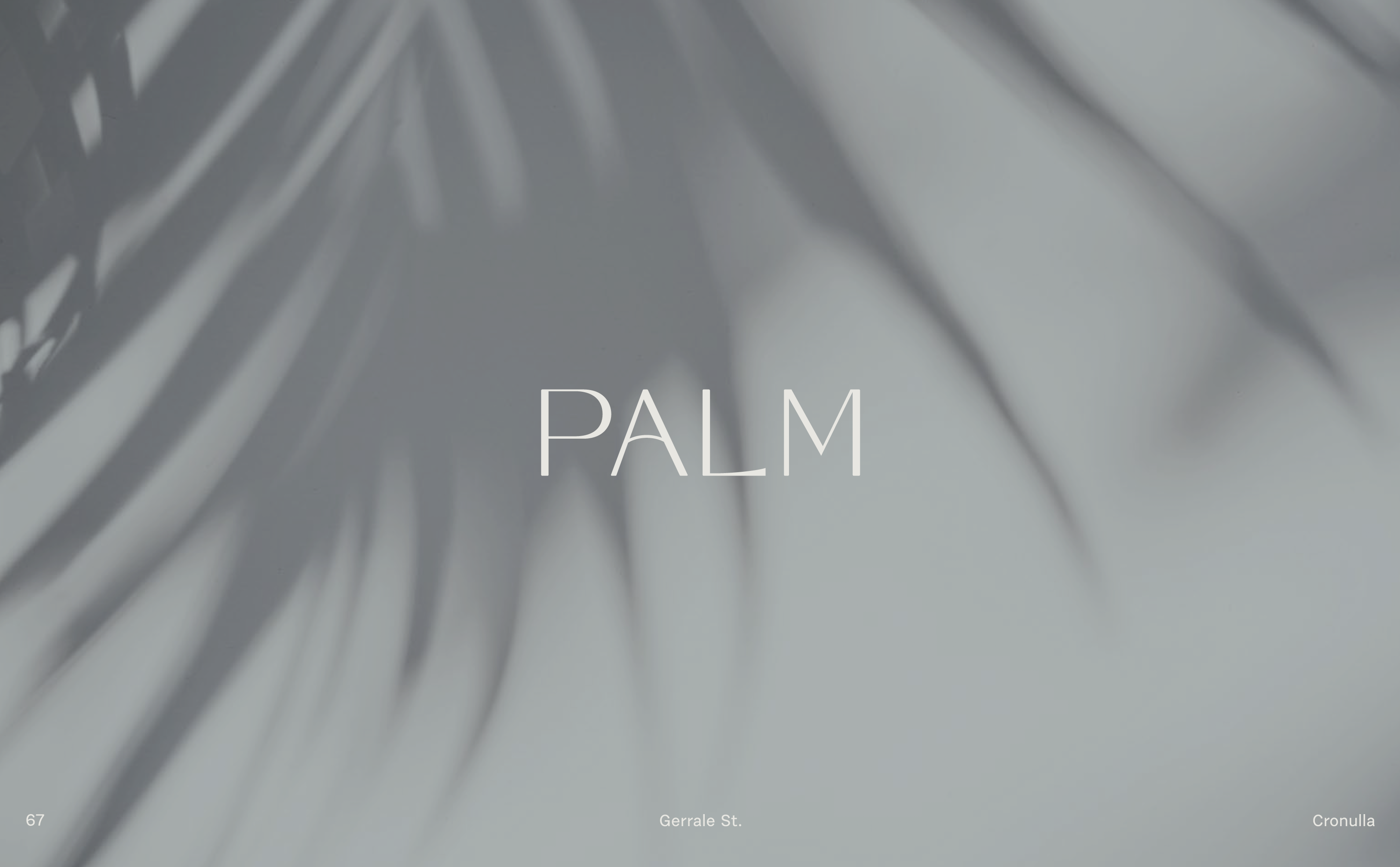 Sophisticated and design-focused, the concept for Palm referenced the project's iconic Sydney location and high-end design. Focusing on the interplay between inside and out, this direction presented a series of dynamic render moments while allowing a captivating film of the project's close proximity to the beach to take centre stage. An animated moment on the website features an enticing shadow play of palm leaves found in Cronulla and the natural stone used in the project. An elegant logo was created, featuring the suburb and street name as part of the lockup to highlight the desirable location of the project.