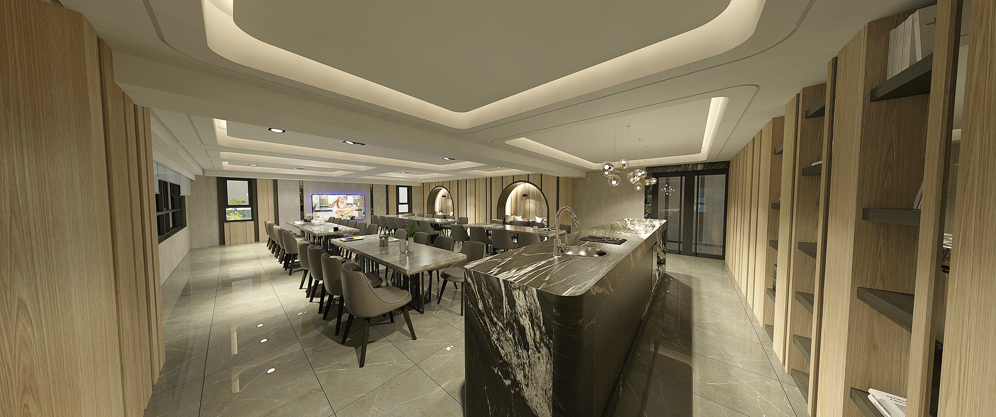 Equipped with diverse public facilities, such as the lobby, the dining area, the playroom, and the gym; the building is more than a residency, but a place for people to bound and connect. The spacious lobby with calming colors creates a sense of significance when entering the building. Along with the classical concentric chandelier, the interior design depicts a picture of a lux and modern lifestyle. On the other hand, the dining area sets up a different vibe with a softer color palette. The grayish tone from the marbles and the leather seating simplifies the space and builds an atmosphere of comfort and harmony.