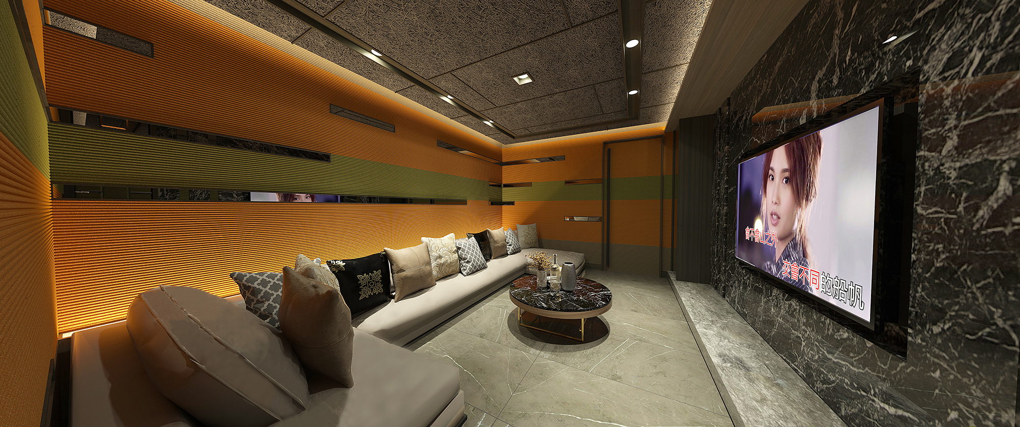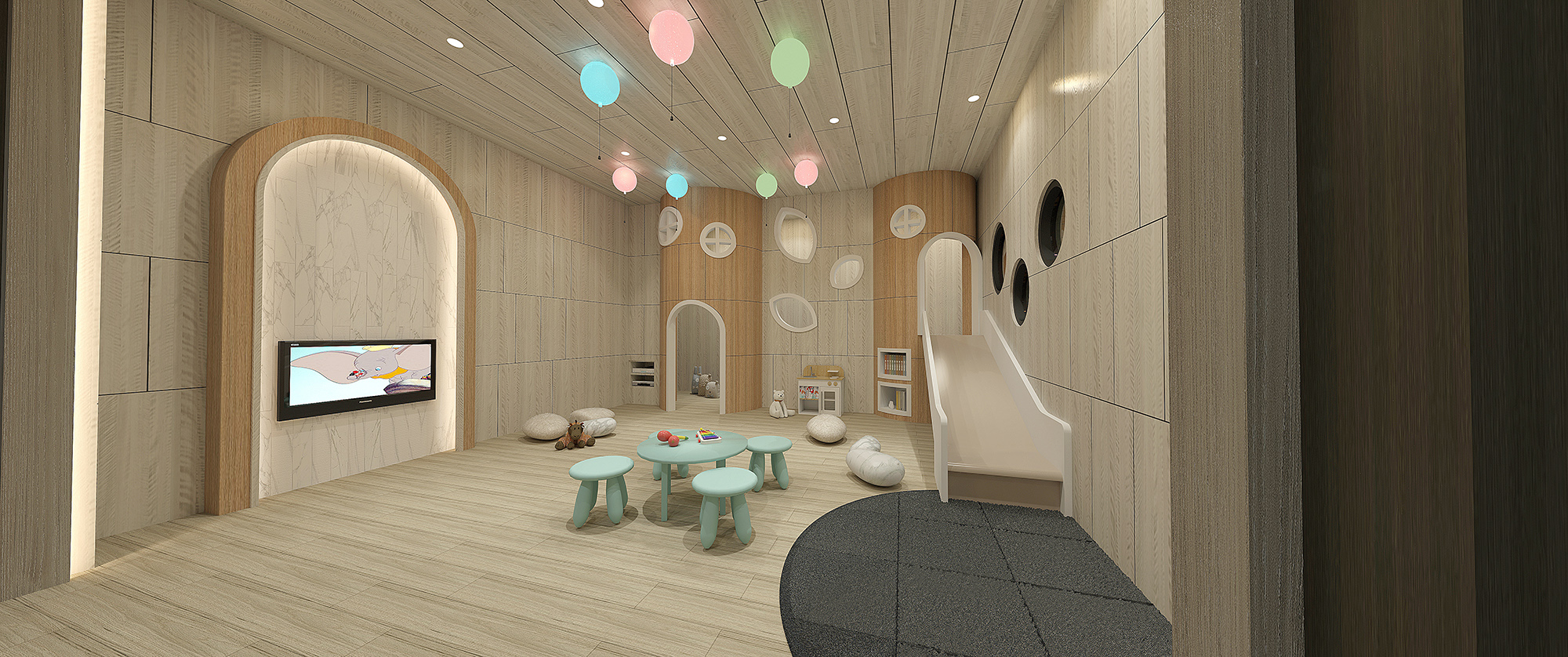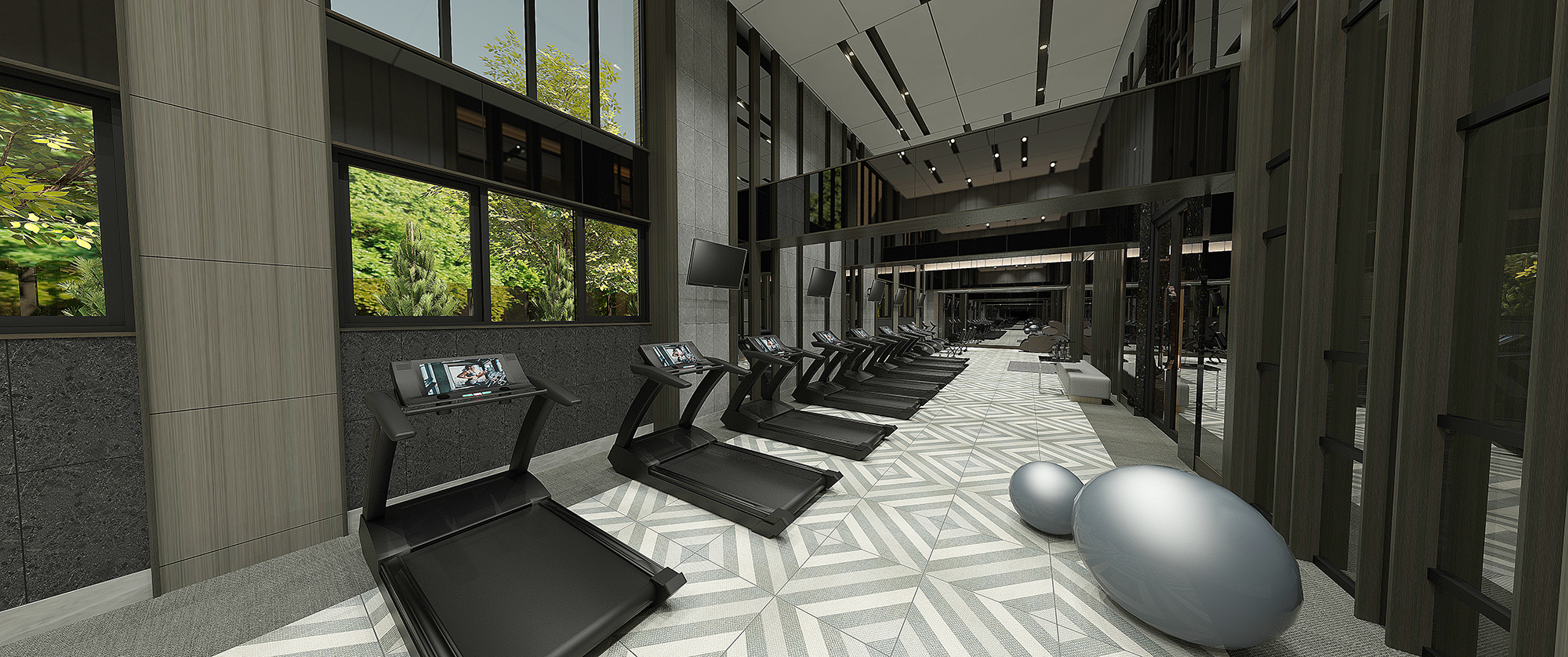 In the recreation room, the designer changes route again and applies black marbles for the TV wall. With pop of vibrant colors, the room is a perfect place for friends to have fun and rock the karaoke. When it comes to the playroom, the main goal is to make kids comfortable and have a good time. To keep the environment safe for kids, the corners of furniture are all rounded. The higher ceiling and longer space of the gym creates a broader perception, and the greenish view outside lightens up the moods.