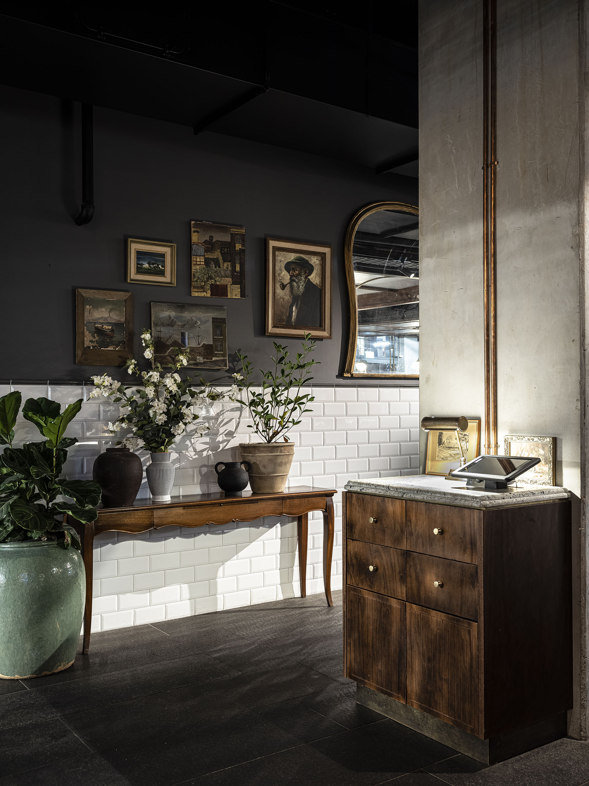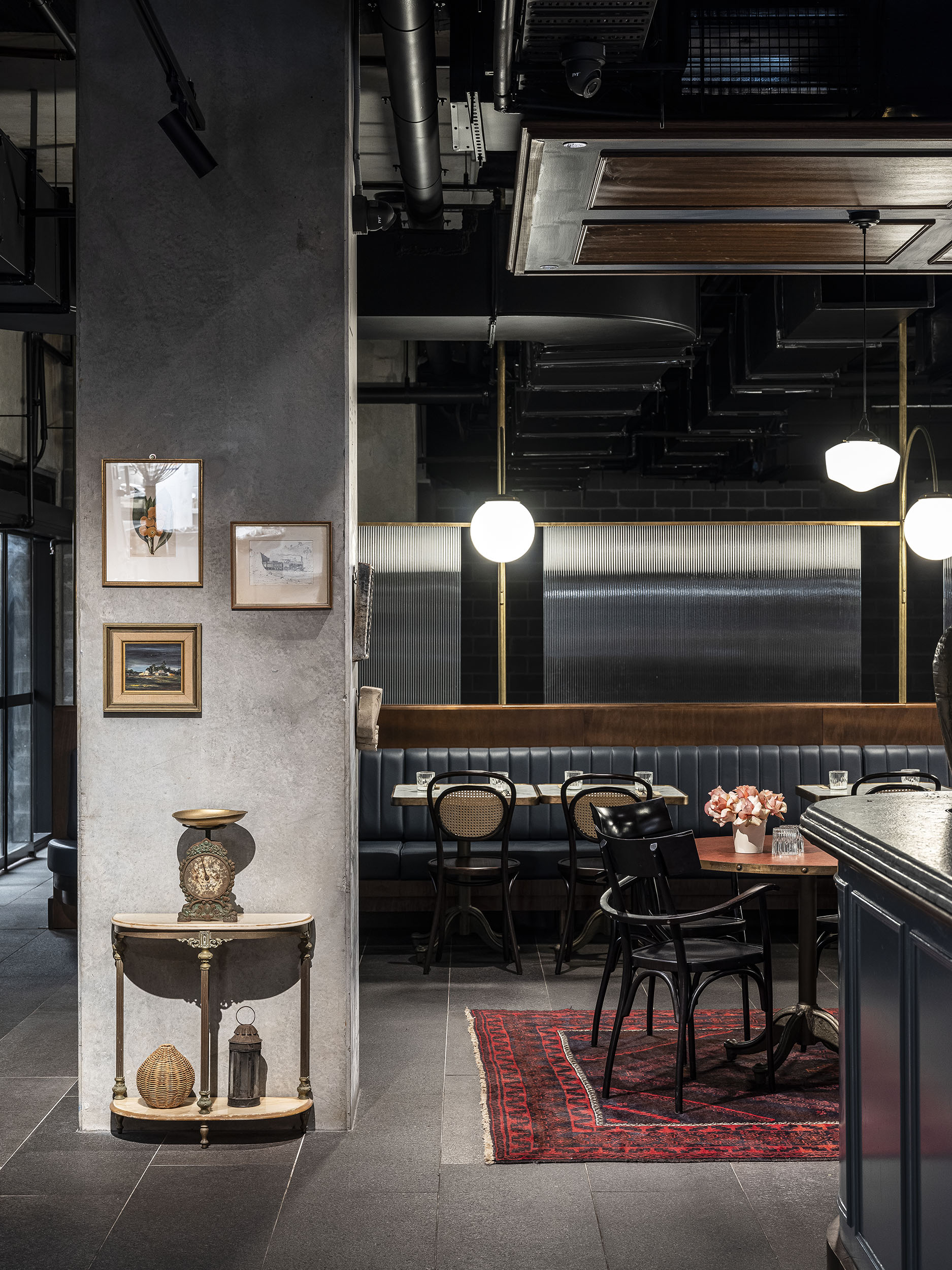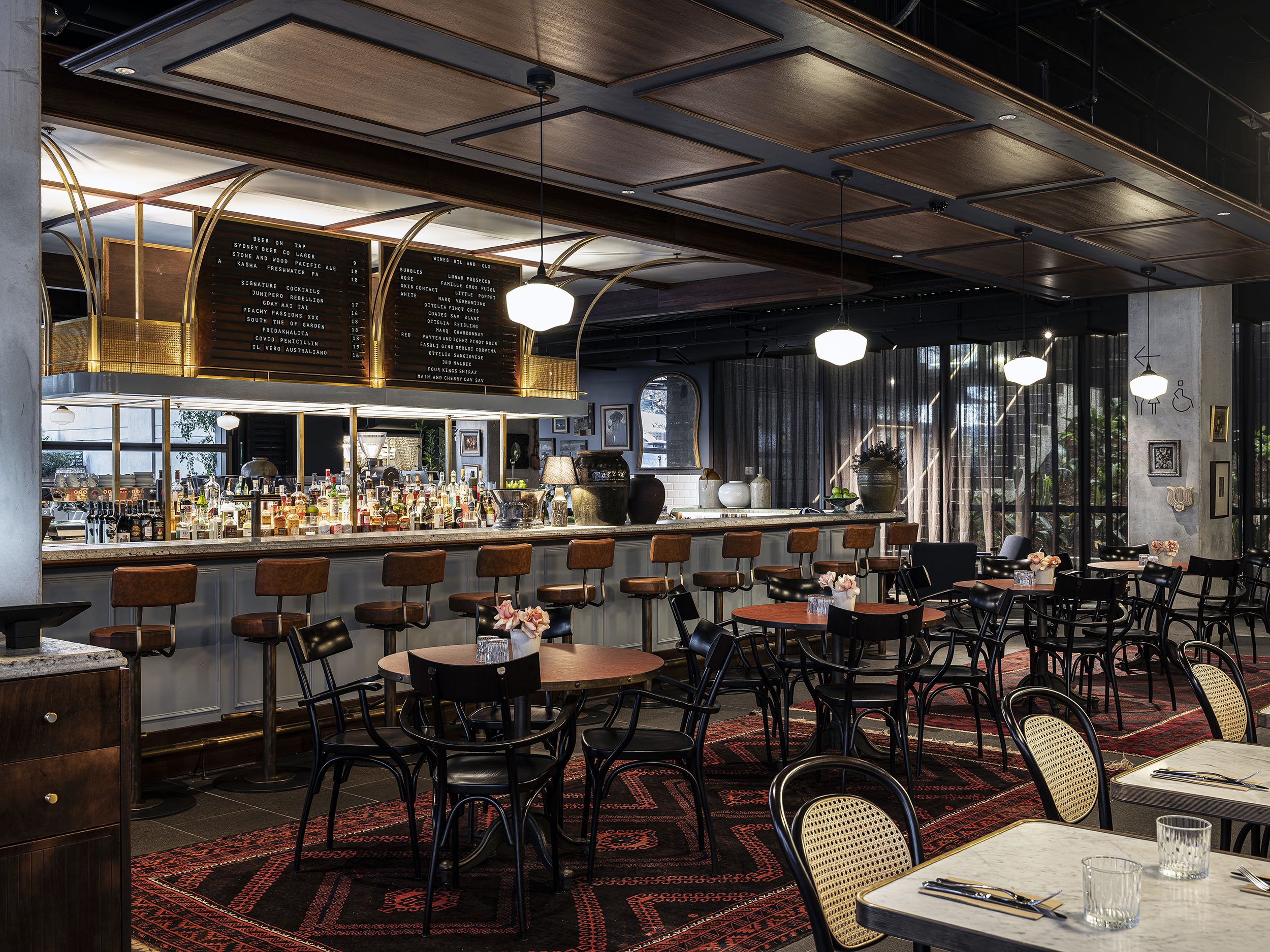 Our client, Jack Hanna, who was the co-founder and co-owner at The Grounds in Alexandria before selling his stake in the ground-breaking Sydney venue, wished to create a more elevated offering for locals and visitors to gather and connect. Much like Alexandria at the time of The Grounds’ launch, the location is no thrumming hospitality epicenter, so the brief was to design a venue that encouraged repeat patronage by accommodating myriad service needs around the clock ranging from the creation of express pathways for orders to go, hubs to linger over a drink and intimate zones to settle in for a meal. Our challenge was to soften the towering Brutalist shell we inherited. We delicately balanced its heft and rigour with expressive arched and curved elements and partially lowered the lofty ceiling height (simultaneously disguising services). Three walnut-stained panels (subtly referencing the timber decks of industrial vessels that once frequented the port) instantly cosy the soaring 290 SQM space (365 SQM in total including the internal kitchen), crowning its distinct offerings whilst simultaneously acting as sound absorbers. They include: a central café (that transitions to a bar) framed by a restaurant with dining table arrangements and a café with booth-style banquettes. A patchwork of Persian rugs and Turkish kilims reference train journeys through exotic provinces, cushioning the intensity of the hard surfaces whilst unstitching the severity of the architectural fabric.