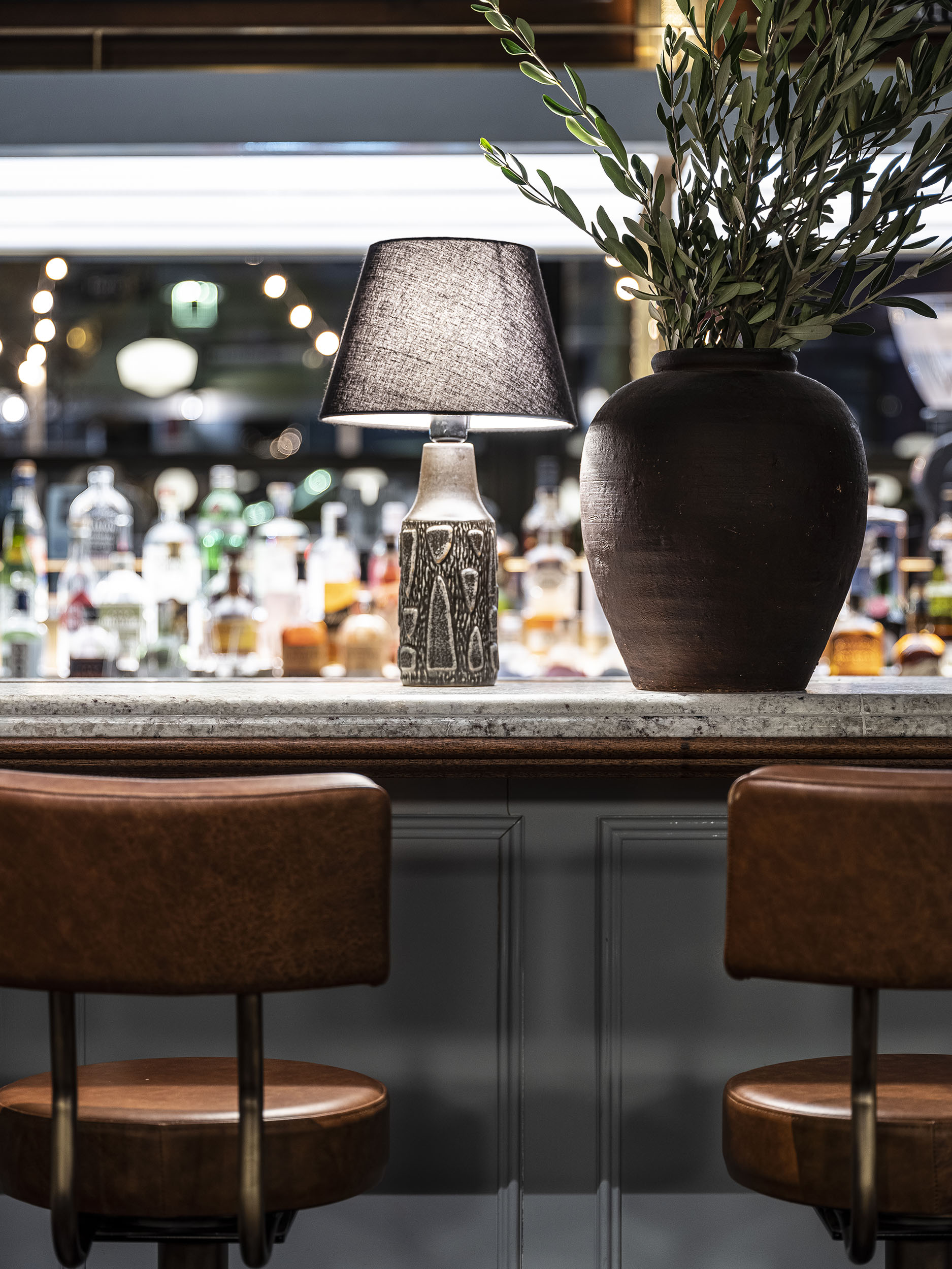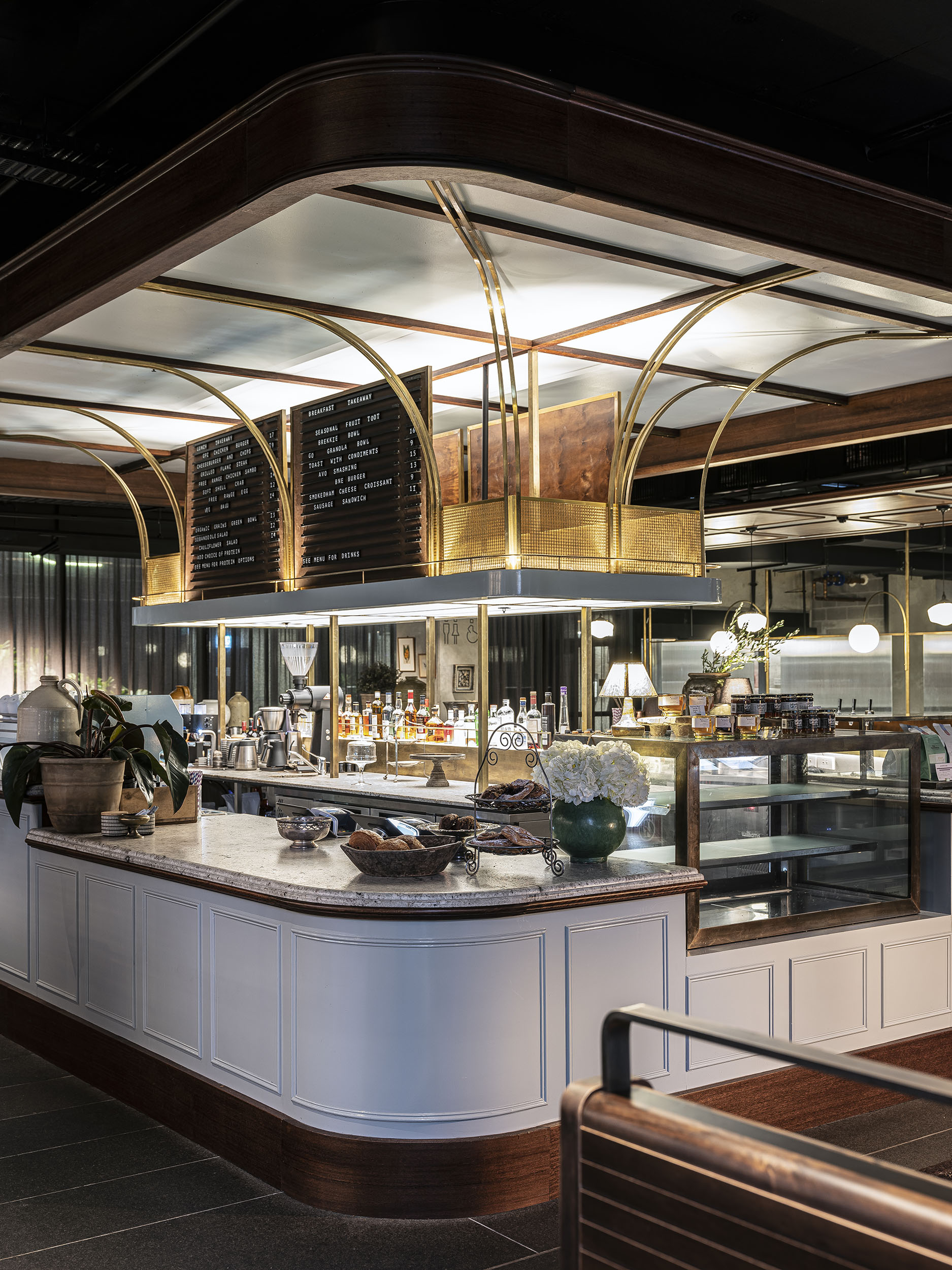 Seeking inspiration from turn-of-the-century Parisian train stations including Gare de Lyon, gilded elements are stripped of their ornate Belle Époque expressions to tapered brass silhouettes. Unique to the space is the hard-working centralised bar with rounded bullnose details to deliver a soft-edged robustness to the interior that functions as a bar on one side. Comprising a split rectangle with entry and exit points, it enables easy circulation for staff between all dining and service areas. Adding heightened nostalgia, its canopy is supported by elegant arched rods. The platform of this rising armature is tethered by brass mesh reminiscent of luggage rails within carriages, whilst the menu (listing café fare and cocktail offerings on alternative counter sides) recalls traditional departure schedule boards. As a stylish alternative to suspended generic speed rails, artistically displayed spirit bottles are located on the formal dining side of the counter’s central island, with cake and pastry displays behind their elevated platform. This enables patrons to glance through the centralised hub of activity to soak up the atmosphere from multiple vantage points, whilst ensuring streams of natural light are unobstructed. The generous width of the counter (just shy of 1 metre in most areas) also enables patrons to comfortably drink and dine counter-side without disruption from bar staff.