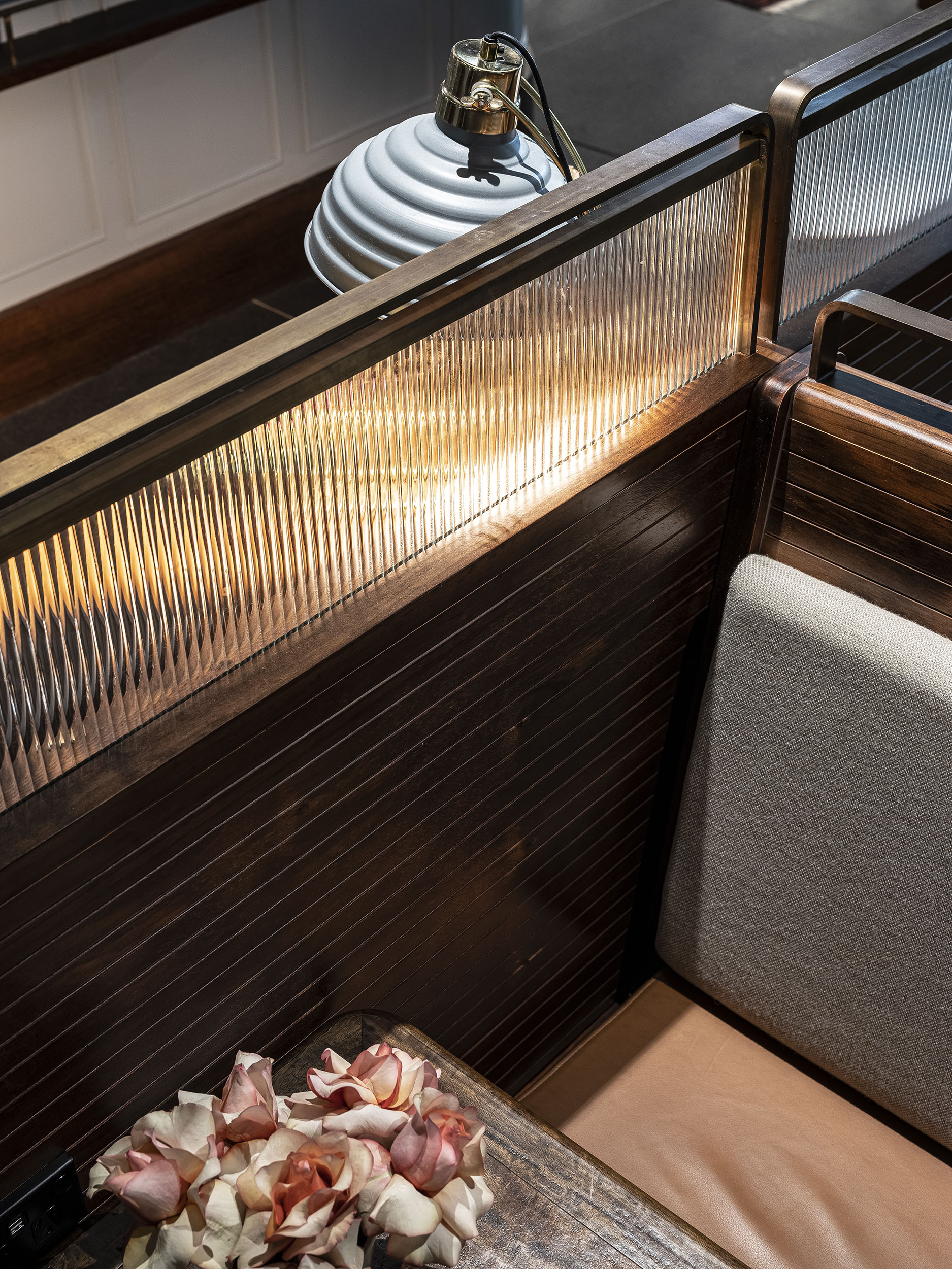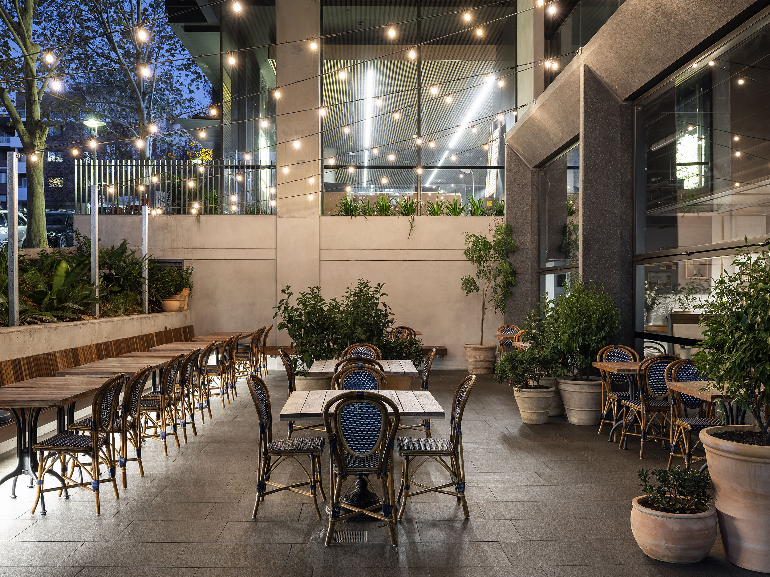 The Goodsline needed to be a venue for all seasons to attract office workers throughout the year plus locals on weekends. We inherited a deep sunken entrance courtyard with a generous slatted timber canopy entrance, however, the building’s bevelled cast terrazzo membrane imposed a fortress-like façade rather than a welcoming one. Attracting spontaneous aperitivo hours after work, we planted the al fresco area, strung carnival lights and scatted woven chevron-patterned rattan chairs around timber tables to introduce Parisian bistro themes, linking the internal drinking and dining spaces thematically. Sash and garage-style glass windows enhance biophilic connections between the interior’s potted greenery and the external plantings. Fluted glass was used throughout to distinguish various zones. We needed to partition the formal dining area from the incomplete secondary building entry directly behind it without constructing an internal wall. Positioning the opaque fluted glass above the banquette’s backrests allowed ample natural light to filter within. A procession of arched brass lighting rods echoing the hyperbolic expressions rising above the bar create intimate golden auras from above, instantly cosying this zone. The café’s booths reminiscent of traditional train seats on the alternative side of the counter are also linked by fluted glass at seated head height, gently buffering the intimate area from the bustle of the central café counter without obstructing sightlines. Less flamboyant carriage references include the built-in handrails atop the banquette seats and a row of white subway tiles articulating a datum line leading to the kitchen.