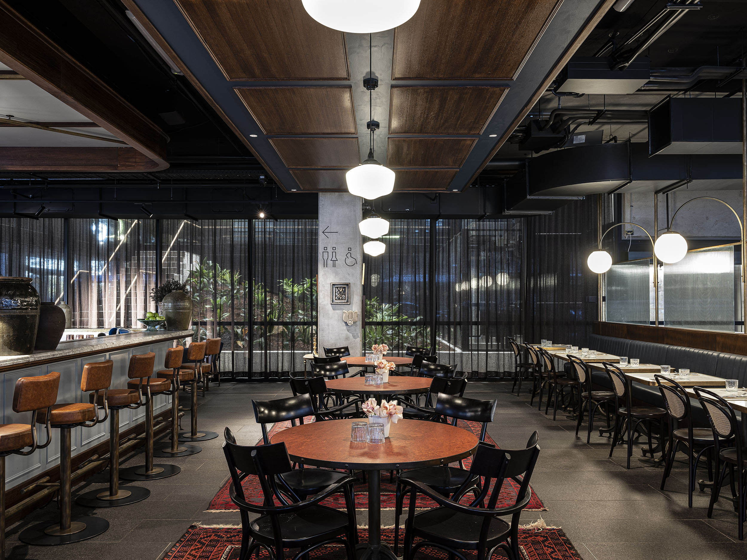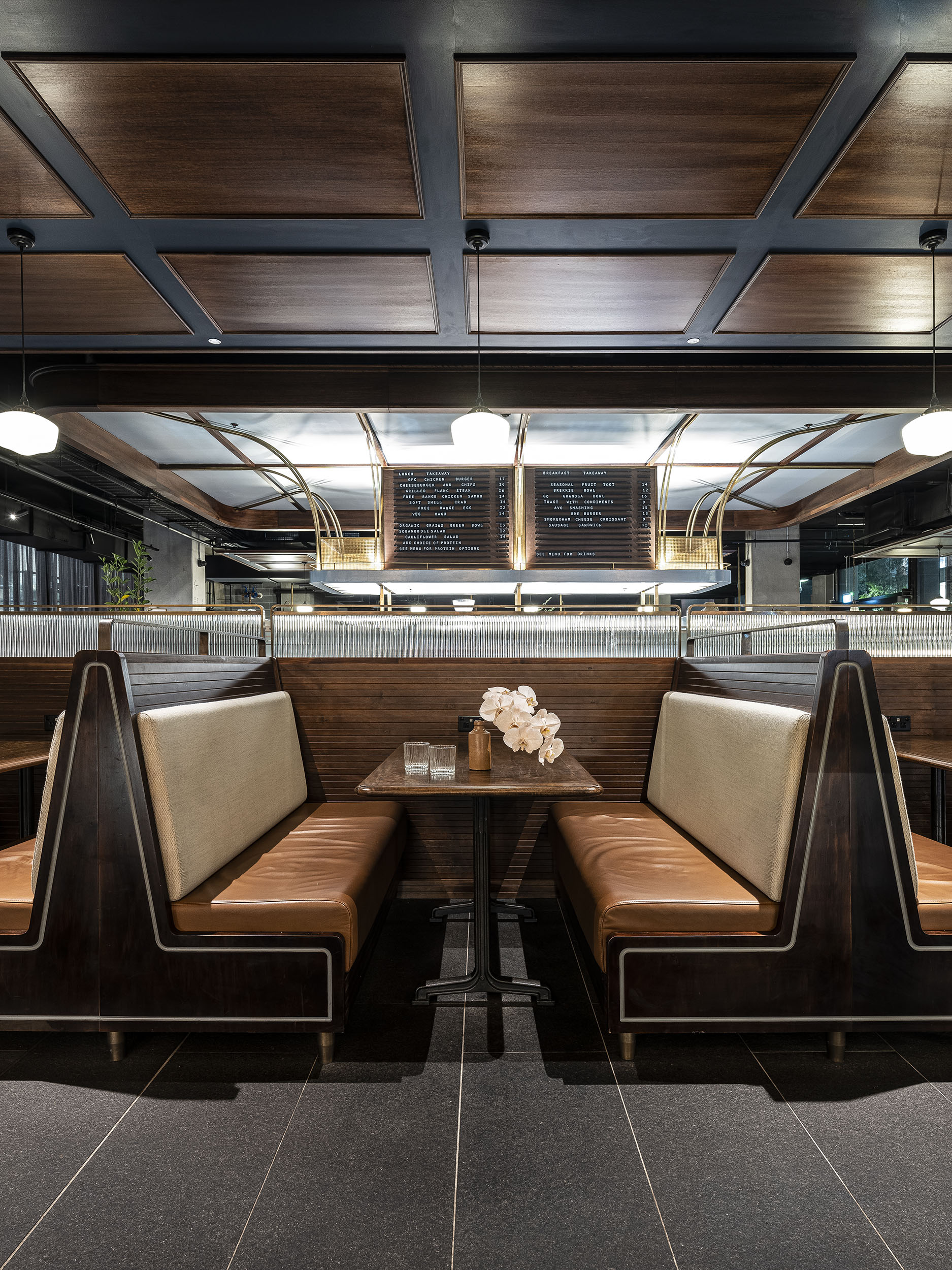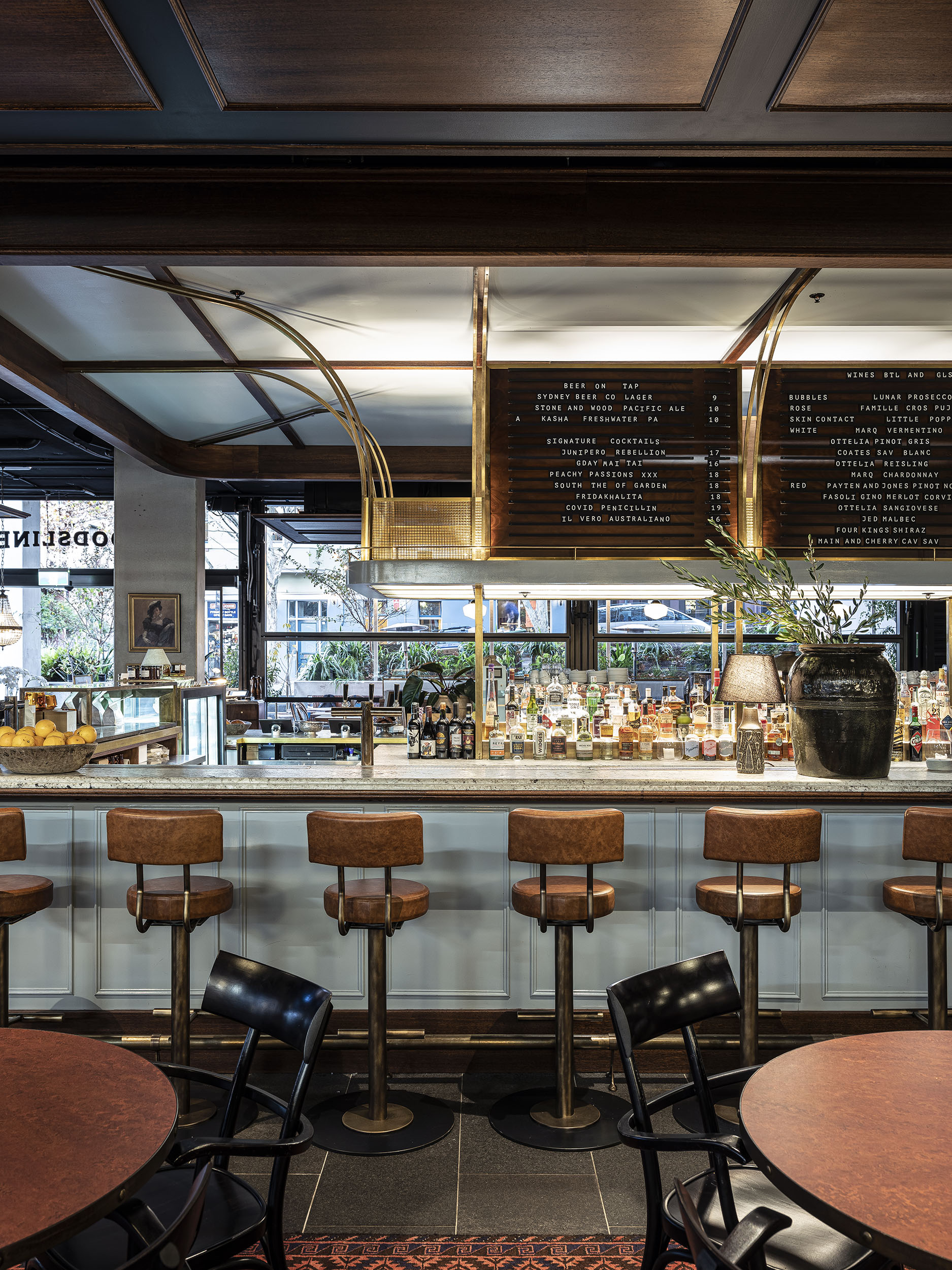 Harking back to the Golden Age of train travel, The Goodsline café and restaurant fast-tracks the opulent interior design of first-class carriages. Befitting its location near the Goods Line – an industrial freight railway that once connected Sydney's industrial suburbs to the ports and docks of Pyrmont to transport meat, wheat and wool (repurposed as a pedestrian walkway connecting Central Station to Darling Harbour) – it too performs a pivotal role. Located at the base of Bates Smart’s newly developed Workshop building which houses the headquarters of the Publicis Groupe (including over fifteen marketing, communications and digital transformation agencies) with ample apartment developments on its doorstep, the venue links Sydney’s Inner West to the city hub. Positioned within a robust concrete frame with bluestone pavers articulating the cavernous space’s hard surfaces, The Goodsline melds polished urban grit with theatrical drama. Furnishings prioritise cushioned comfort and intimate zoning via subtle shifts in elevations and styles, whilst elaborate touches including chandeliers, Deco Pendant lights and walnut veneers add to its atmospheric patina. Highly tactile materials recall those found in deluxe carriages and railway stations that flourished in the late 1800’s to mid 1900’s (plush fabric, polished brass, natural stone, glass, dark timber veneers and leather) without slipping into an assembled pastiche of the past.