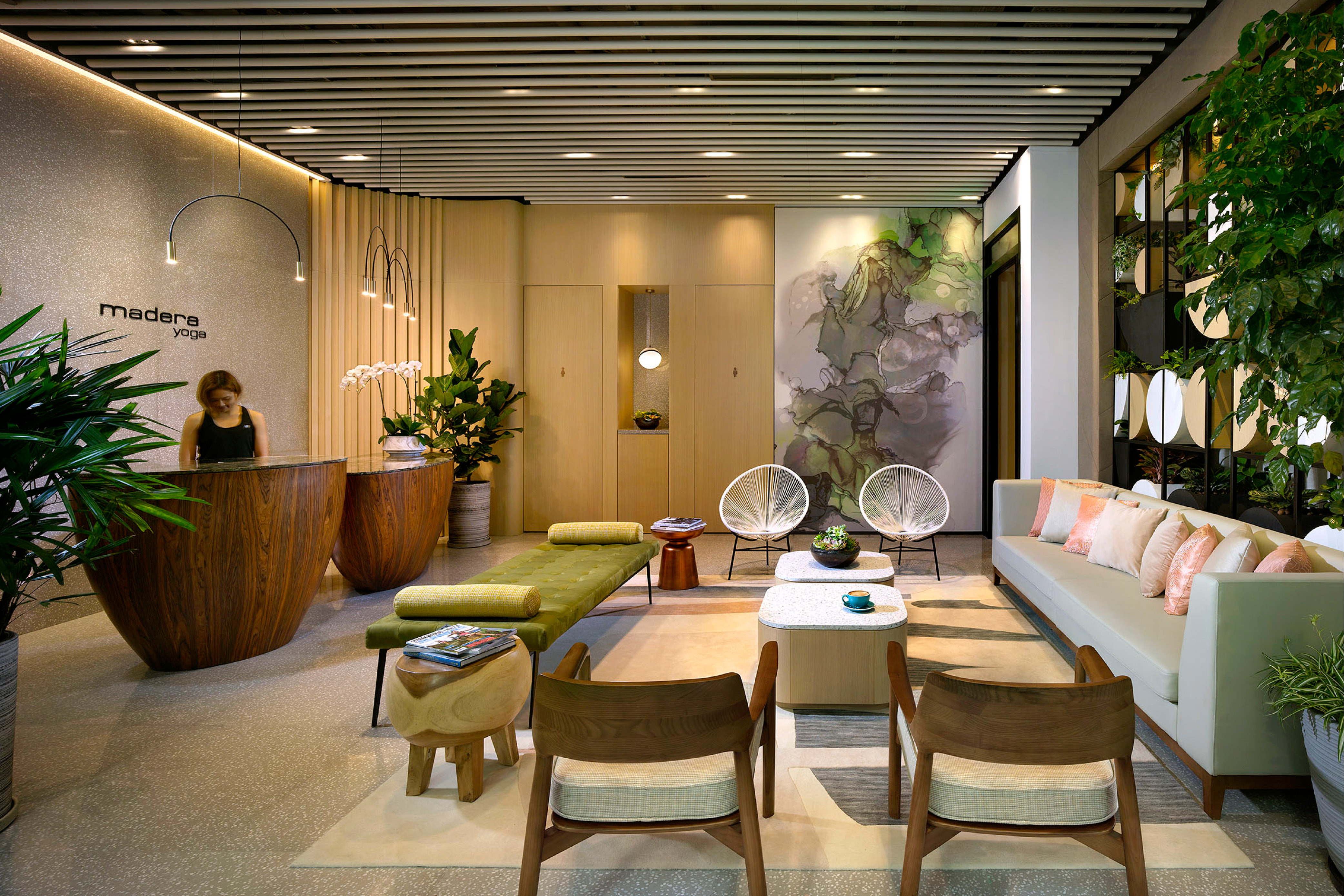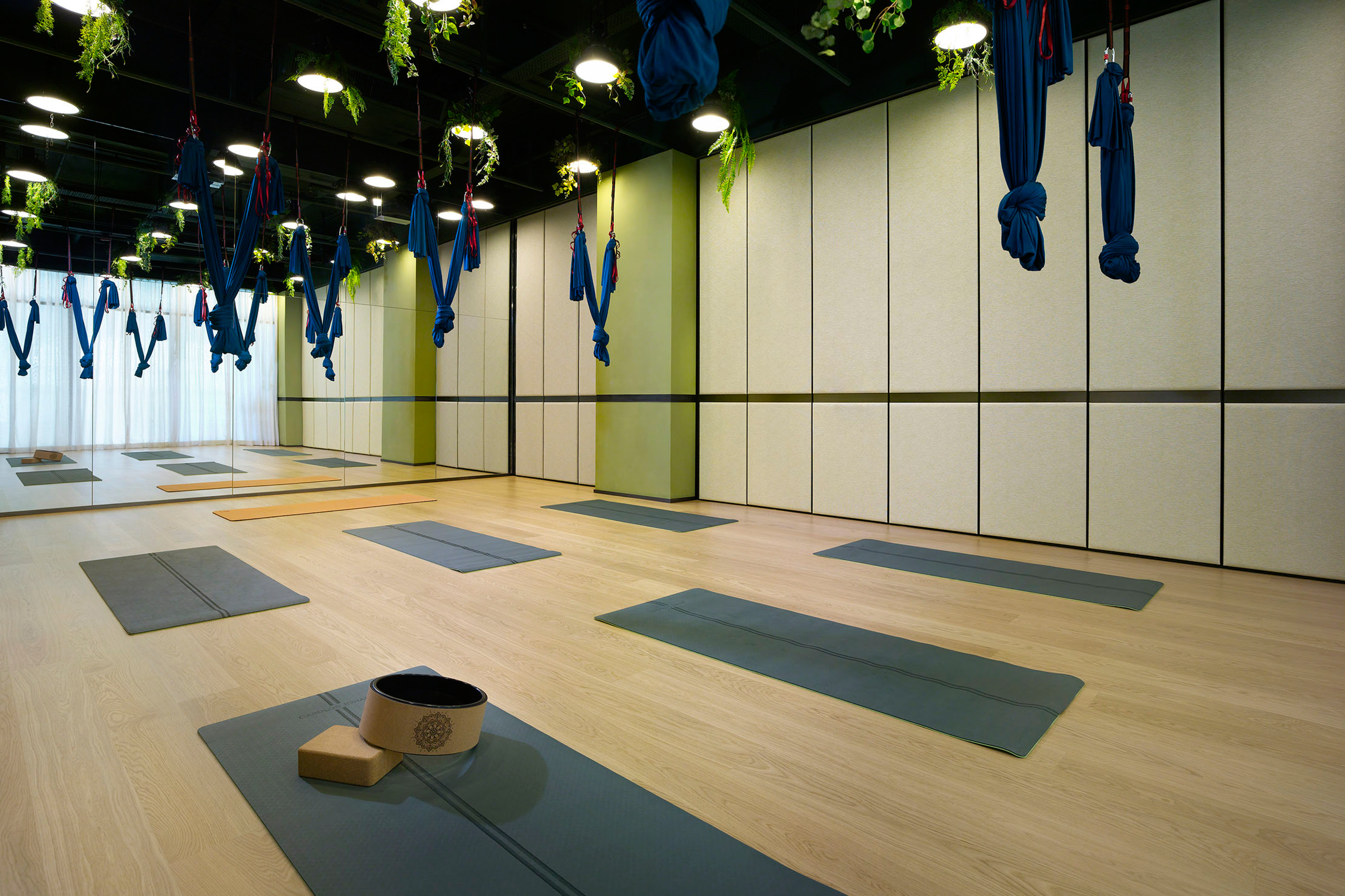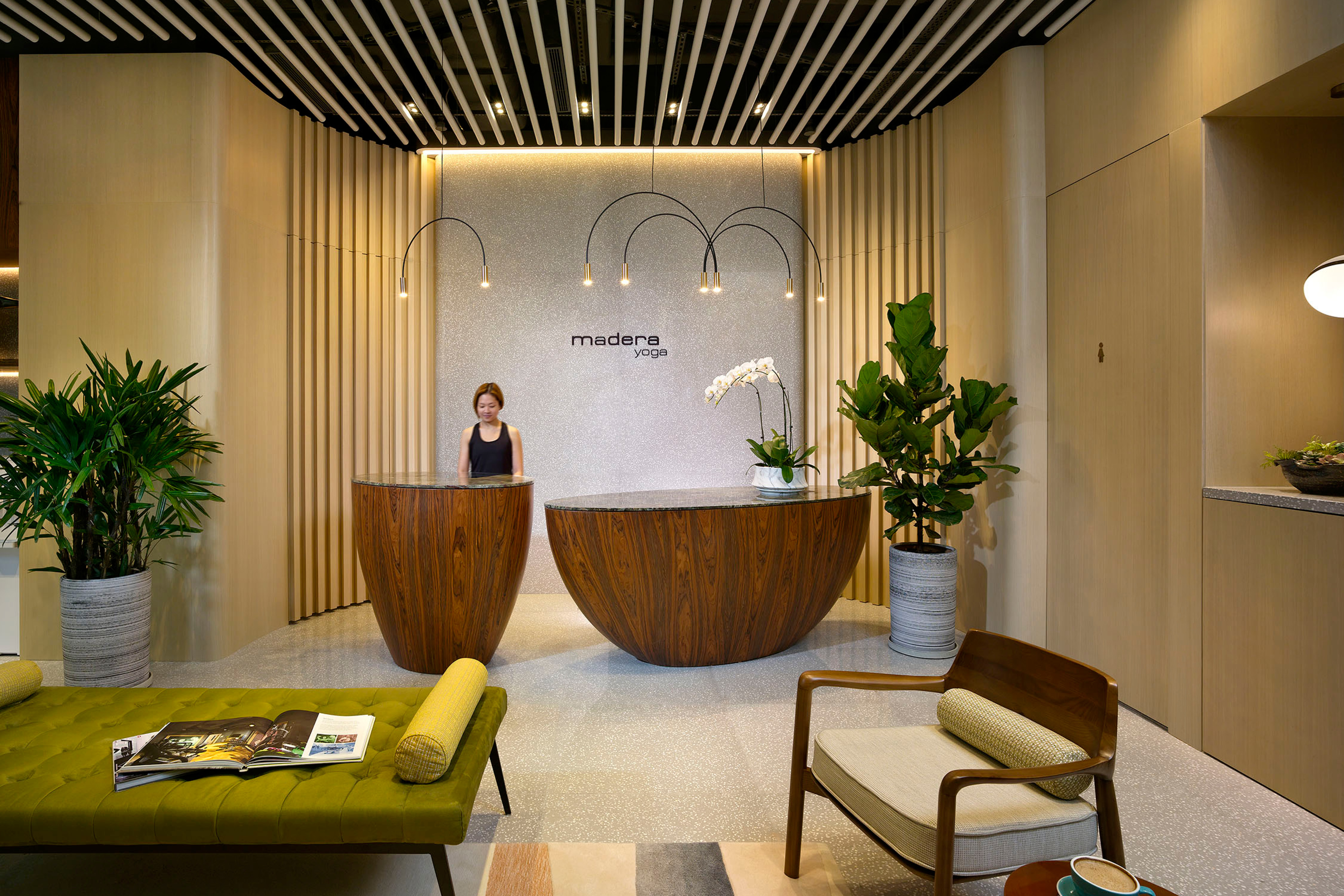 Nestled in a prime location in Jordon of Kowloon, Madera Yoga is a new addition to the Madera Complex with chic hotel, serviced apartment, F&B outlets and etc. It creates an intimate journey that starts from yoga and extends into surroundings, for the full restoration of mind, body, and soul. The harmonious and natural design of Madera Yoga is set to deliver an oasis of tranquility and serenity to the guests to find their inner state of peace once again. The interior is based on human centred and green infused design, extract colours from nature, from flourishing rainforest to beautiful and peaceful wilderness. The common area is more of a natural stone, textured wood with rainforest green and peachy orange, whilst the studios are more of a muted lime with butterum timber, dark metal and blossom greeneries. It is not only a space for exercise but also a space for feeling the heart of the peace. The 4,000 sq.ft yoga centre lavishly appointed classrooms ranging from 245 sq. ft. to 1,295sq. ft., each boasts 4.5m high ceiling and view of the city. World-class equipment are available for all kinds of yoga.