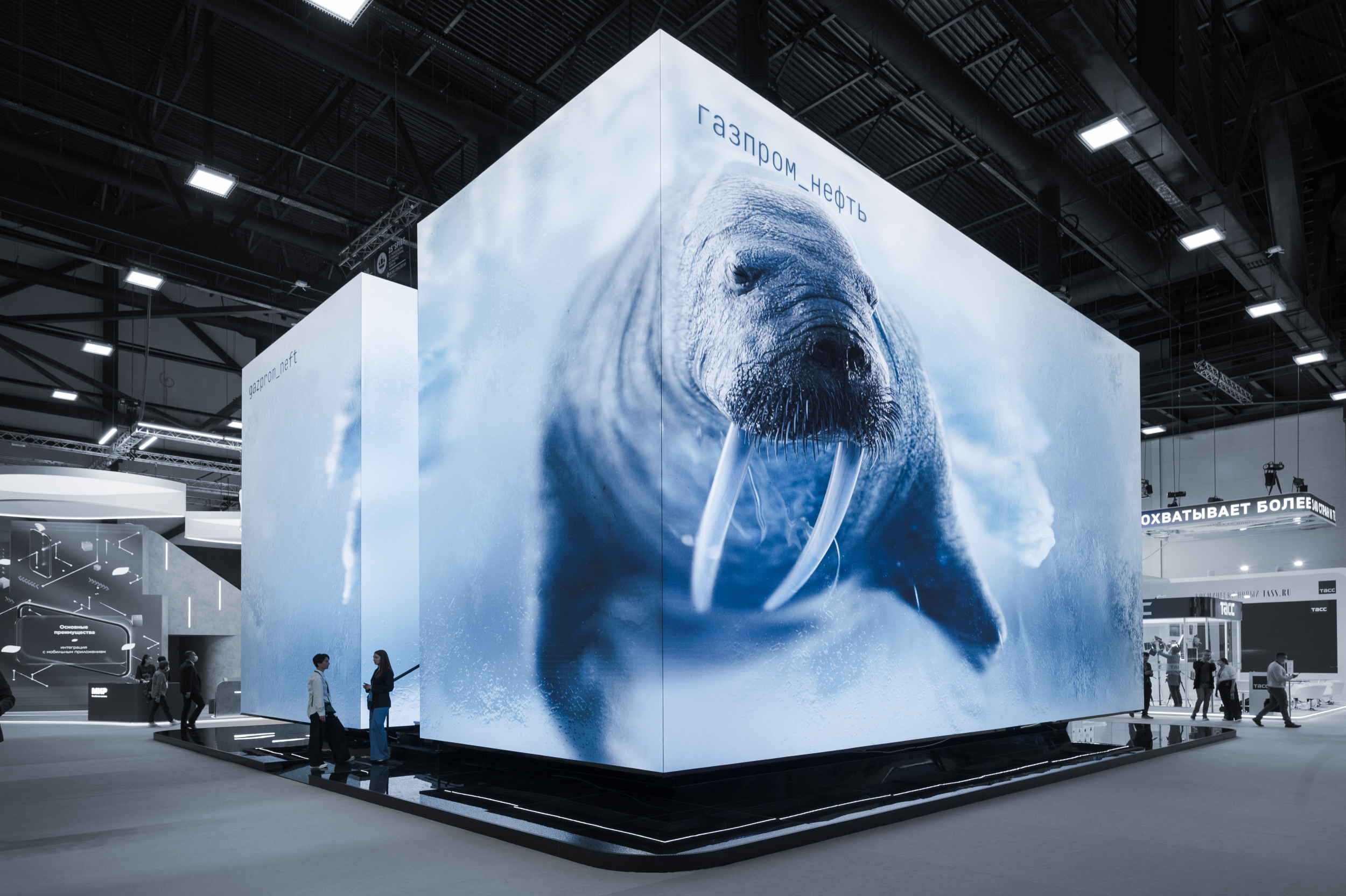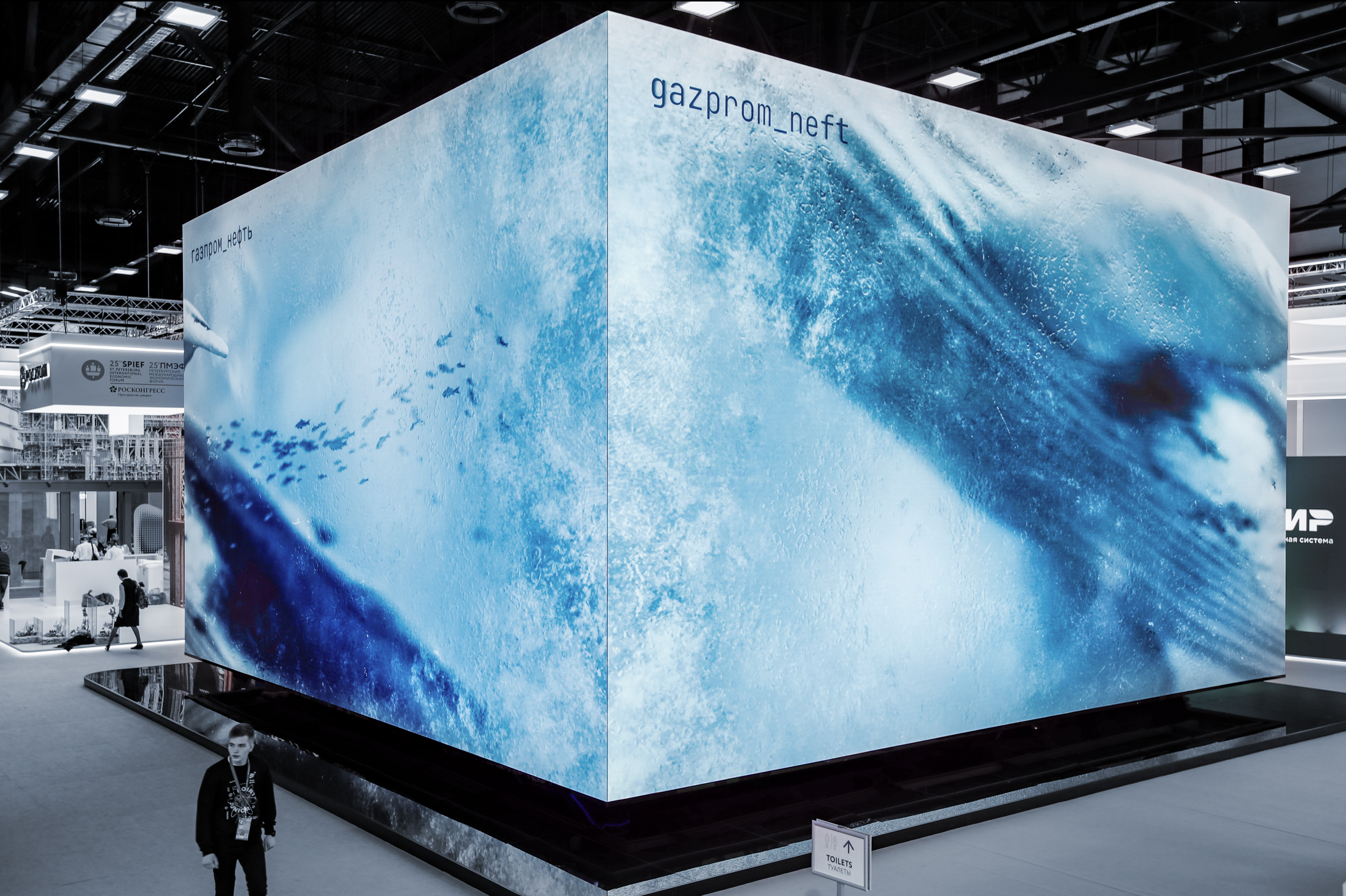 Gazprom Neft, in collaboration with Radugadesign studio, presented the art project “Into the Arctic” at the St. Petersburg International Economic Forum. A two-storey booth appeared in the centre of the main hall – a giant “ice” cube, which became a portal to the world of the Far North and its marine inhabitants. The studio developed the concept of the installation, created a motion design with naked eye 3D effect, designed the interior, and the visual identity of the project.