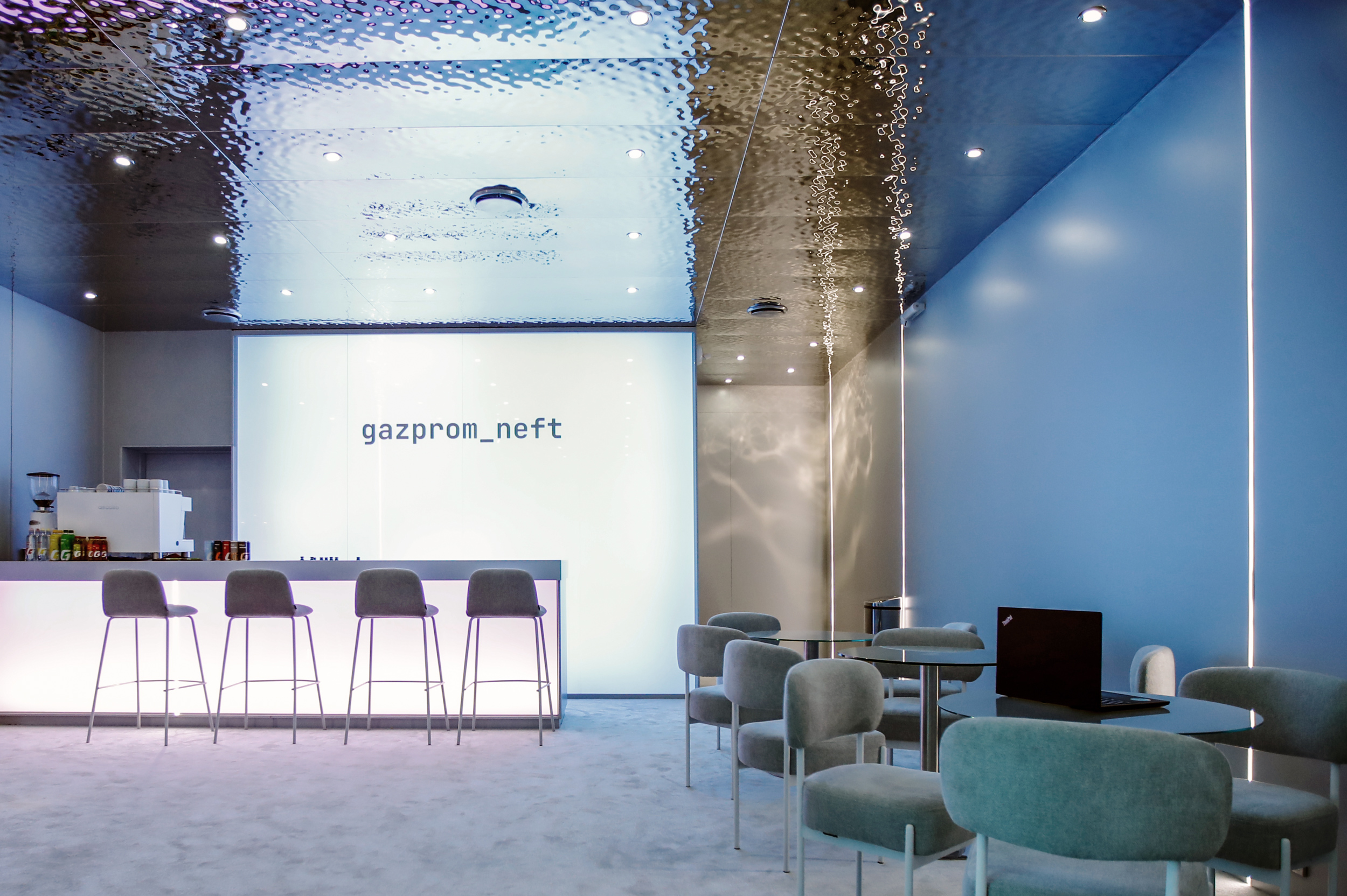 The interior for several multi-purpose spaces of the booth was also designed by the studio. The entrance does not have any massive signs and presents a hidden passage between the perfect vertical cuts opening on one of the faces. Everyone entering seems to disappear from the field of view, because they take a step to the side to get into the “ice block”.