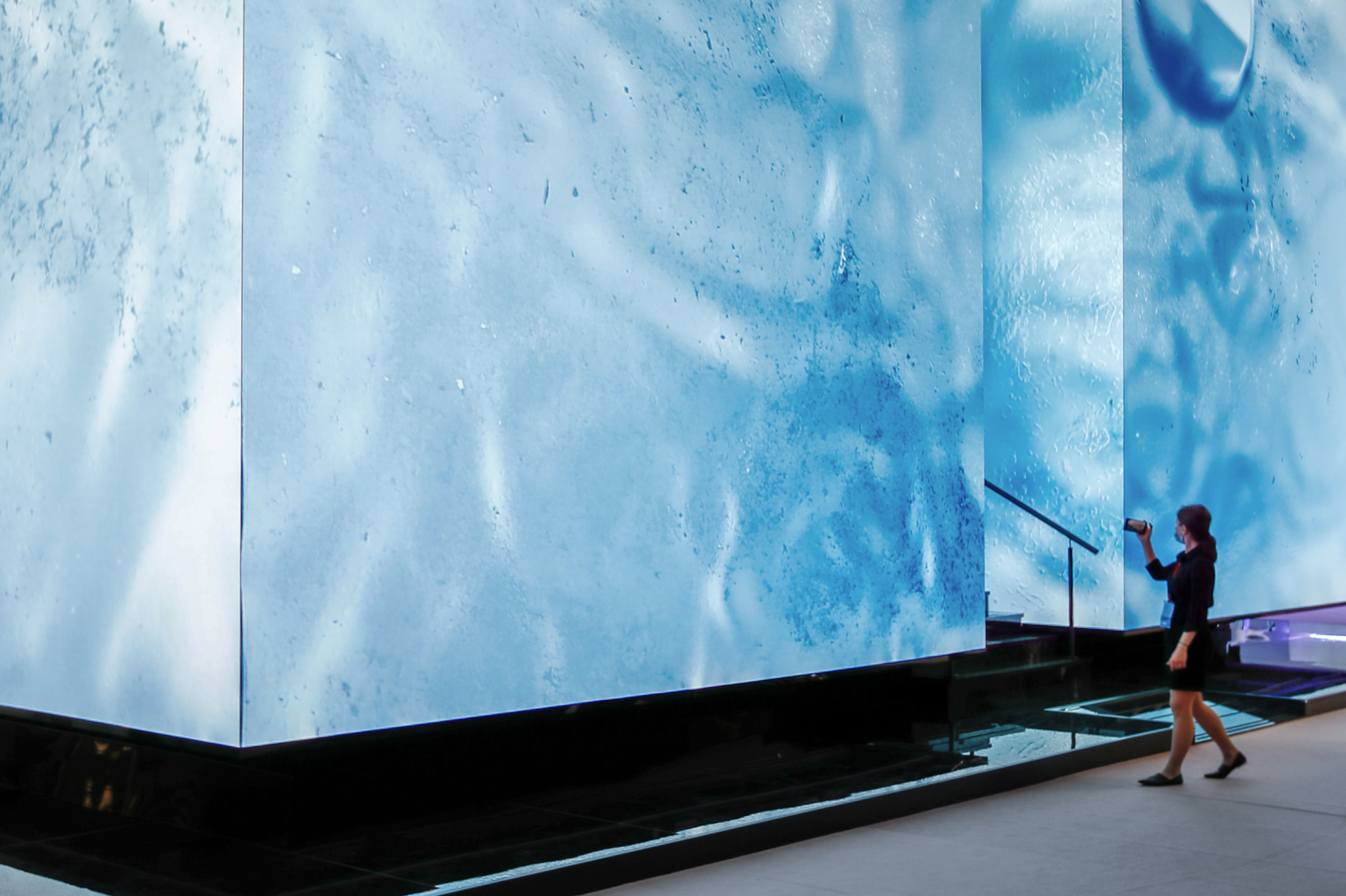 The installation “Into the Arctic” is an artistic exploration of the ambiguous relationship between human and infinity. The design of the monumental cubic installation depicts the power of the Arctic, its largeness and simplicity make it stand out among the crowded space around it. The cube levitates above the black floor with a reflective surface, which makes it the centrepiece of the venue.