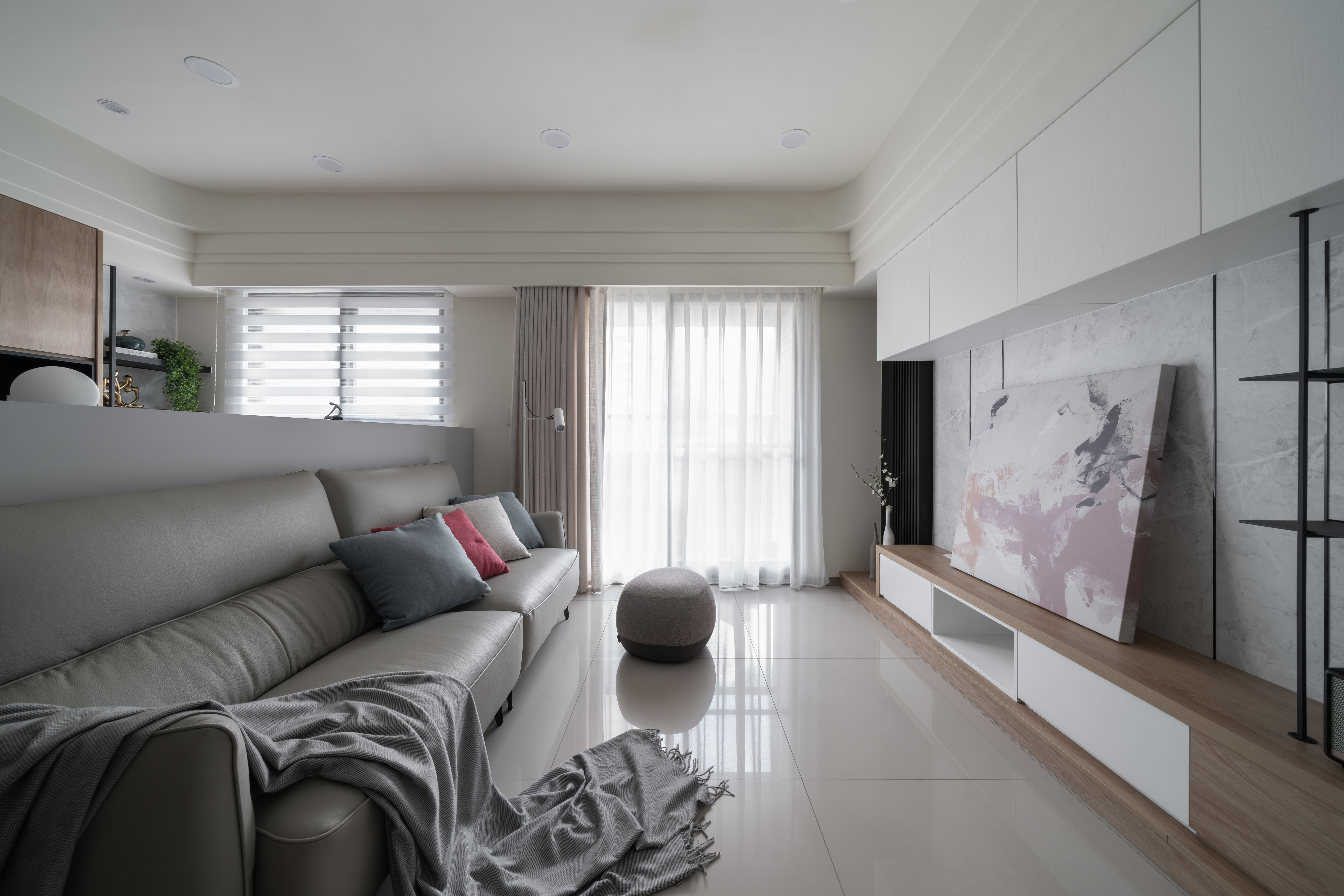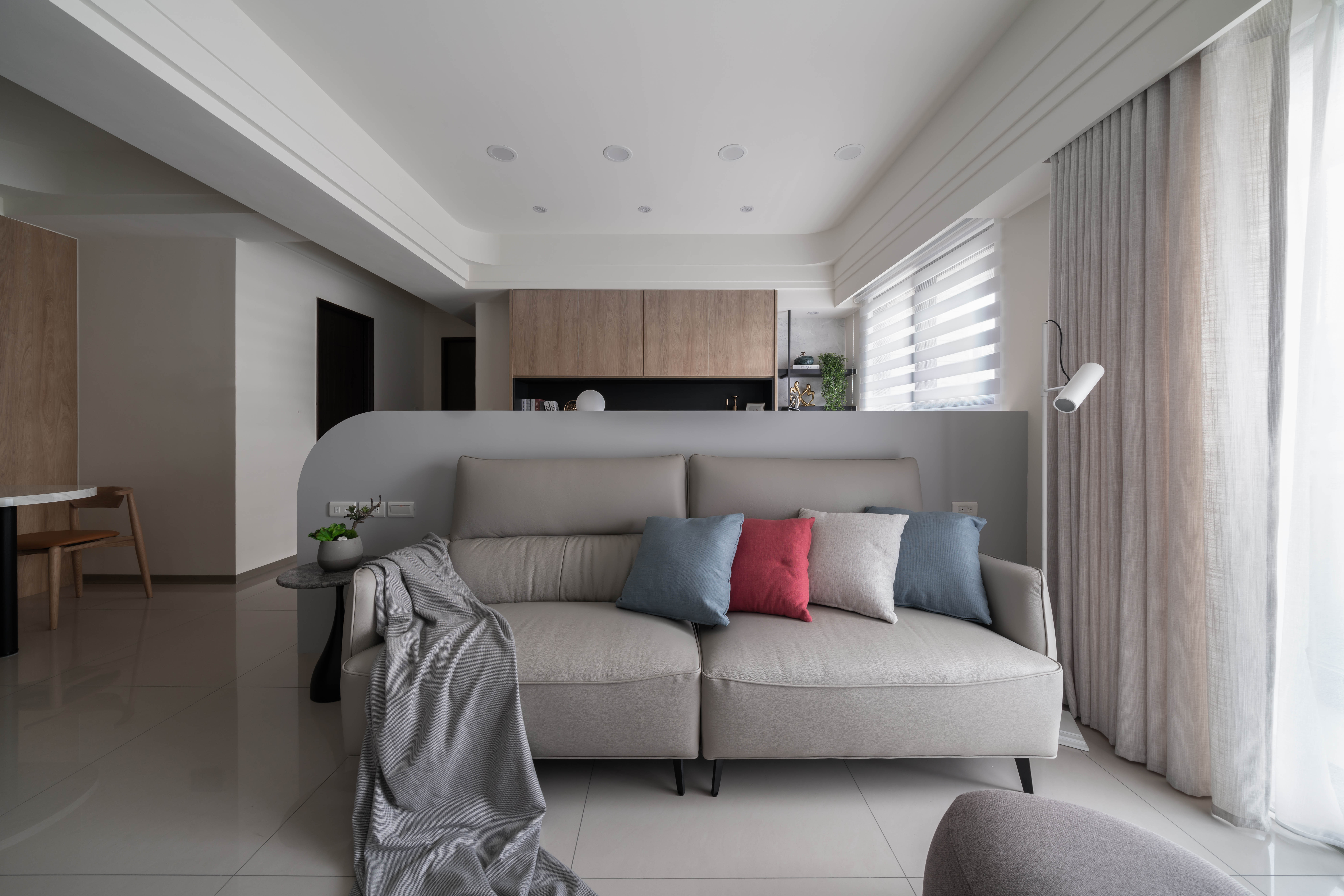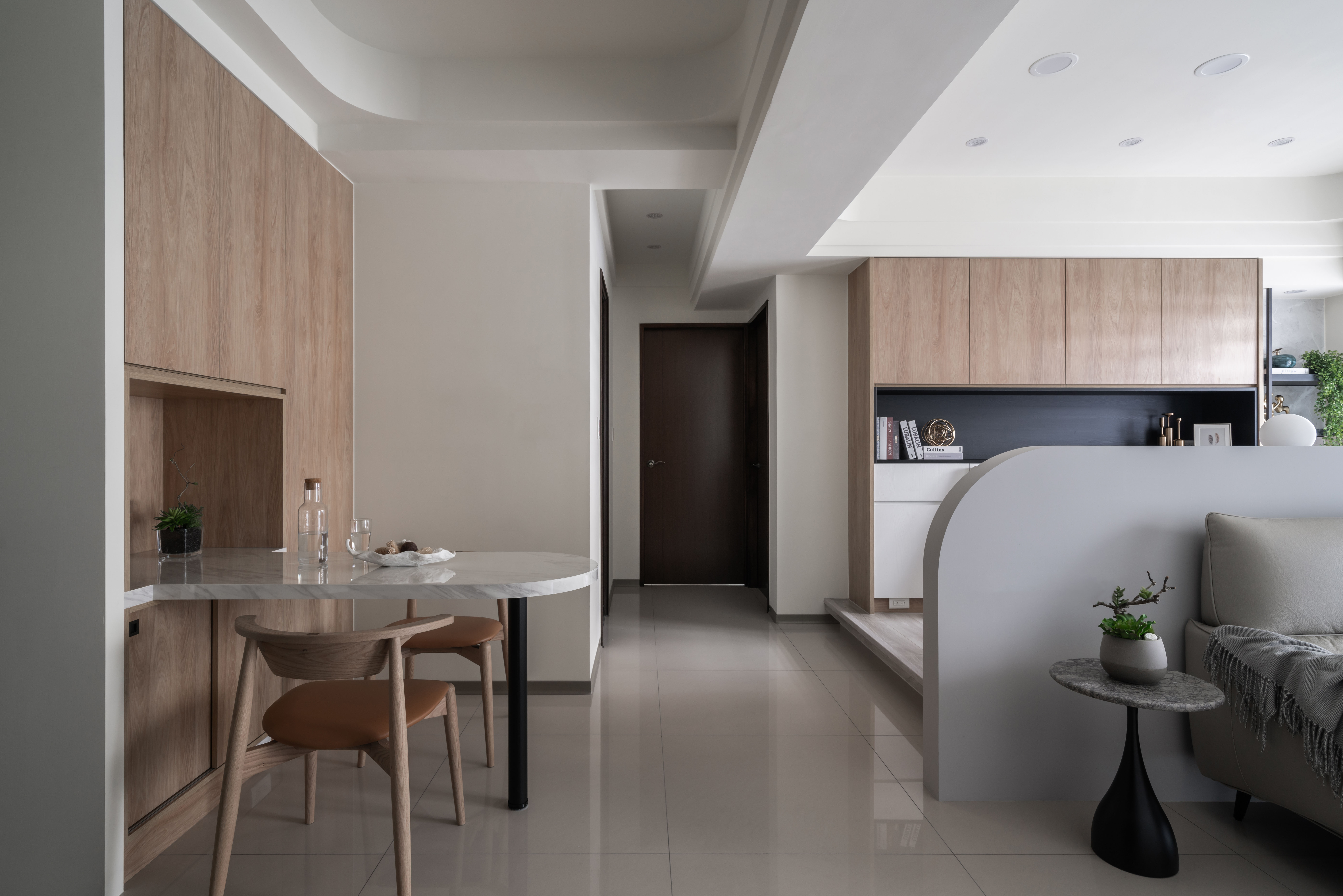 As one enters the interior, arc shapes, which eliminate the intense sense brought by corners, can be seen at the entryway and the dining room ceiling. As for the key figure of the living room’s sofa area, circular arcs have once again been used to trim angles to create a gradual and balanced visual effect while echoing with the modeled ceiling. Meanwhile, the dining table is also decorated with the same elements to build a solid heart-warming vibe. Moreover, the interior's outline, colors, and grains are decorated in a neat and simple manner. The rich color selection eliminates the dullness while creating a sense of elegance and vogue for the modern-style residence.