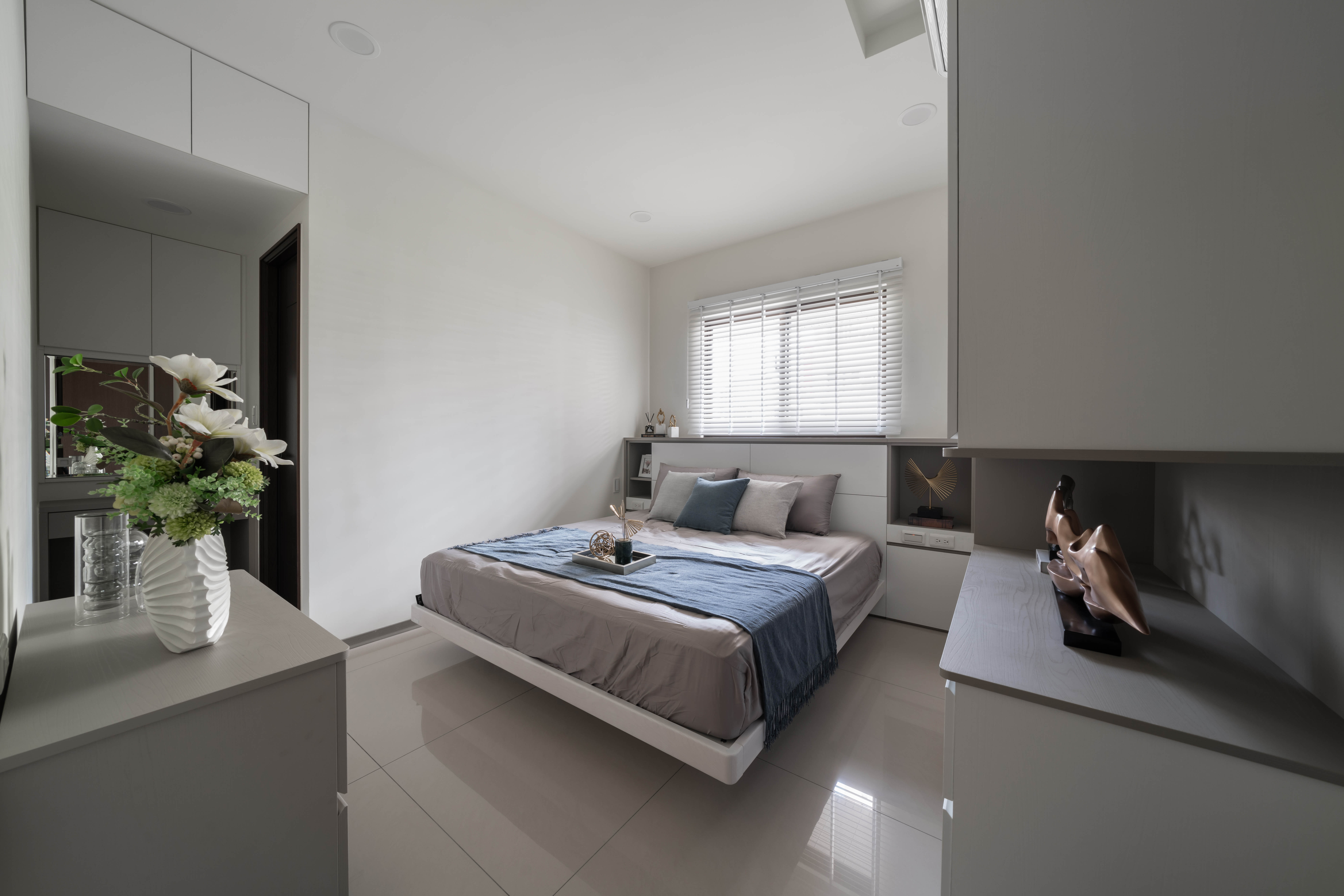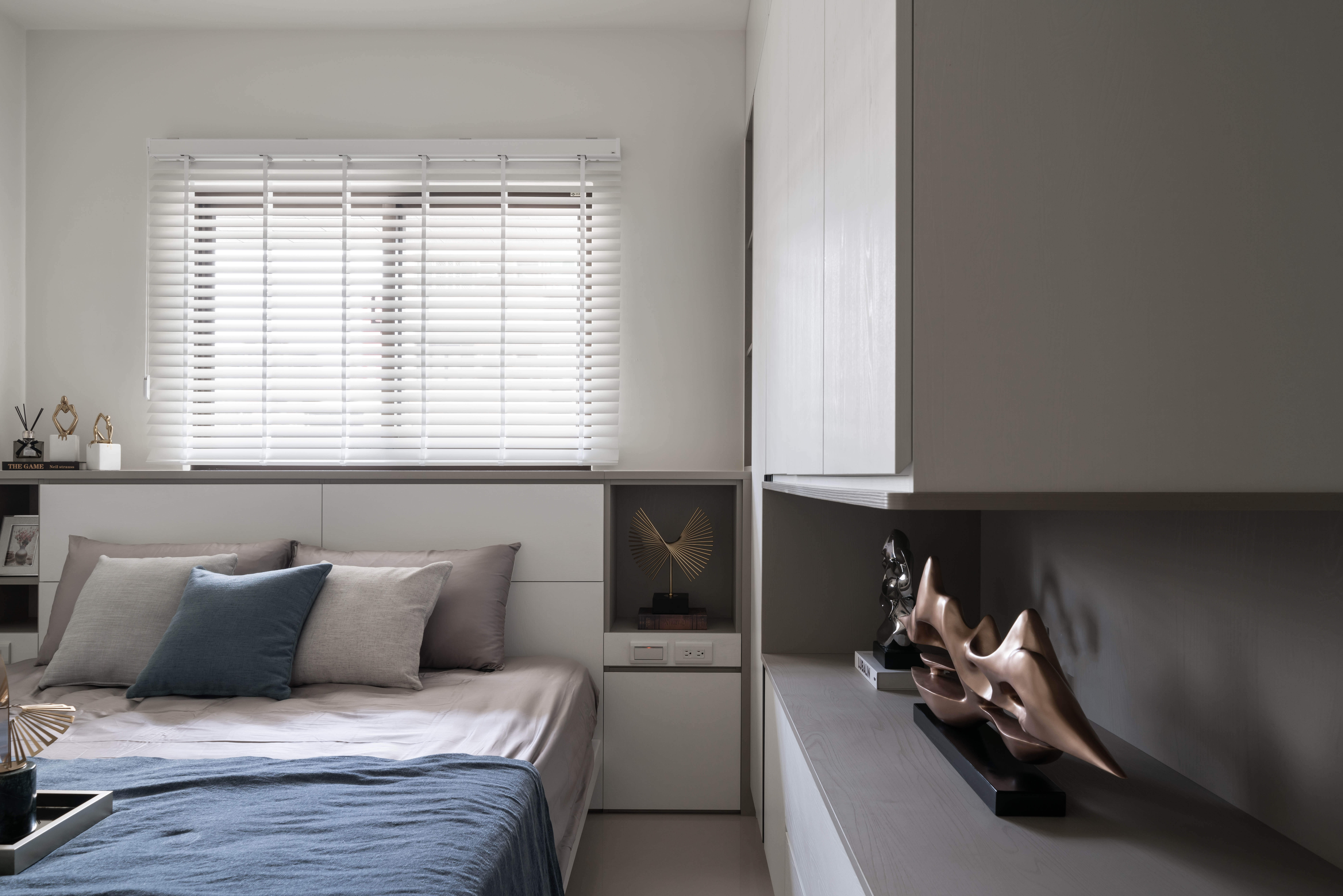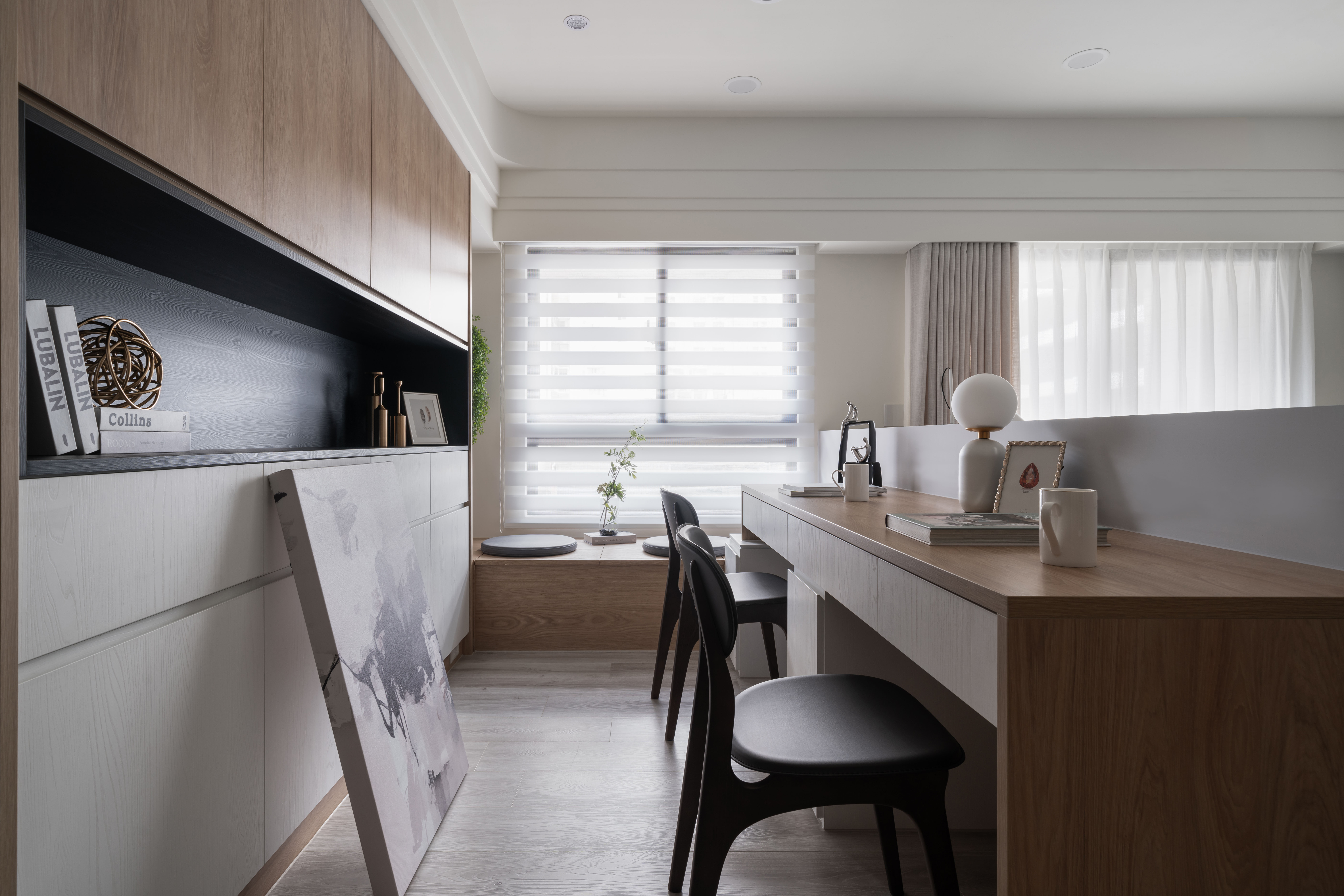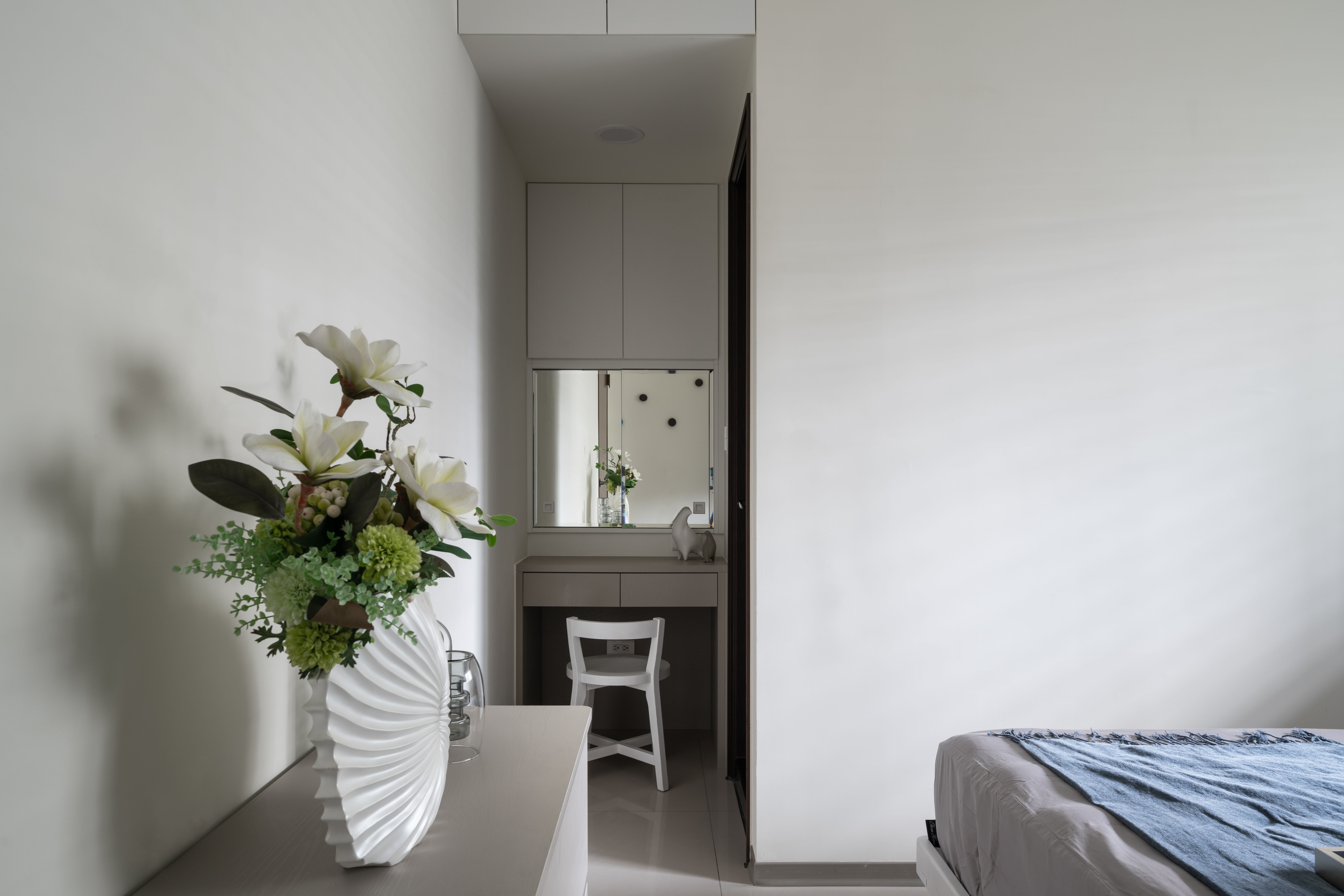 The corners of the ceiling are modeled in arc shapes to eliminate the sense of pressure. The elements are extended from the ceiling to the dining table’s surface to create a pleasant visual experience. At the same time, the sofa wall, which is set up next to the dining table, is also trimmed with the same method to create a smooth and artistic spatial feeling. A large-scale closet can be seen as one enters the master bedroom; the item has satisfied the owner’s requirements of having sufficient storage space. Meanwhile, the middle part of the closet and the area next to the bedside are set up with display shelves, an arrangement that gives the room a sense of rigidness and softness. Furthermore, a distorted area in front of the master bathroom is also well used. The team took advantage of the corner and planned it into a small-scale dressing table according to the user’s living habits. Users can use the table to store items or groom themselves, making every-day-habits more than just routines but enjoyable leisure.