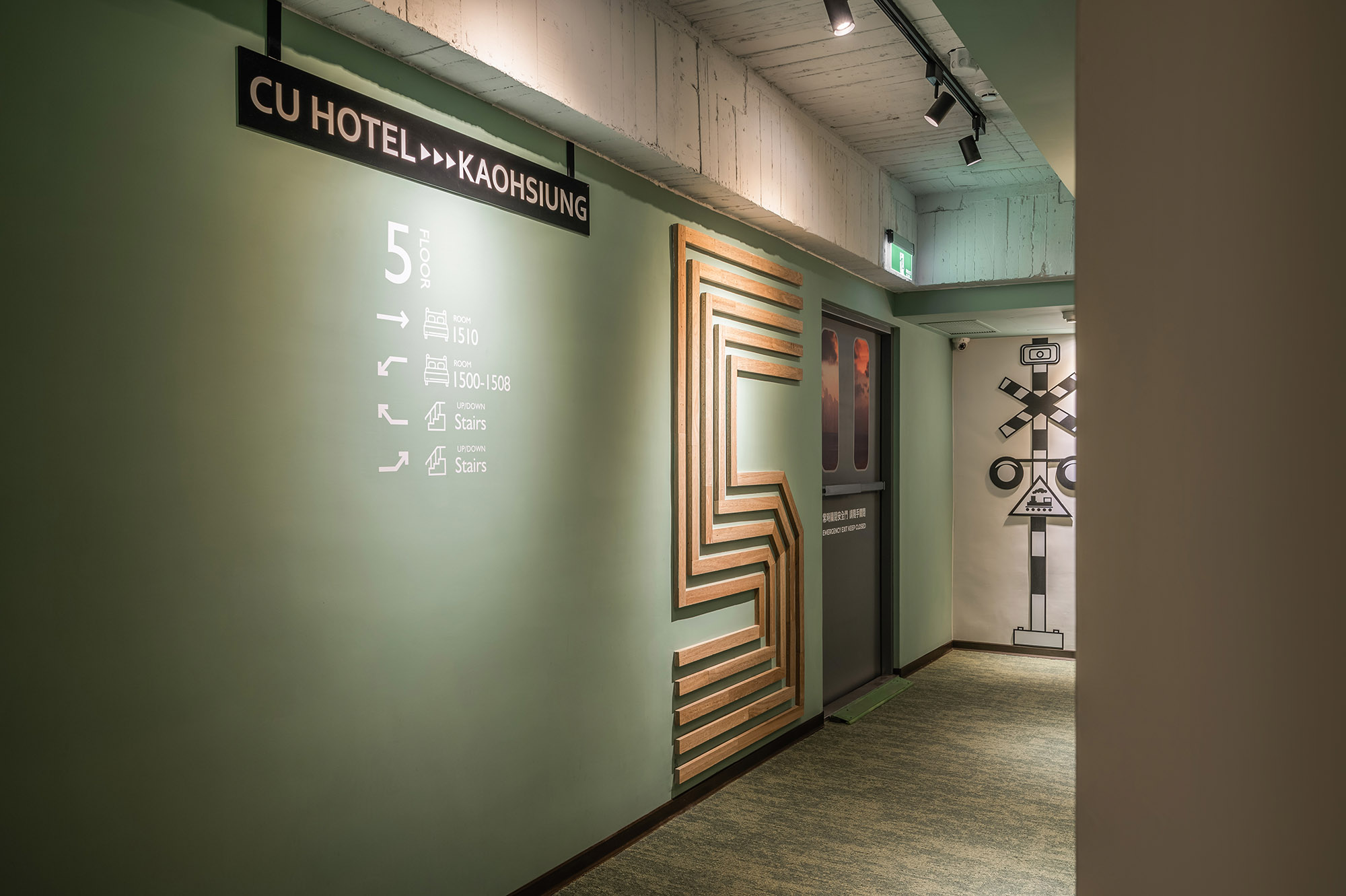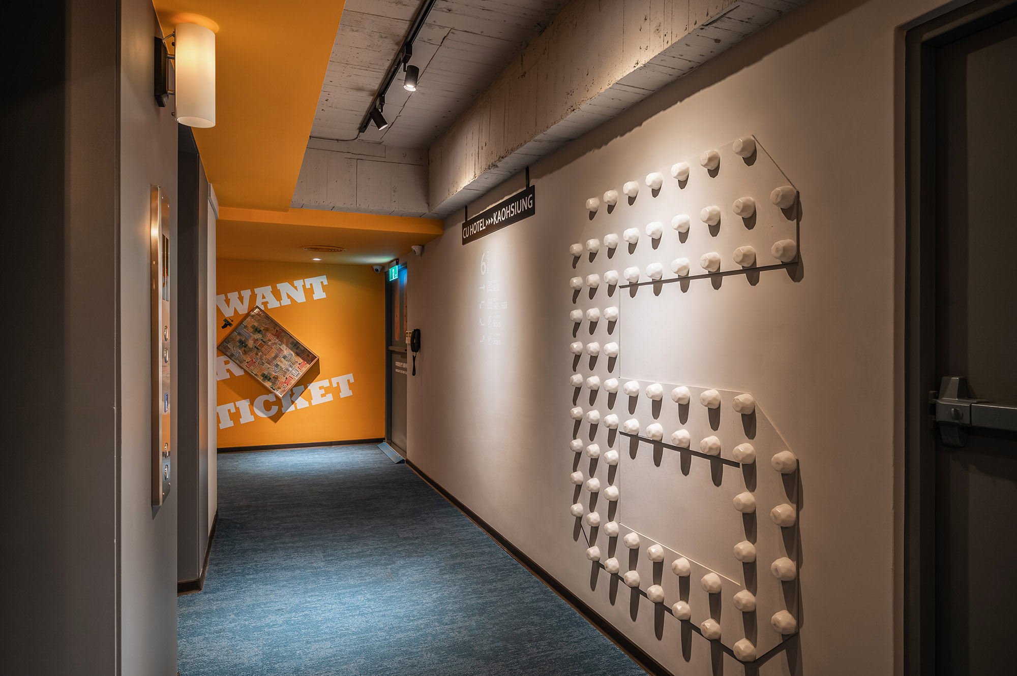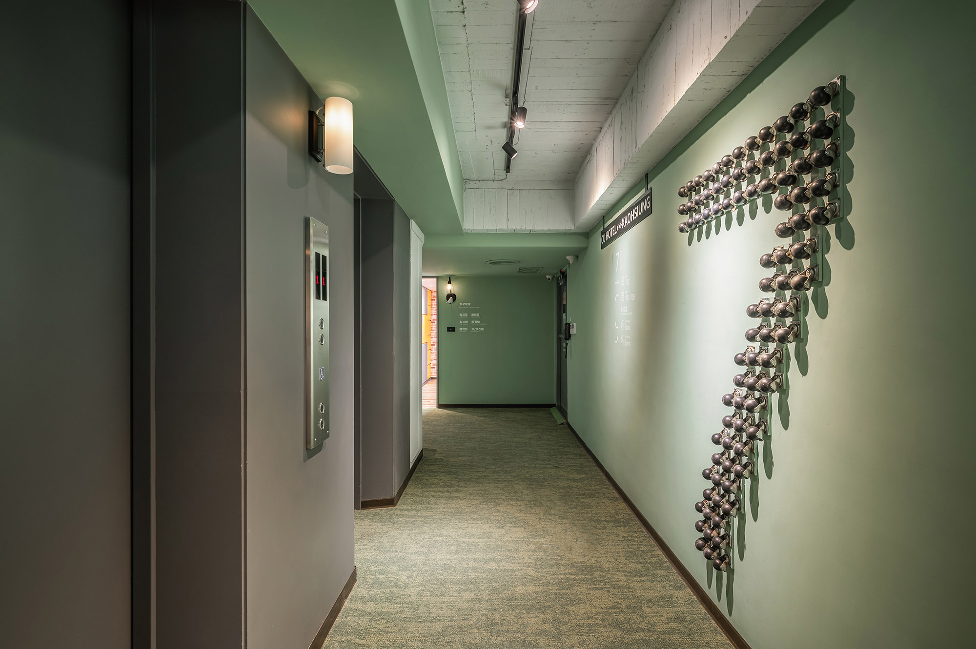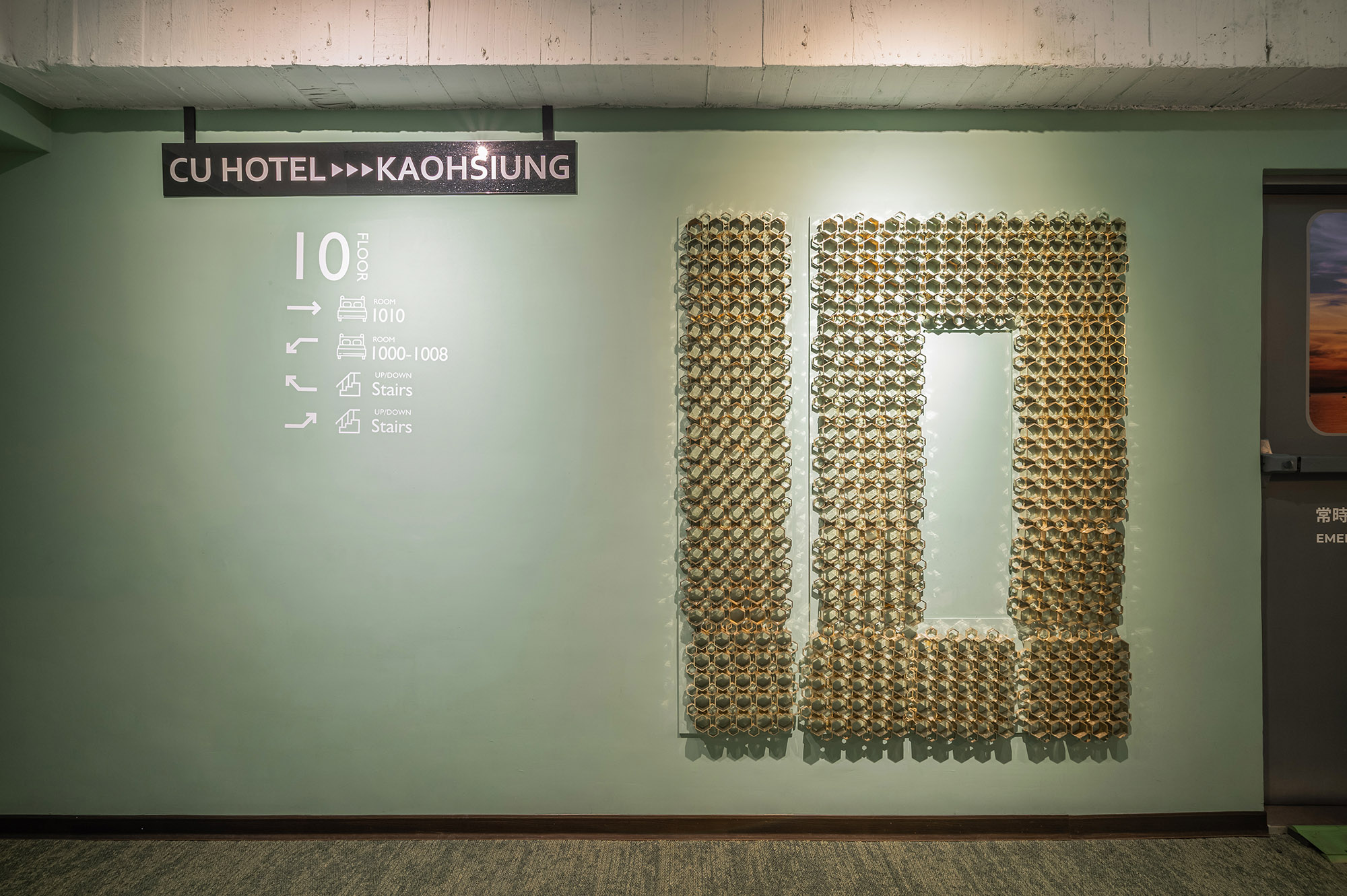 The wood used in this project is all dismantled from the old furniture of the original hotel. Since the wood materials used at the previous establishment were in good condition, the designer recycled all of them to realize the concept of environmental preservation. In addition, the floor numbers in the staircase lobby are made from the mattress components that were to be scrapped, and the same type of components was combined to make the staircase, which also realizes the idea of recycling.
