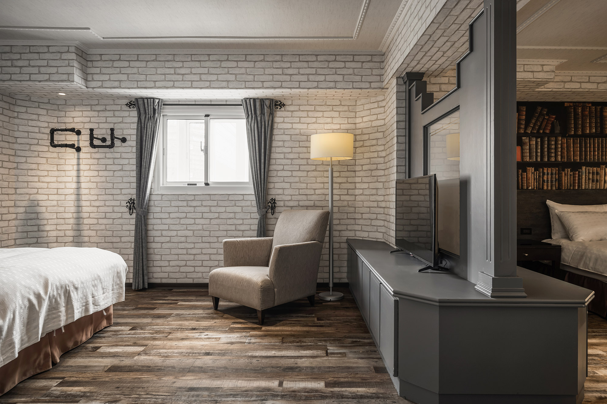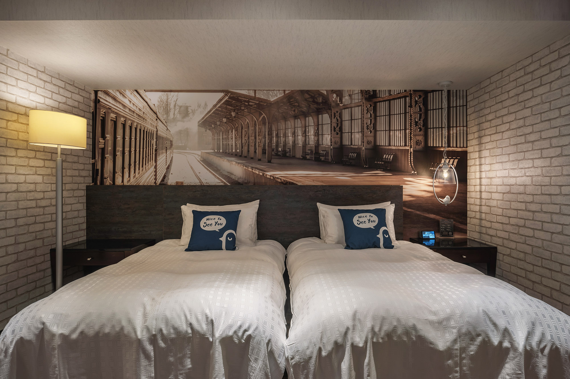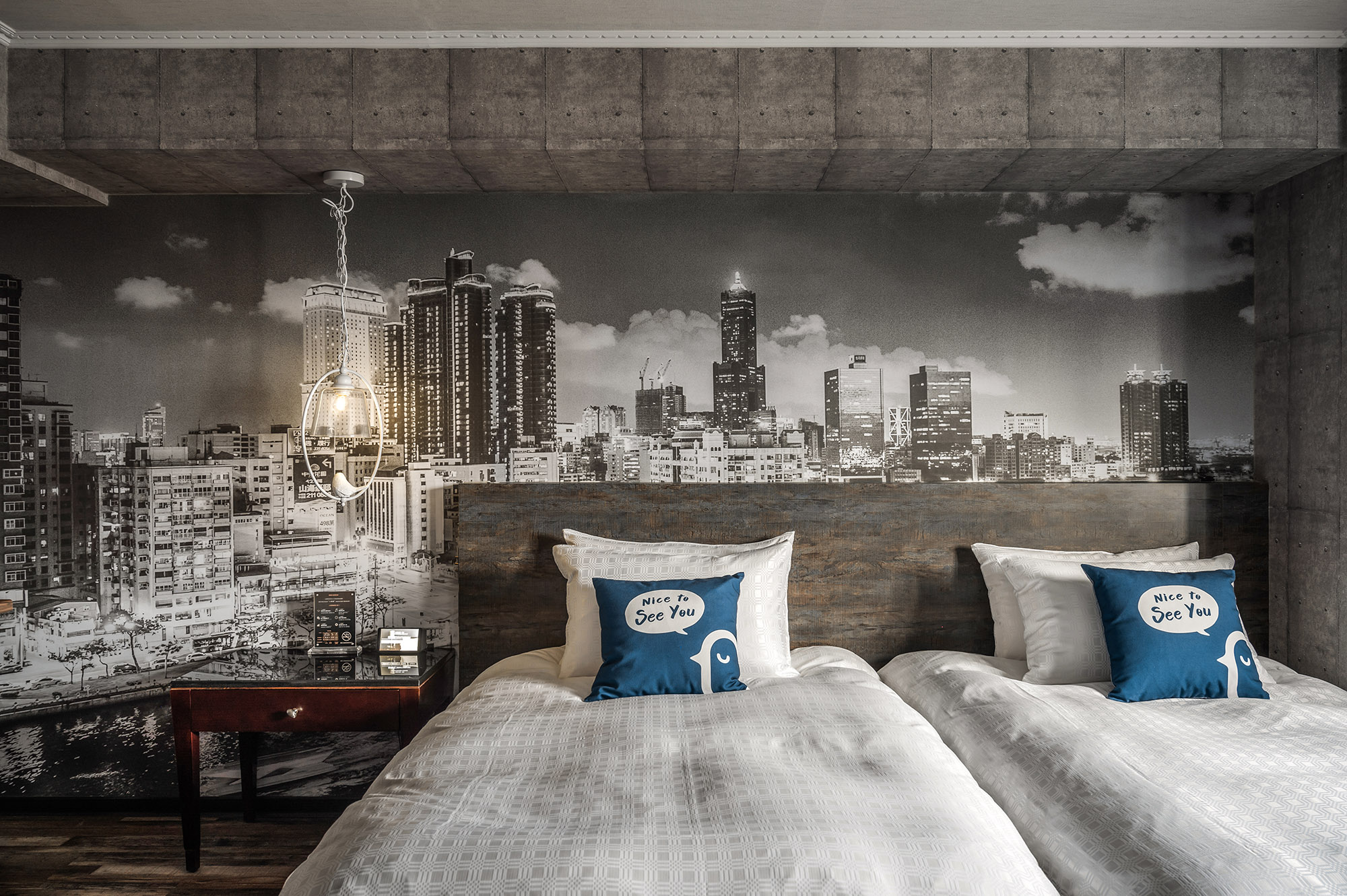 Standing in front of the door, one will notice the gray and blue color scheme standing out from the background. The solid wood panels on the ceiling and floor are reassembled from old materials. As the former hotel has run for nearly fifty years, many old mattresses were to be scrapped. However, after a discussion with the client, the designer decided that the old materials would be retained and rebuilt into a new look with the concept of making the best use of them. Upon entering the foyer, one will be impressed by the migratory bird decorated in the space, combined with the words on the blue wall, highlighting the theme. Walking along the turf ceiling, individuals will feel relaxed and refreshed. Besides, some design details can be found on the firefighting equipment, which brings a sense of fun. Moving slowly to the bedroom in the personal living area, the primary spatial focus of the space is made of raw concrete and white tile wall wallpaper and wood grain flooring, giving the room a light industrial style. On the other hand, the hangers are made of black iron pipes to create the hotel's name and echo the space’s style. Interestingly, elements related to the local surroundings and culture, such as railroad tracks, night scenes, and tourist spots, are adopted as bedside wallpaper patterns so that the indoor space and outdoor scenery can reflect each other. The migratory bird-shaped lamp hanging in the room reverberates the theme.