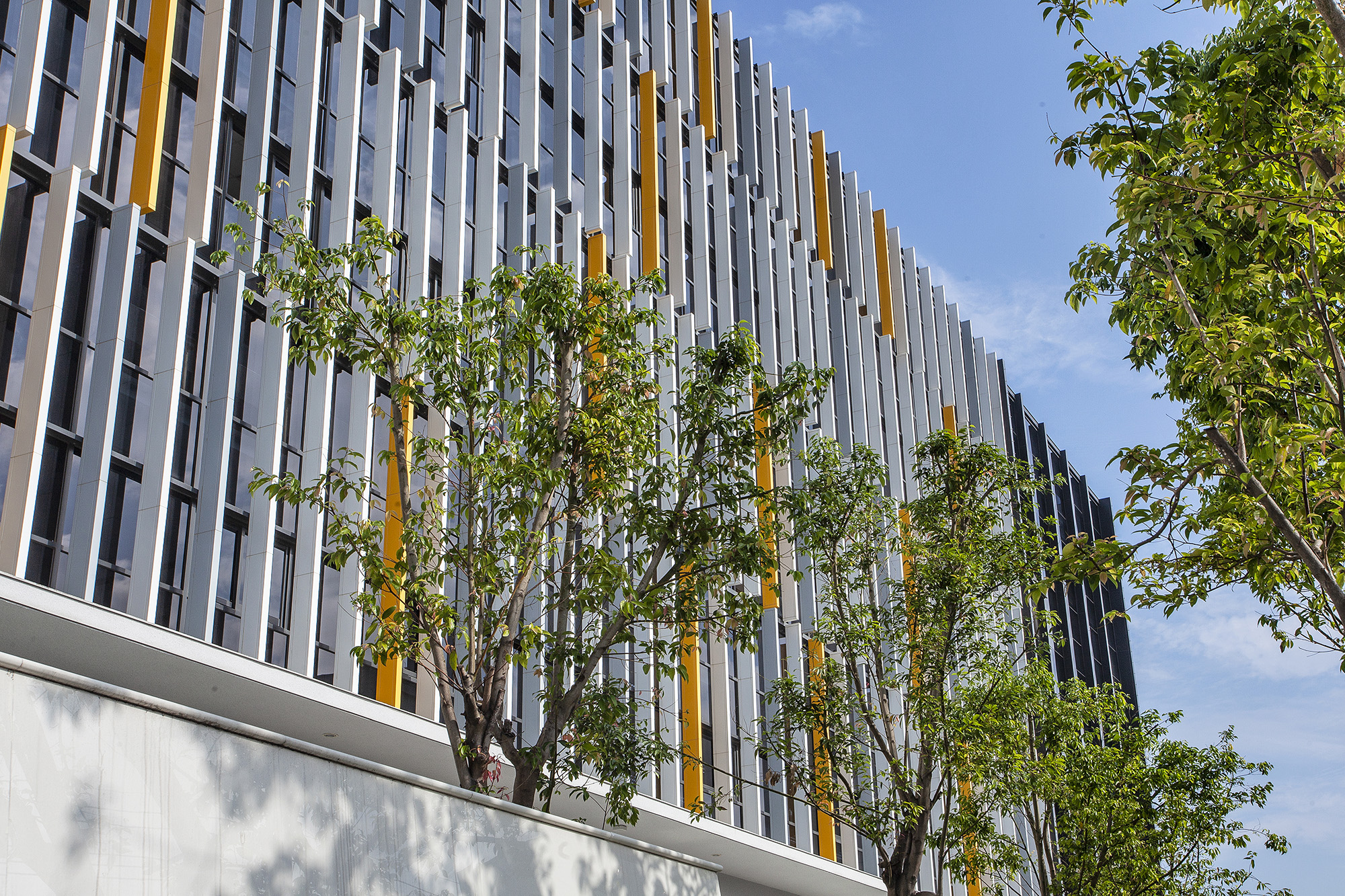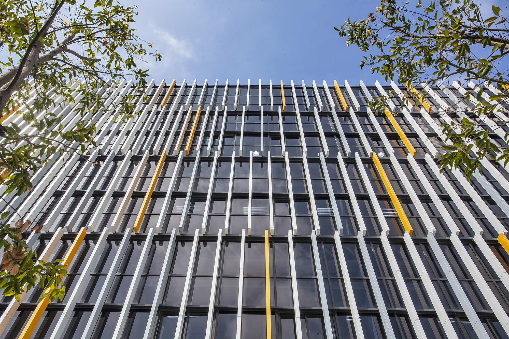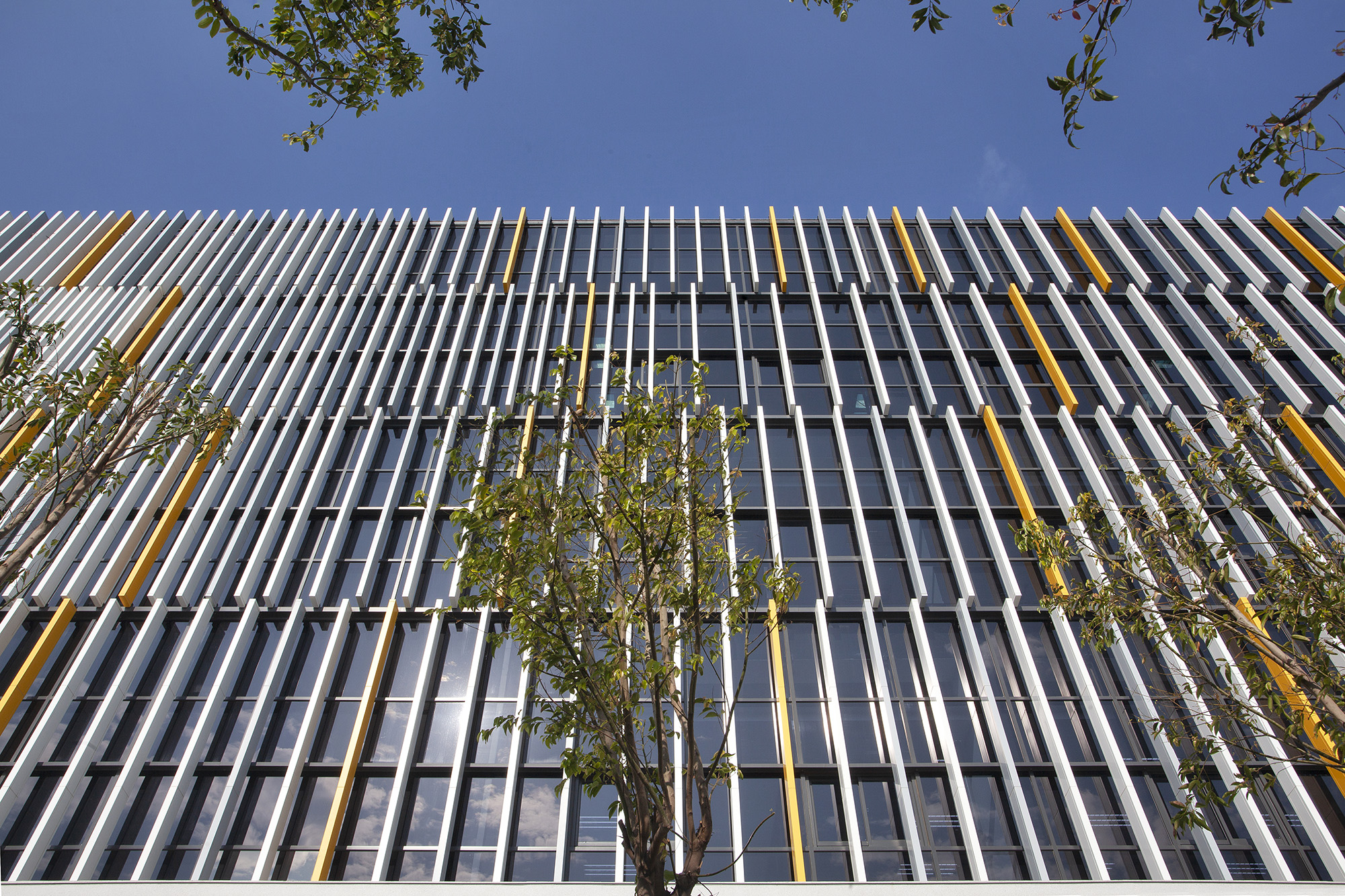 The front of the building is made of glass curtains and metal grilles to create a modern look. Through the careful planning of the design team, not only the mechanical parametric design is used to calculate the angle and size ratio of each grille effectively, but also the building-related fire regulations are taken into consideration to create a mobile and rotating grille design. The horizontal and vertical divisions are cleverly used to present the visible and invisible frame effects, making the metal grilles seem to float on the glass curtain, offering a unique visual experience. The design team has made unique use of the grille configuration, from the right side to the left side of the front of the building, to create the image of gradual layers. The rightmost side of the building is fully permeable, a metaphor for the main entrance location. The application of glass tiles gives the same glass material a different visual variation, showing a consistent and versatile effect.