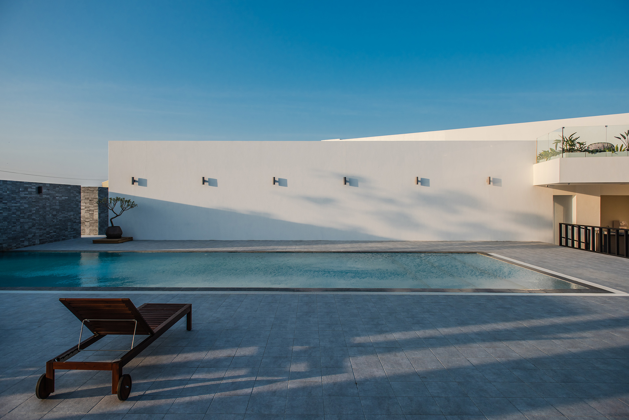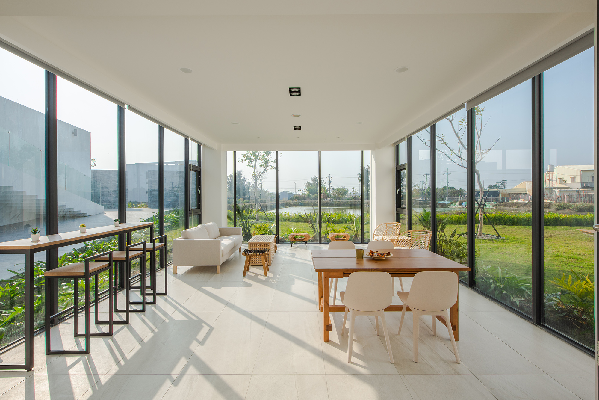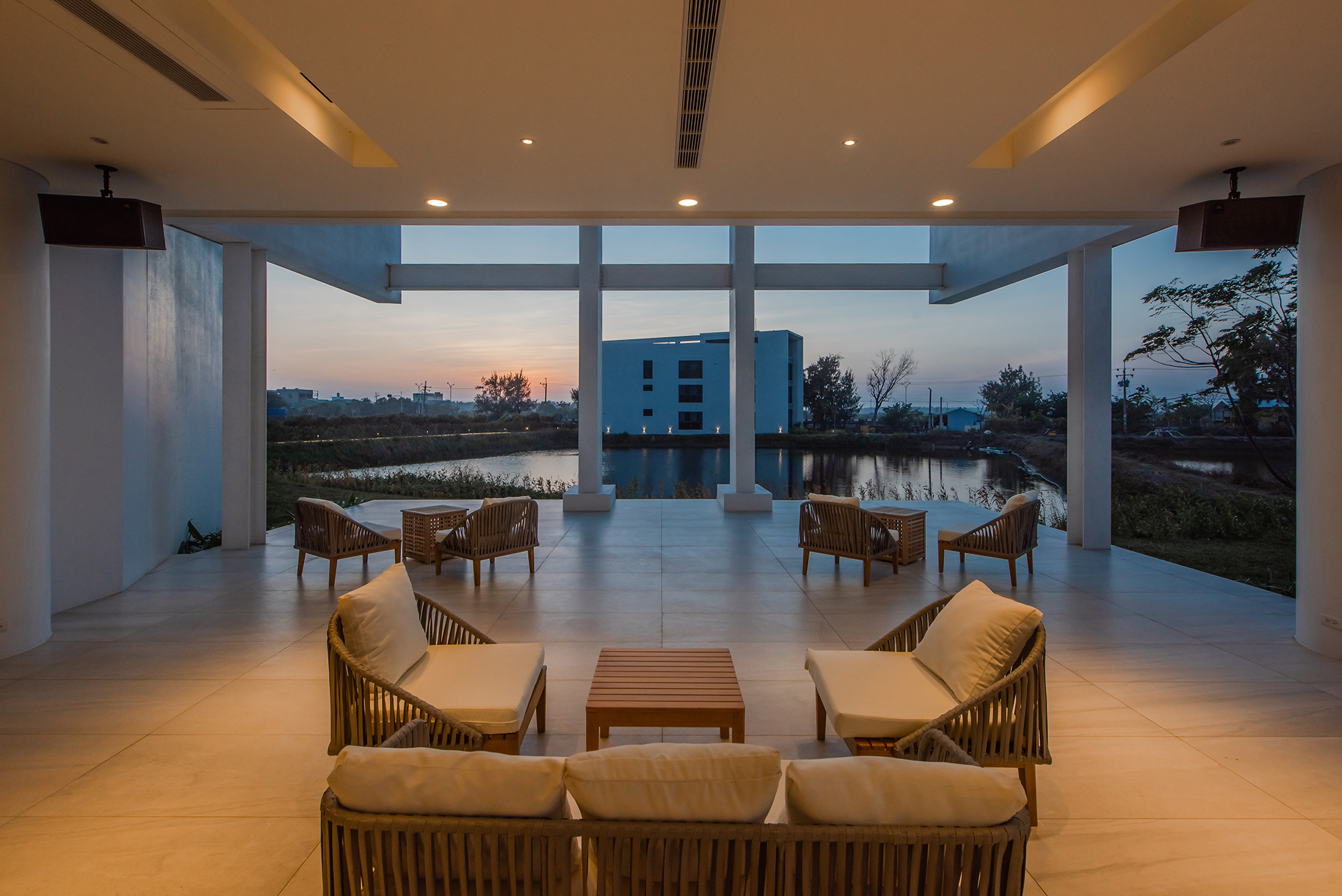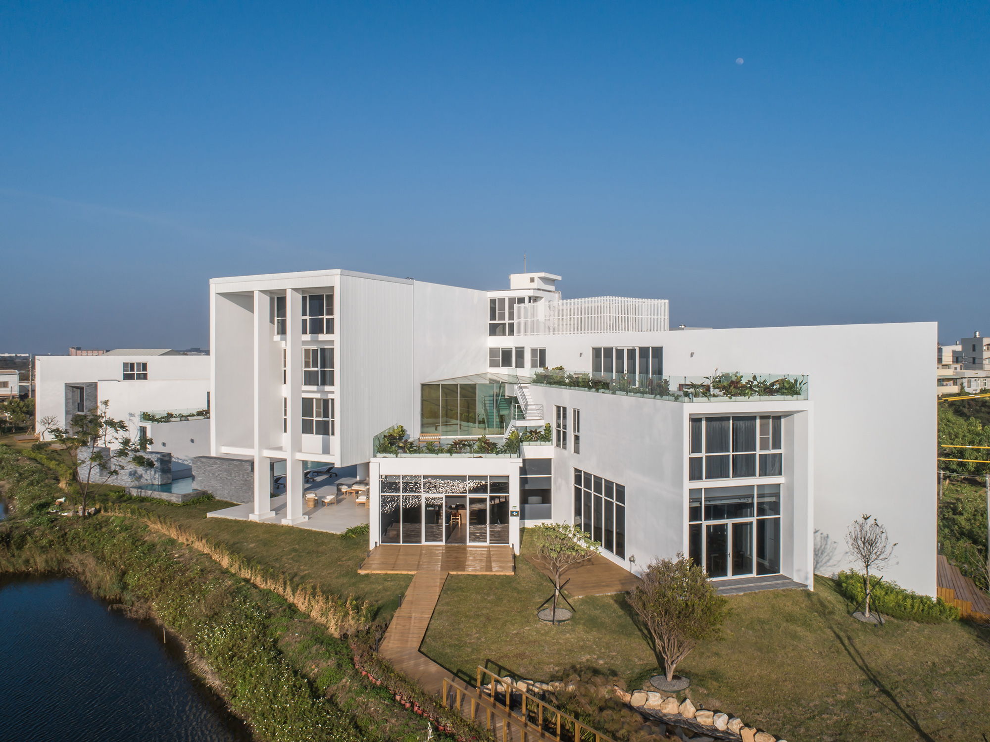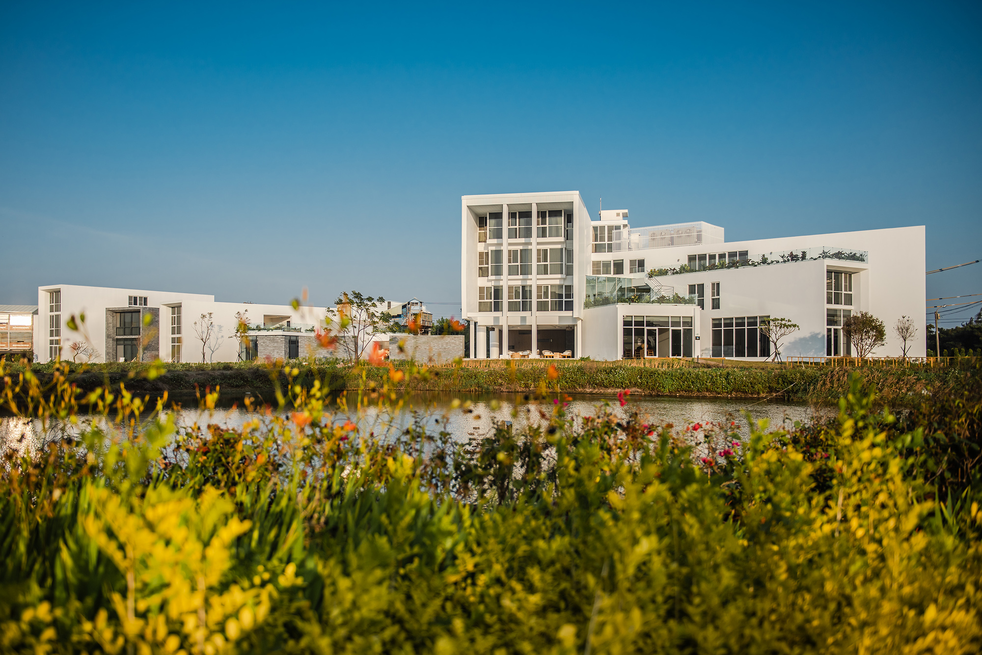 Inspired firstly by the local oyster farming industry, the basic color of white represents the oyster shell. With each building and outdoor spaces such as a semi-open corridor, landscape patio, swimming pool, the overall traffic flow is connected and immersed with the environment. Inside the buildings, big floor-to-ceiling windows are applied to decorate the interior with the natural vista. Thus, starting from the visual perspective, the boundary is blurred. From the swimming pool, to the fish farm, then to the seaside nearby, the visual perception of the horizon is broadened. What is more, buildings are arranged with adequate distances, and the interior spaces are spacious. Considering the local summer sunshine hours, designers carefully calculate angles, relative locations, shadows between buildings. Travelers can thus enjoy a different experience of outdoor spaces.