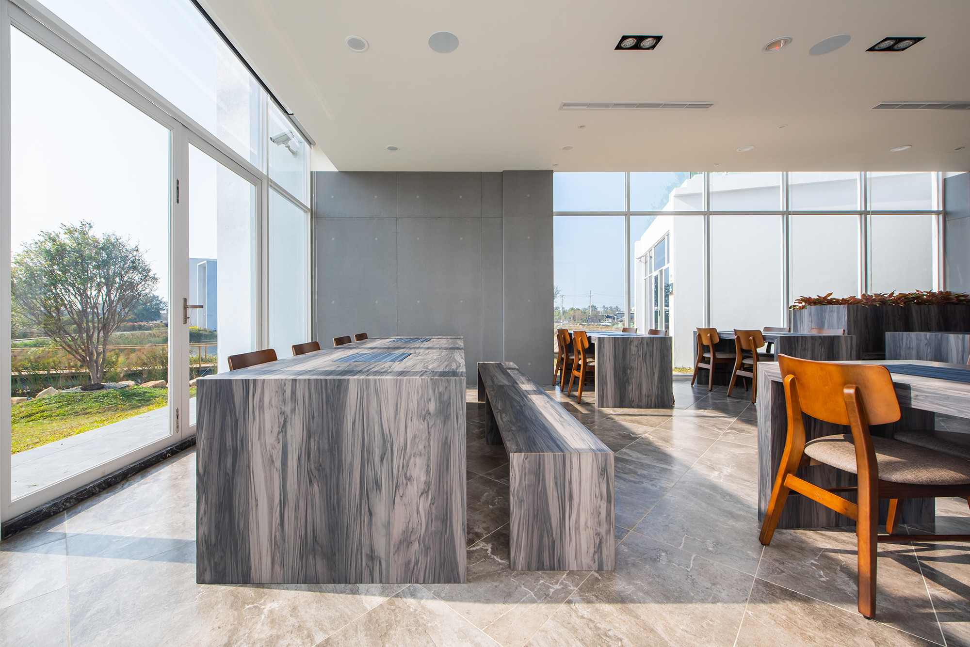 In this project, considering the heat, the temperature difference and the higher salt content in air in the south, the designer applied green building coating to the exterior of the walls, which not only is weather-resistant and lower the damage from the salt in air, but also reduce the emission of toxic chemicals and is better for the air. Meanwhile, the large French windows of the buildings introduce sufficient natural light so that the use of artificial lightings can be reduced. As a result, the life span of the lightings can be prolonged, and the power waste can be minimized.