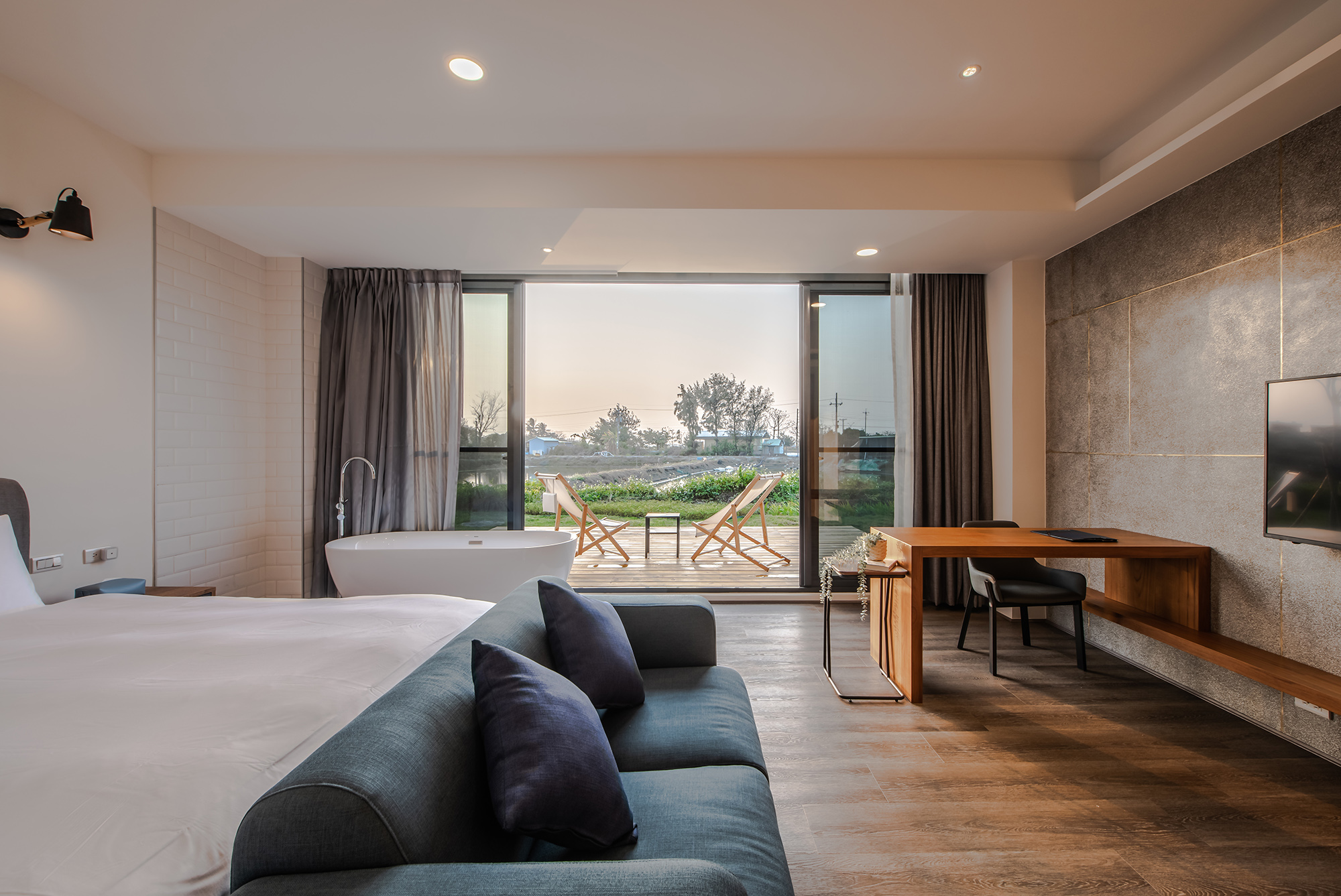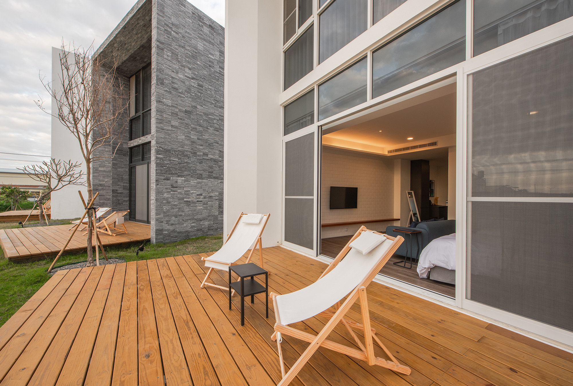 The interior design is minimalistic and neat with a comfortable light color palette. Travelers can enjoy the landscape with friends and family accompanied. Ingeniously applying all kinds of organic textures, the designer creates a multilayered vacation experience. The living room with wooden terrace and deck chair urges one to take a sunbath here with a small nap. The wooden vein of the gray flooring ensures the echo of nature in achromatic color palette.