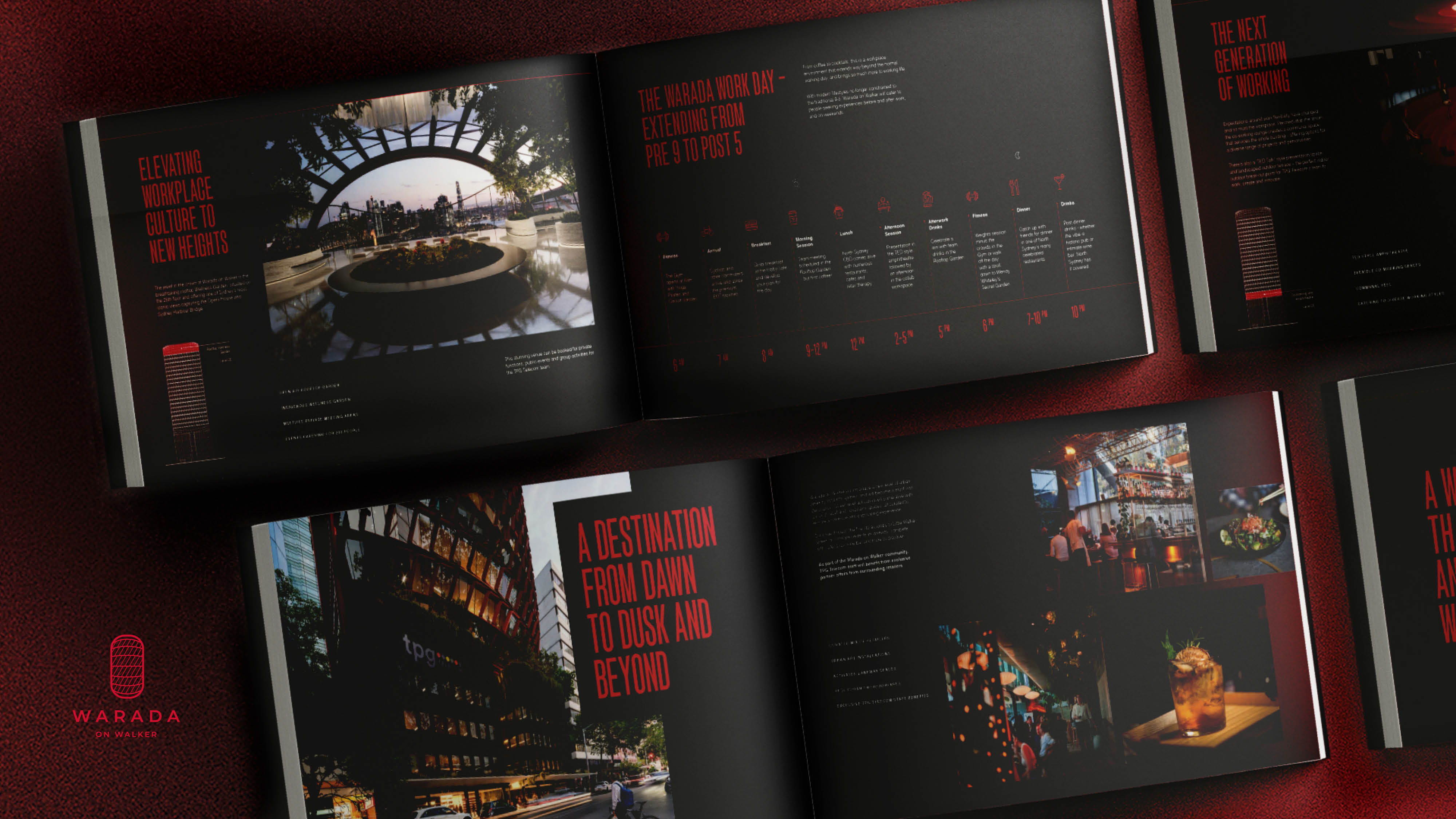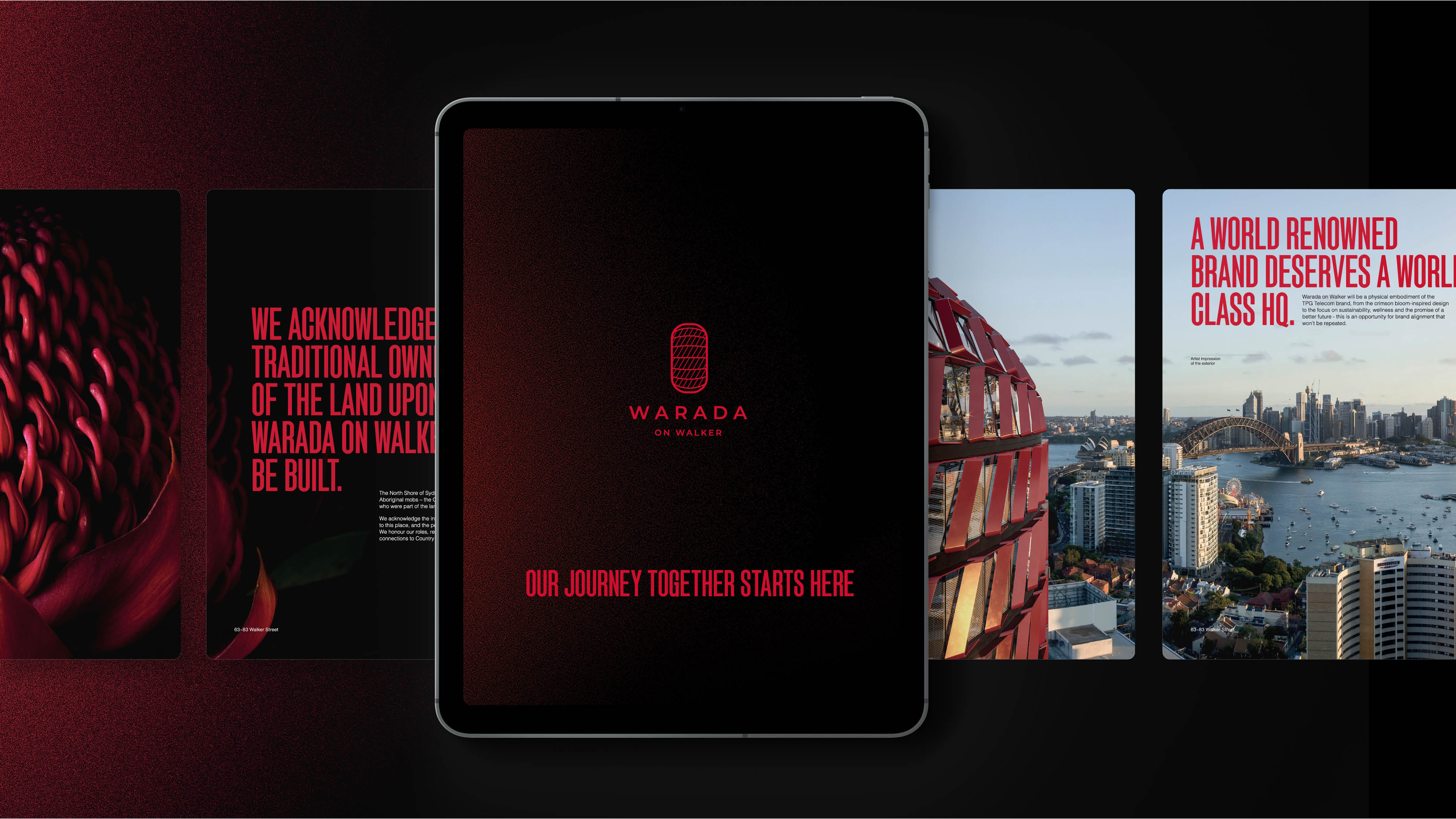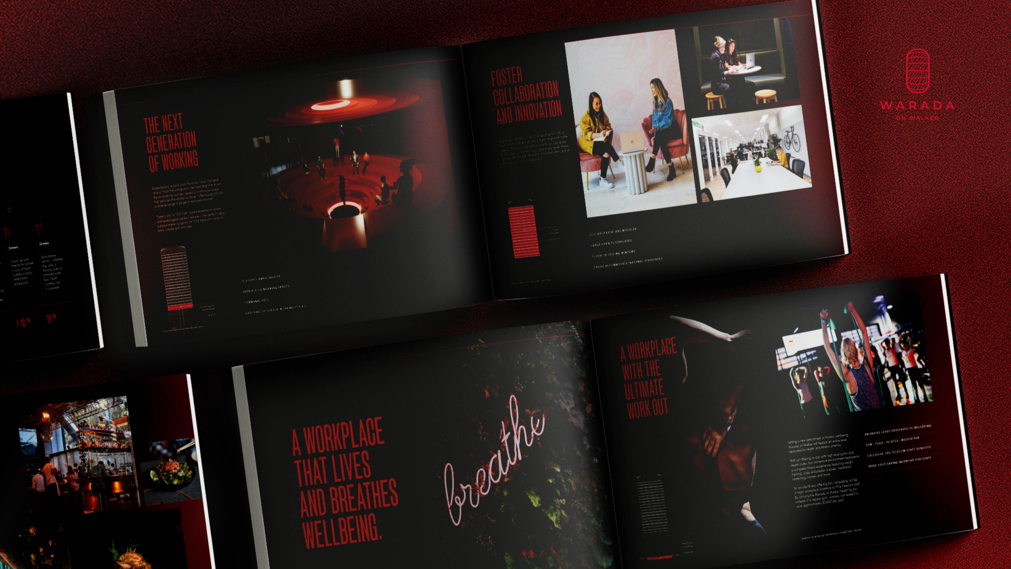 The commercial property landscape is traditionally seen as a ‘safe space’. Post-pandemic, workplaces have evolved, and hybrid workforces are the new norm. Warada on Walker represents the next generation of workplaces designed around the lifestyle aspirations of today’s workforce. Our challenge was to show this evolution and position Warada as more than an office - it's a place for work, play, health and wellbeing. A sharp contrasting palette draws directly from the building’s material palette. Leaning into the gritty sentiments left lingering from the pandemic and bushfires, the brand is moody with large swathes of textural black and red gradients, and saturated photography. A striking red, the colour of strength and power, breaks through the black via large, condensed fonts, representing resilience, optimism and the vision of a workplace for the future. Beyond the graphic language, this tension is carried through to our written language. Bold, confident copy centres on the idea of regeneration and evolution. It underpins the brand, showcasing Warada’s world-class credentials, including leading ESG initiatives, focus on health and wellbeing, tech innovations, forward-thinking approach to flexible workspace design and iconic Sydney harbour views.