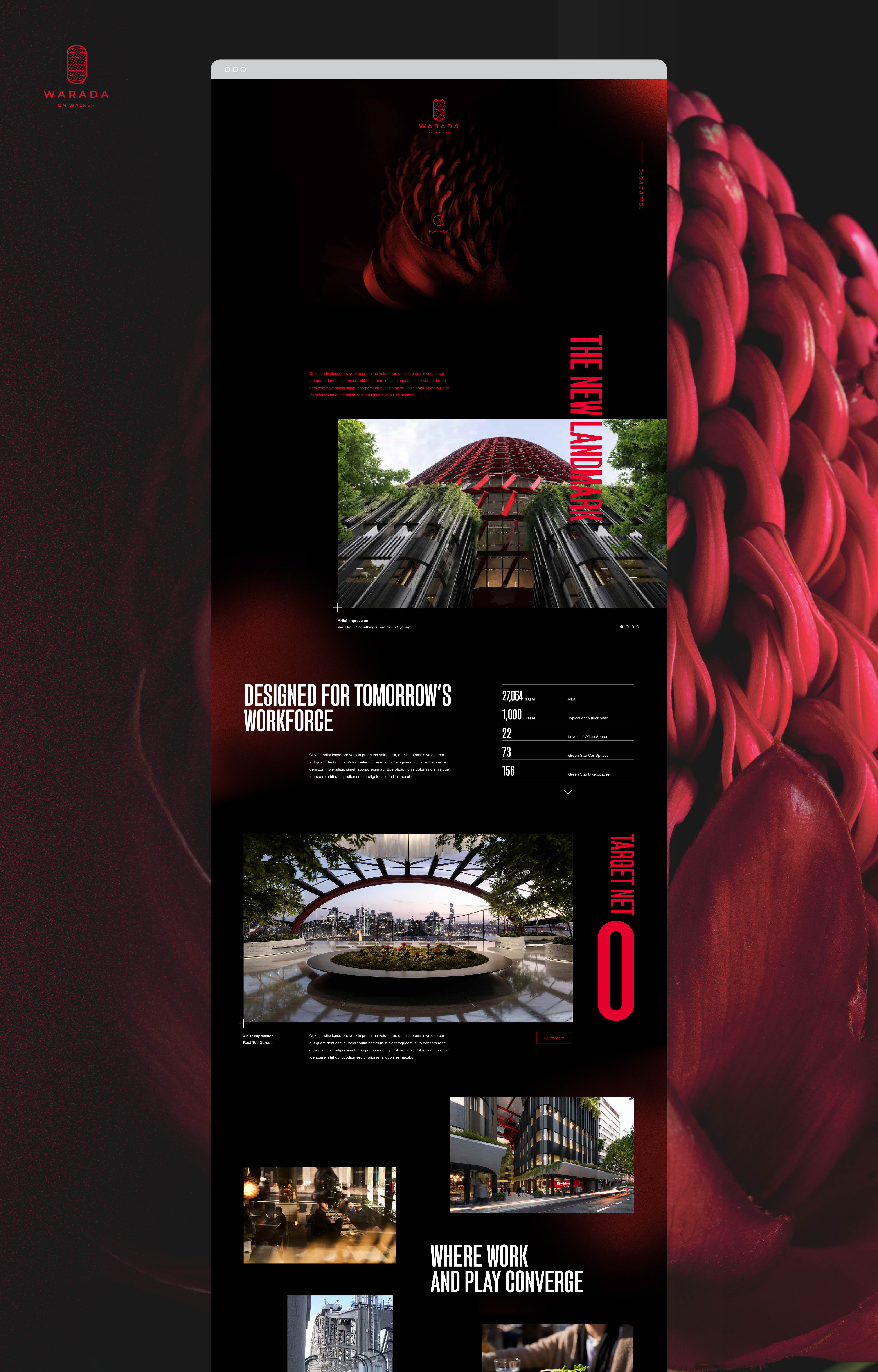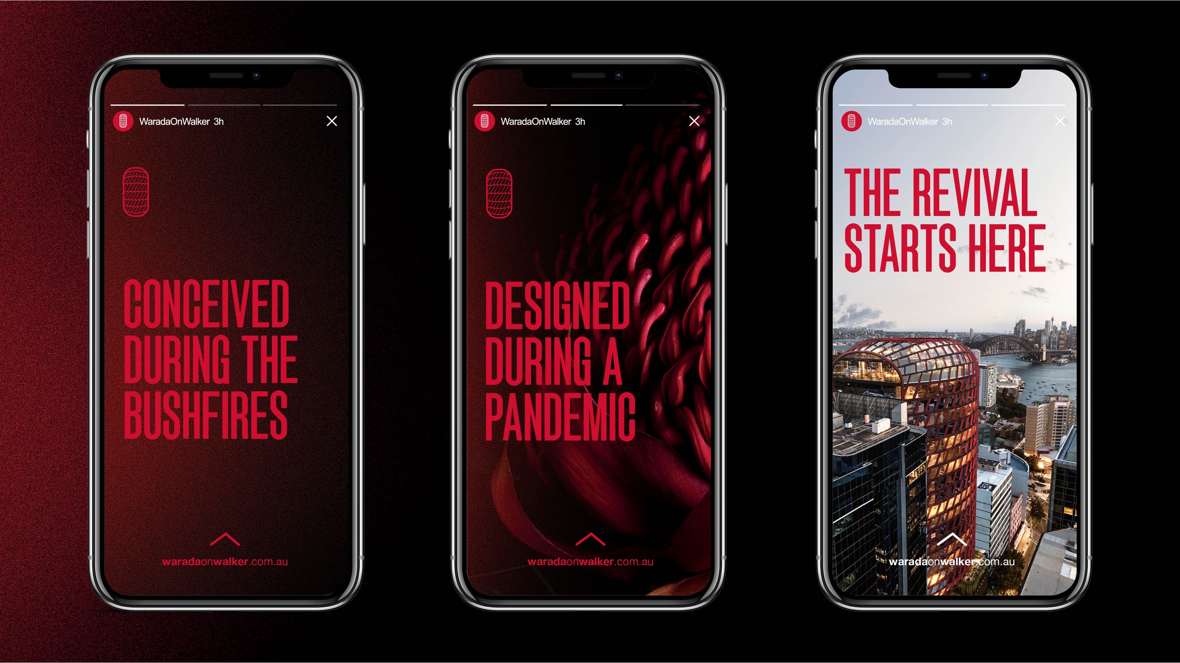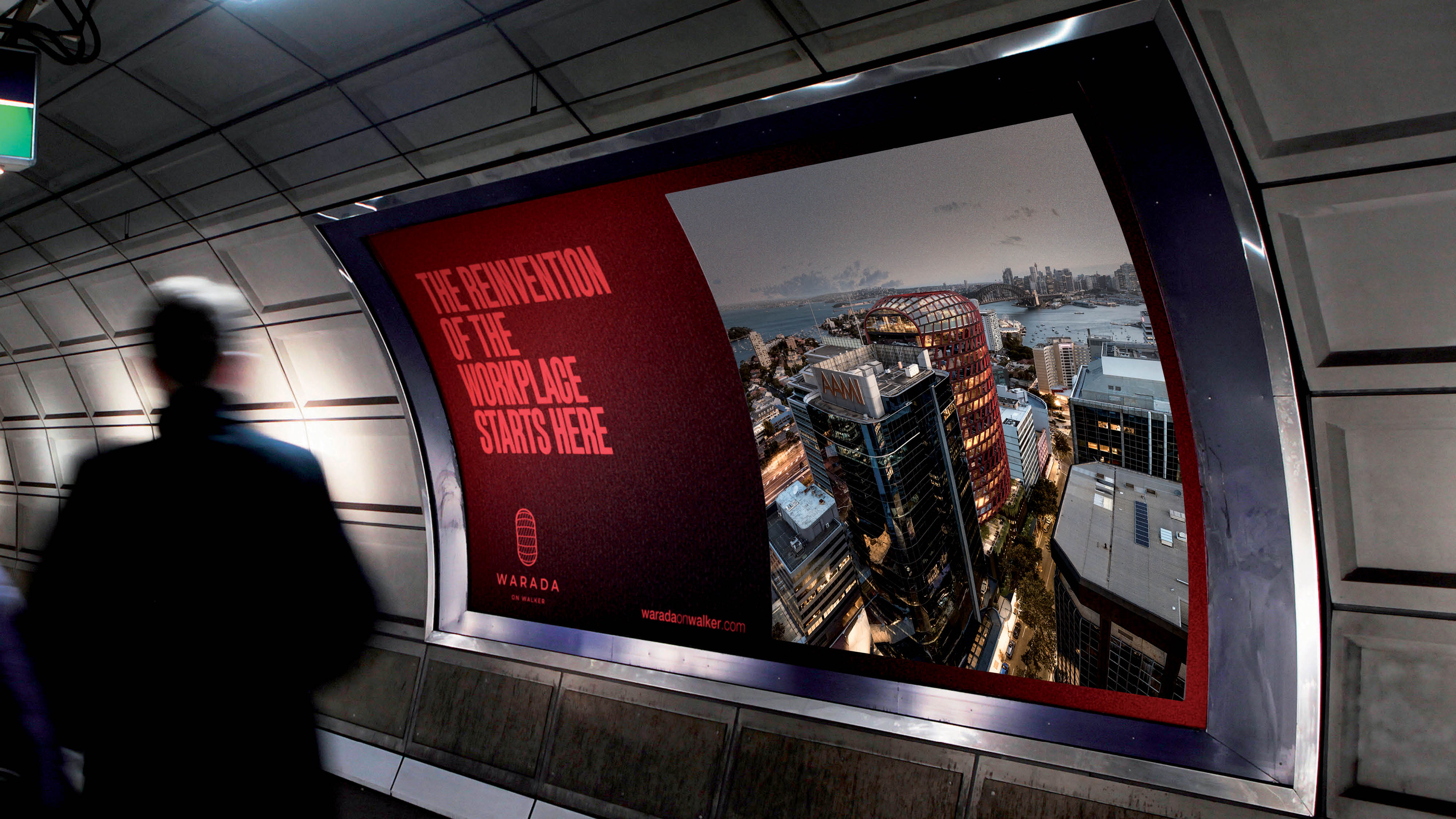 The commercial property landscape is traditionally seen as a ‘safe space’. Post-pandemic, workplaces have evolved, and hybrid workforces are the new norm. Warada on Walker represents the next generation of workplaces designed around the lifestyle aspirations of today’s workforce. Our challenge was to show this evolution and position Warada as more than an office - it's a place for work, play, health and wellbeing. A sharp contrasting palette draws directly from the building’s material palette. Leaning into the gritty sentiments left lingering from the pandemic and bushfires, the brand is moody with large swathes of textural black and red gradients, and saturated photography. A striking red, the colour of strength and power, breaks through the black via large, condensed fonts, representing resilience, optimism and the vision of a workplace for the future. Beyond the graphic language, this tension is carried through to our written language. Bold, confident copy centres on the idea of regeneration and evolution. It underpins the brand, showcasing Warada’s world-class credentials, including leading ESG initiatives, focus on health and wellbeing, tech innovations, forward-thinking approach to flexible workspace design and iconic Sydney harbour views.